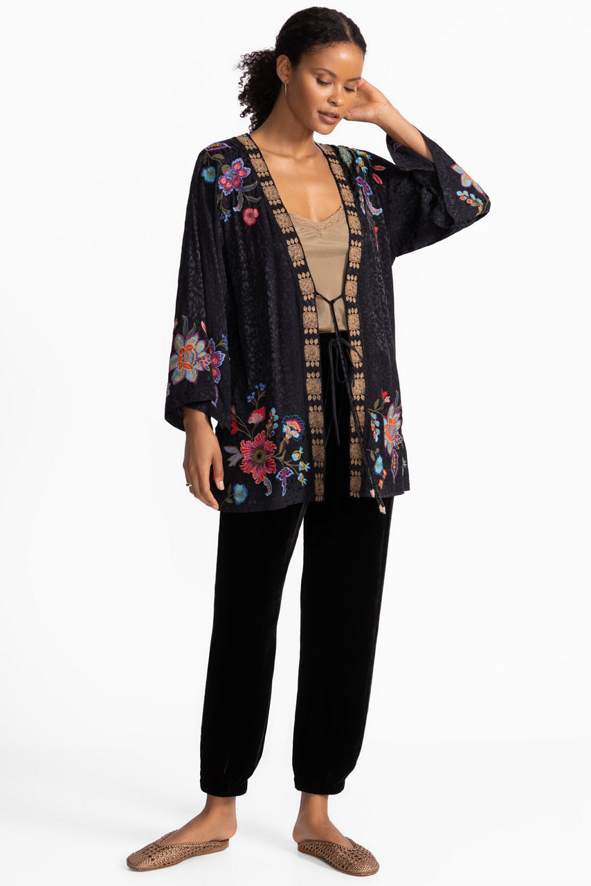 Designed with a rich green backdrop adorned with bold floral accents, the Front Tie Kimono is a vibrant layering piece. Featuring a front tie closure with decorative beaded tassels, this lightweight kimono is finished with intricate embroidered detailing. Layer over a wide-leg jumpsuit and pair with bold jewelry pieces for an eclectic look.