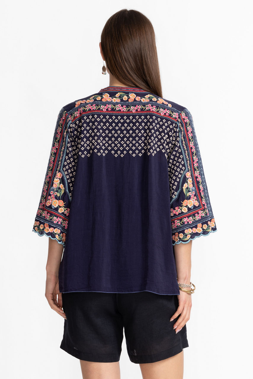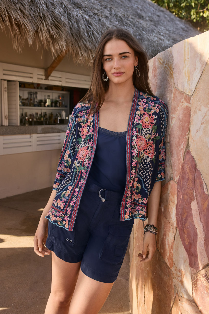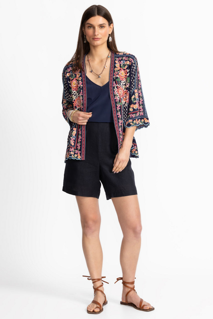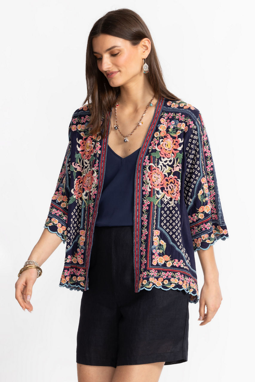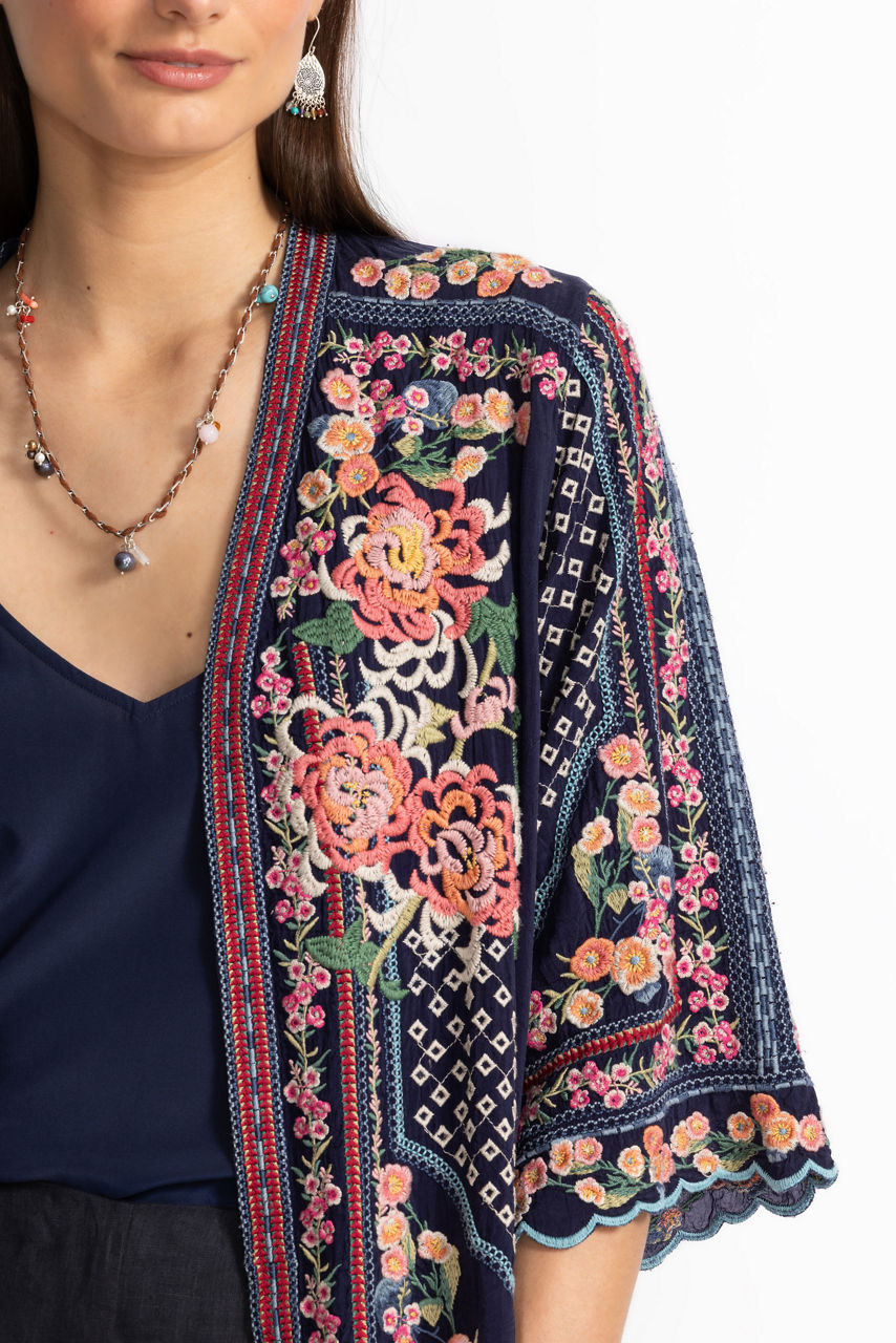 Intricately embellished with eye-catching embroidered details, the Fuji Kimono adds a hint of elegance to any look. Featuring an open front with a scalloped trim and 3/4 sleeves, this flowing kimono is adorned with brilliant splashes of color. Layer over relaxed denim and a silk cami for a polished casual look.