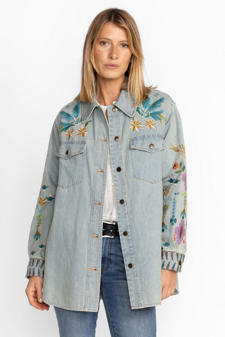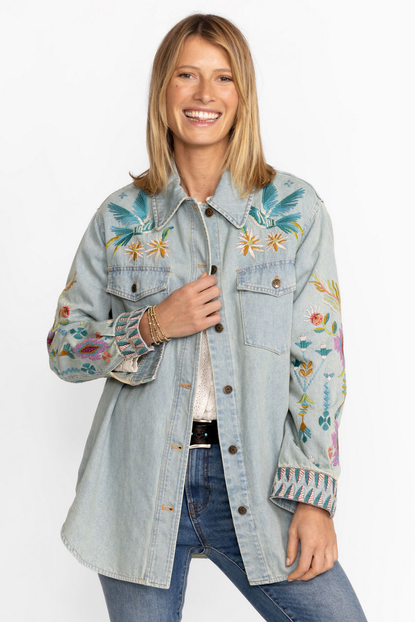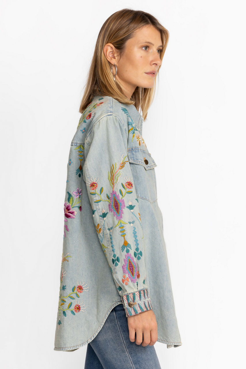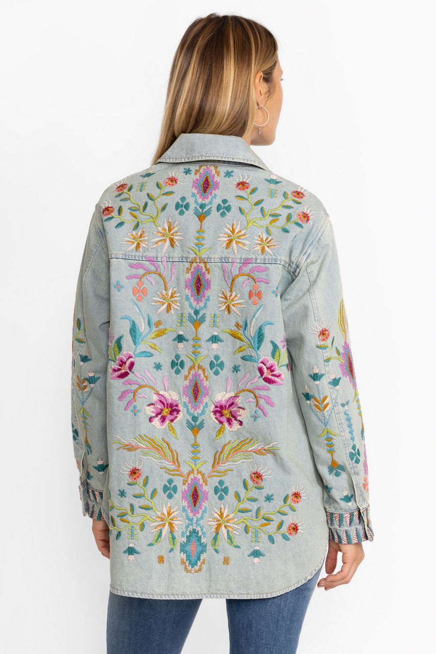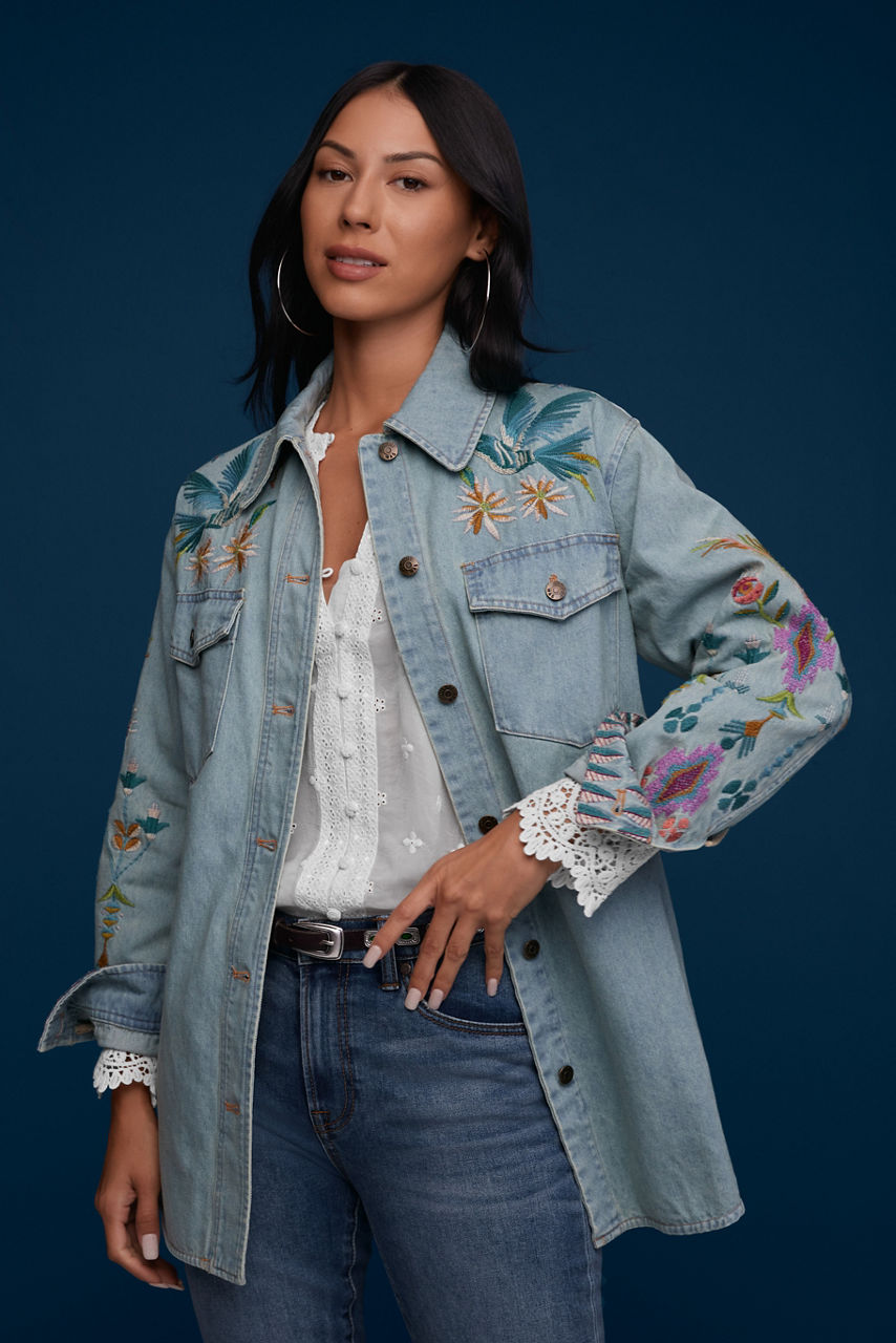 Delivering uncommon style and vibrant color, the Gabriella Denim Oversized Jacket Shirt is a chic statement piece. Crafted from 100% cotton and beautifully adorned with vibrant floral embroidery, this easy-care denim shirt is sure to stand out in a crowd. Layer over a cozy pullover and leggings for a perfectly casual weekend look.