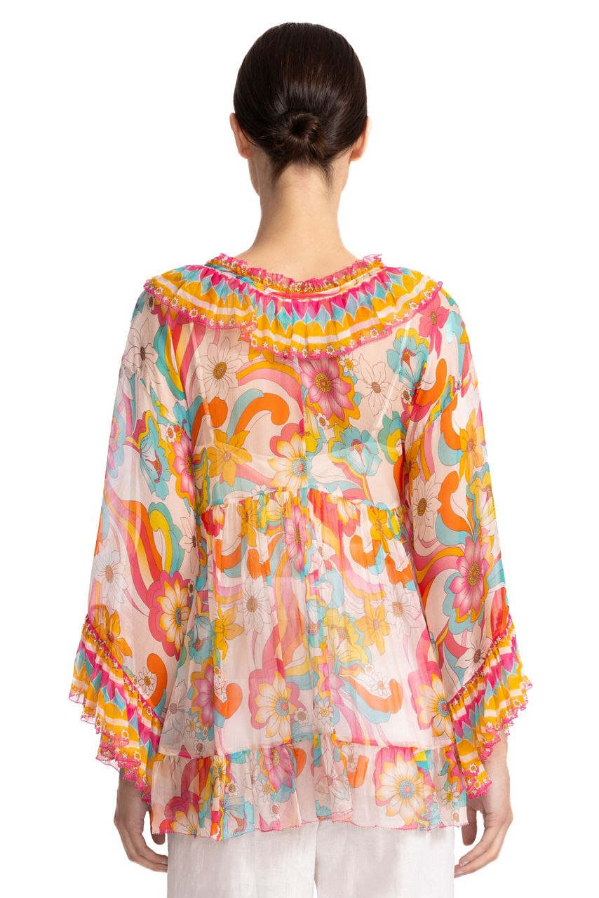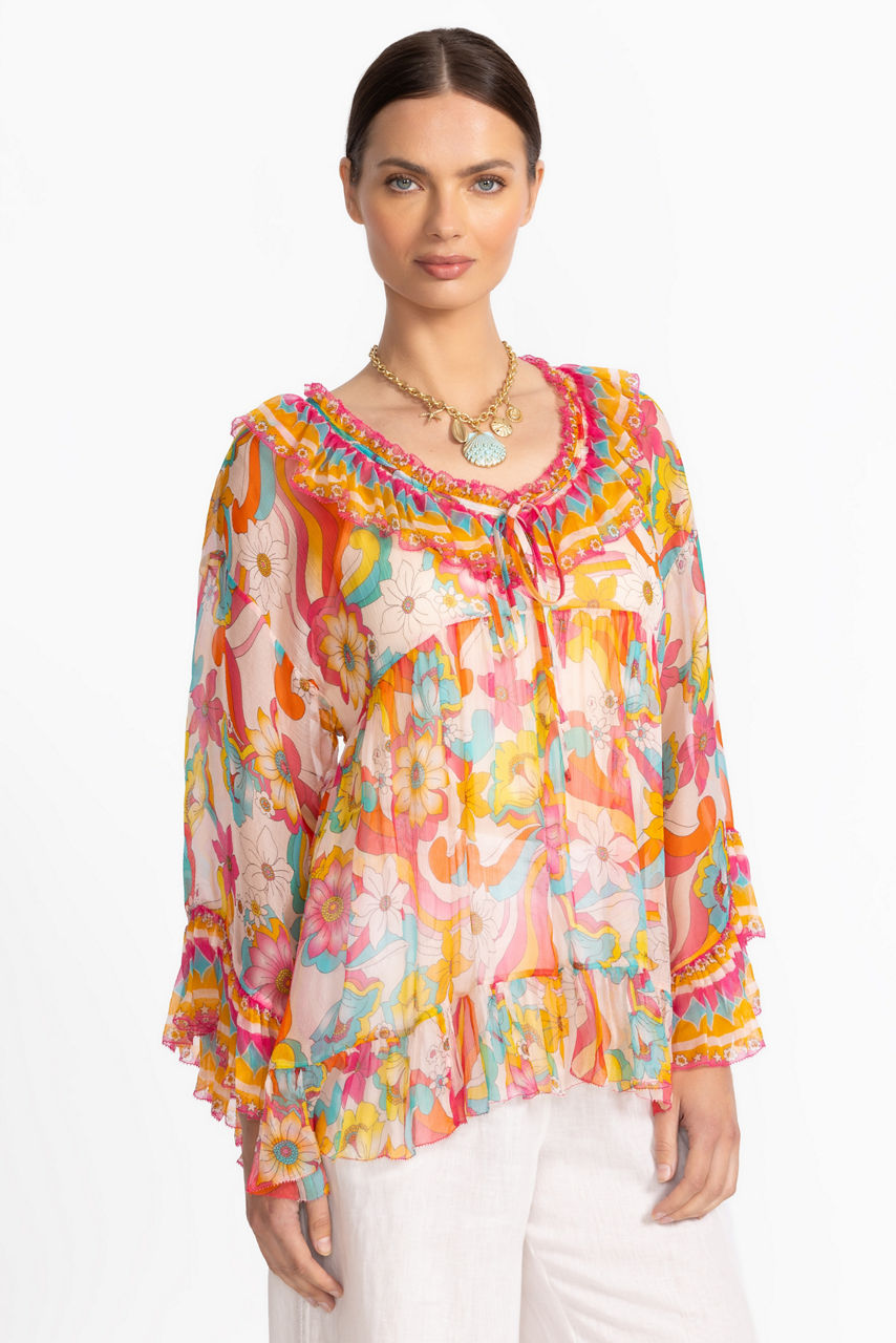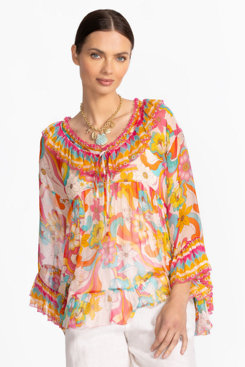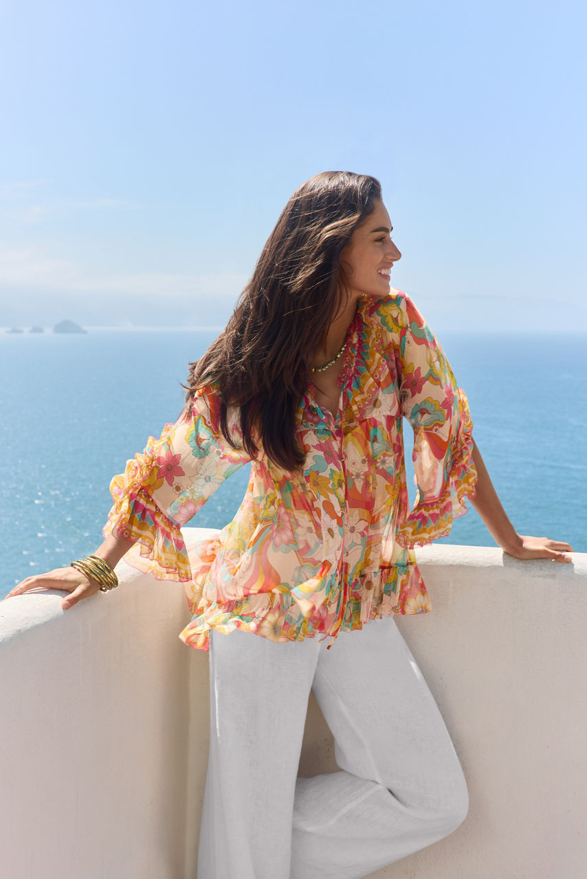 Adorned with a vintage-inspired print, the Gal Ruffle Tie Blouse is imbued with vibrant color. Crafted from 100% silk, this slip-lined blouse features a split V-neckline bordered with ruffle detailing and is finished with gathers throughout the body. Pair with a fitted skirt and coordinating sandals for a polished casual ensemble.