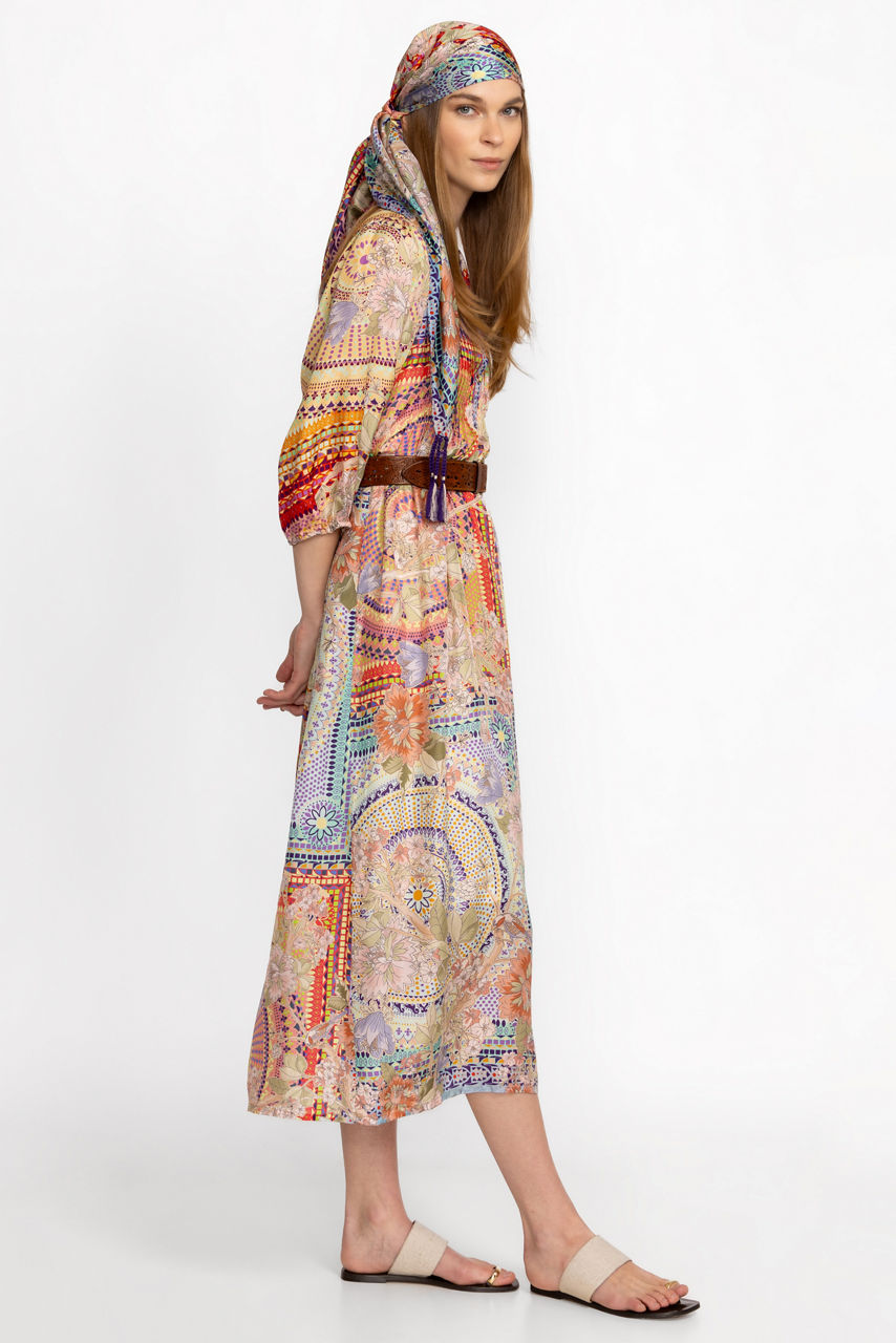 Crafted from 100% sumptuous silk, this Silk Scarf offers vibrant color and bold patterns. Visually split into four vivid quadrants of color this beautiful scarf easily elevates any look. Style knotted at the neck or wrapped at the handle of your favorite handbag for a splash of bold color.