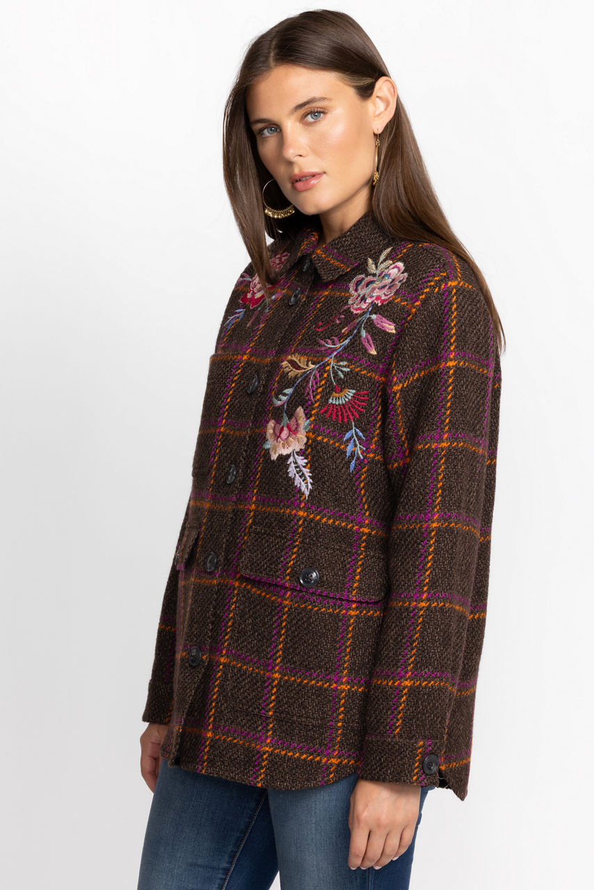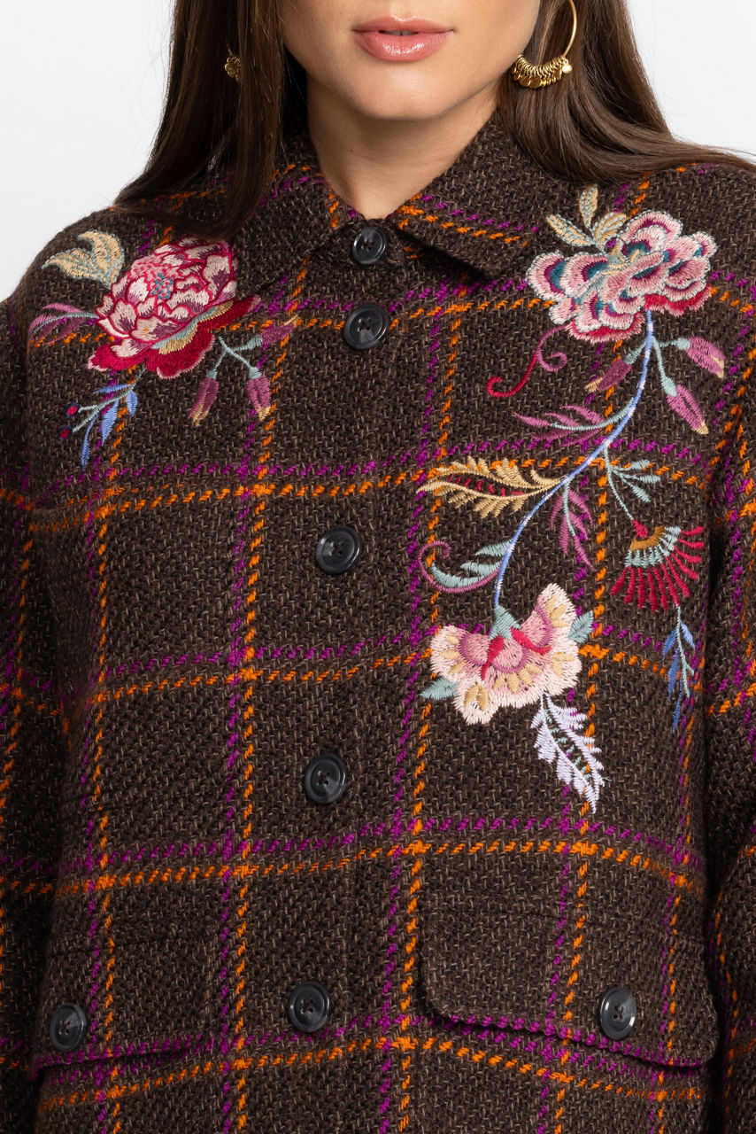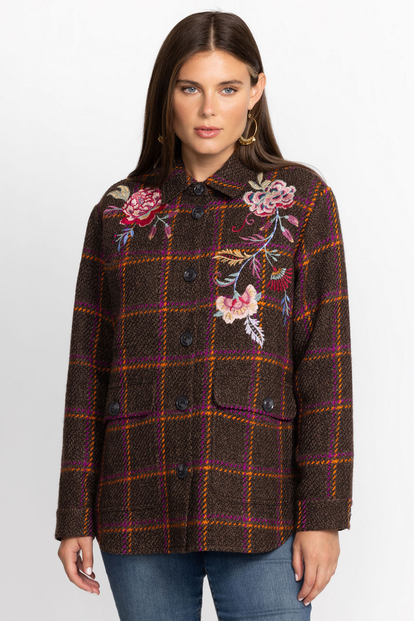 Crafted from a warm virgin wool mix, the Garnet Plaid Shirt Jacket is an unexpected clash of color and pattern. Perfect for transeasonal weather, this jacket features an all-over plain pattern, a collar, a front button closure, long sleeves, front patch pockets, and a detailed floral placement embroidery in saturated tones. Style this jacket with a tee and jeans for a stylish wear-anywhere outfit.