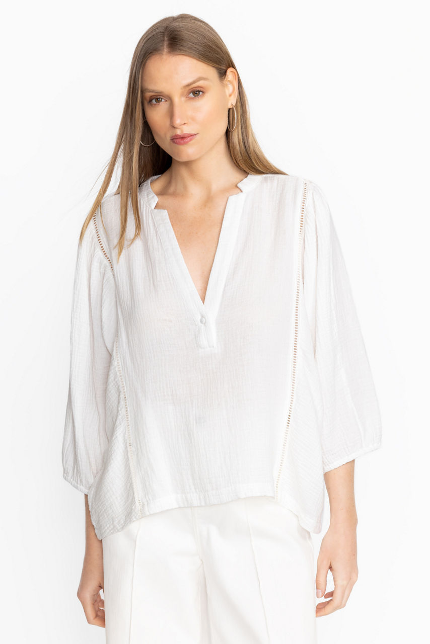 Light and airy, the Gauze Bishop Sleeve Blouse is crafted from 100% breathable cotton. Featuring a split V-neckline and gently puffed gathered sleeves finished with elastic banding, this breezy top offers princess seams at the front for a defined silhouette. Pair with relaxed denim and fashion sneakers for a versatile daily look.