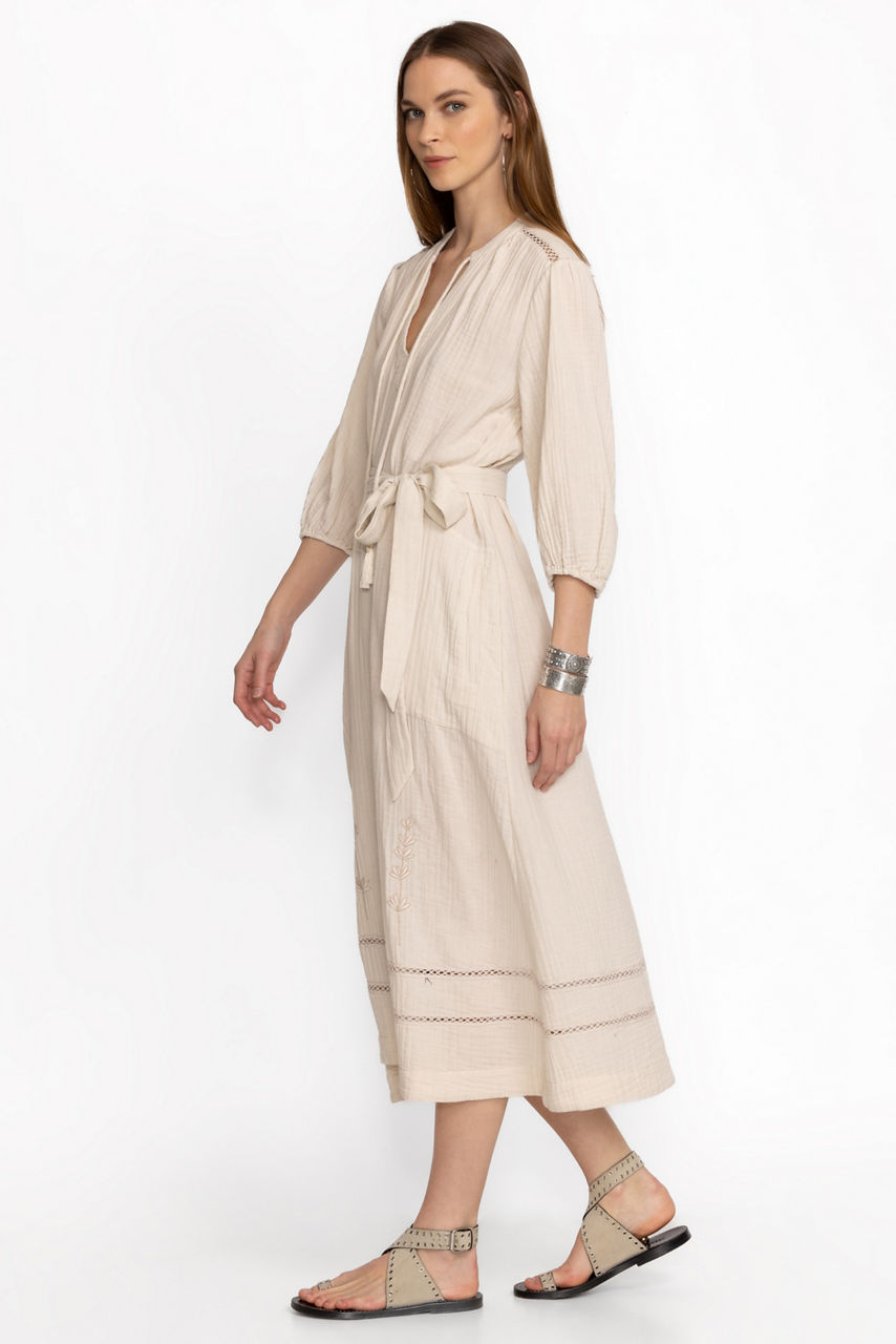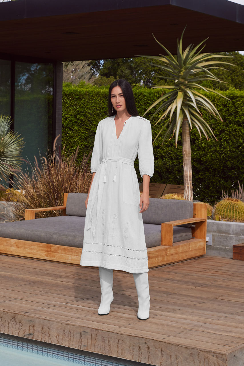 Crafted from 100% cotton, the Gauze Bishop Sleeve Dress is lightweight and airy. Featuring a rounded neck with a decorative tasseled drawstring, this dress offers intricate placement embroidery and an easy waist-tie for a customizable fit. Style with leather sandals and a bold colored bag for a resort-ready ensemble.