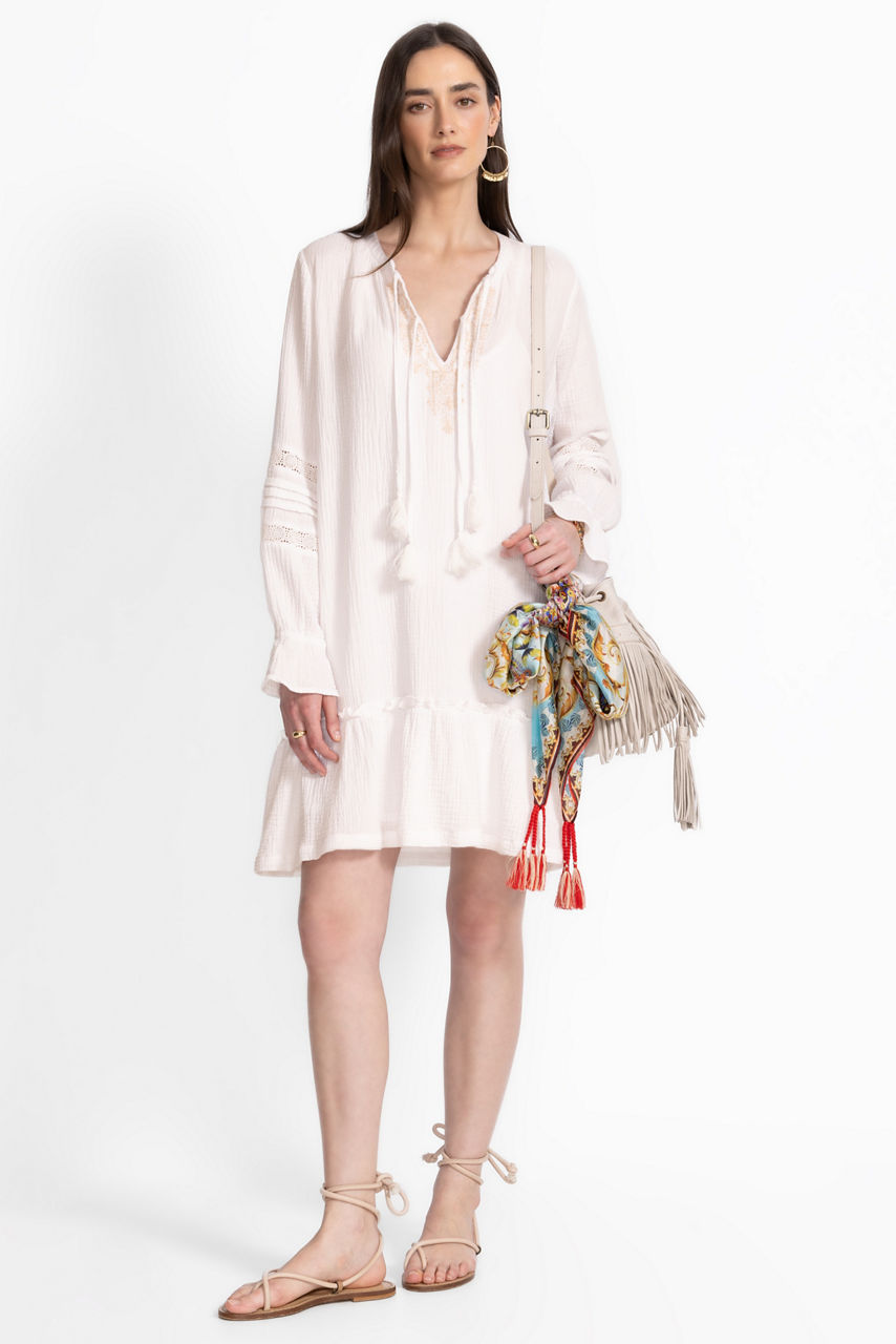 Impeccably crafted with 100% breezy cotton, the Ghenar Gauze Ruffle Tier Mini Dress is embellished with intricate tone-on-tone embroidered details. Designed with a split V-neckline and ties with tassels, this stunning tiered mini dress is finished with elastic sleeve cuffs and side seam pockets. Pair with espadrille wedges and colorful jewelry pieces for a brilliant finished look.