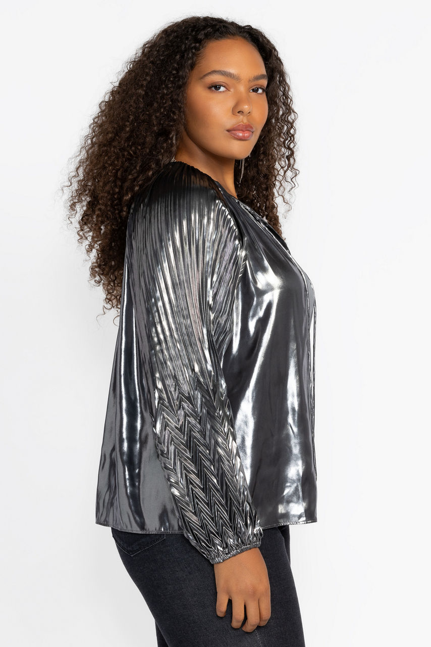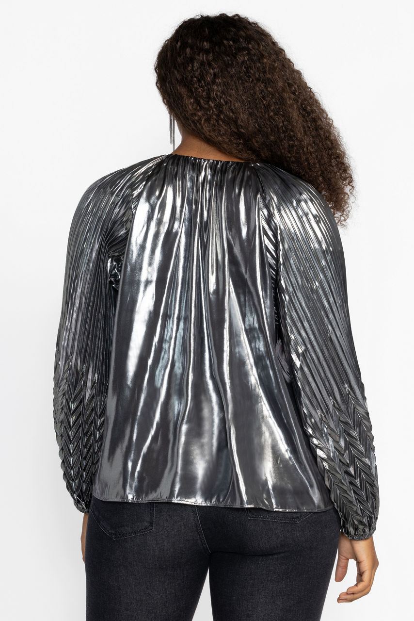 Crafted from a lightweight, breezy fabric, the Gemma Pleated Blouse creates an elegant feminine silhouette. Featuring a rounded neckline and raglan bishop sleeves, this relaxed-fit blouse is enhanced with sunburst and chevron pleats throughout. Pair with flowing palazzo pants and slide sandals for a breezy, resort-worthy look.