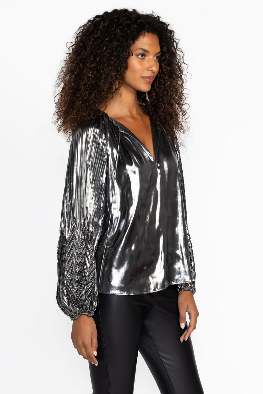 Crafted from a lightweight, breezy fabric, the Gemma Pleated Blouse creates an elegant feminine silhouette. Featuring a rounded neckline and raglan bishop sleeves, this relaxed-fit blouse is enhanced with sunburst and chevron pleats throughout. Pair with flowing palazzo pants and slide sandals for a breezy, resort-worthy look.