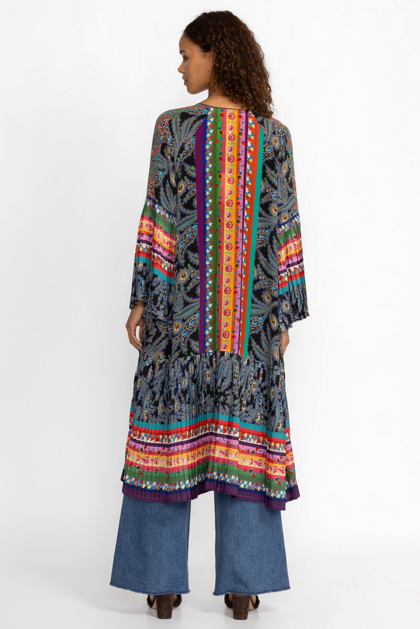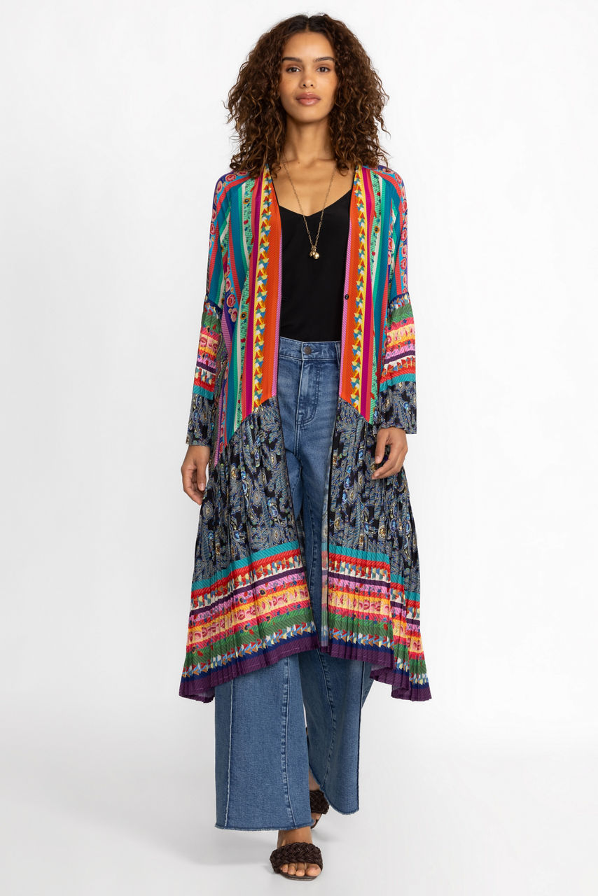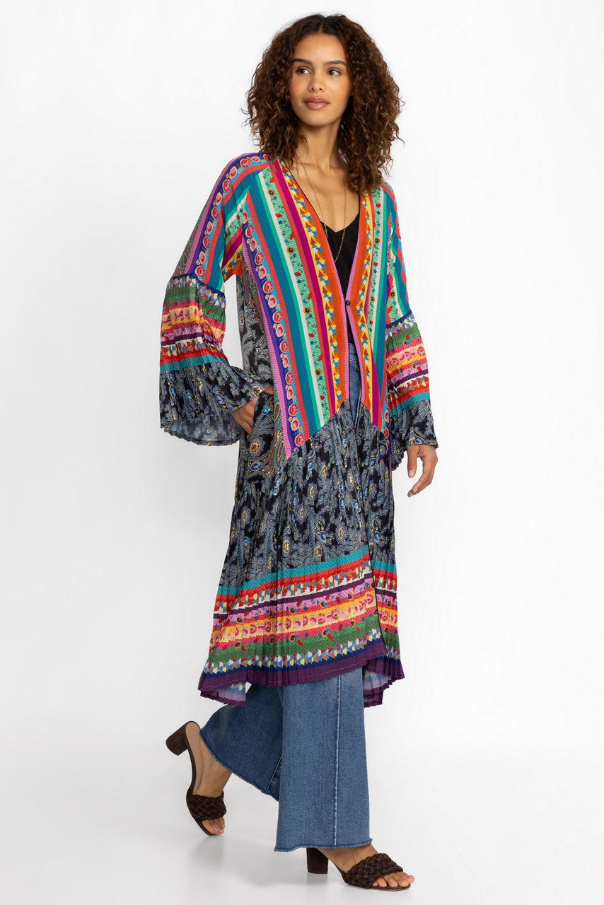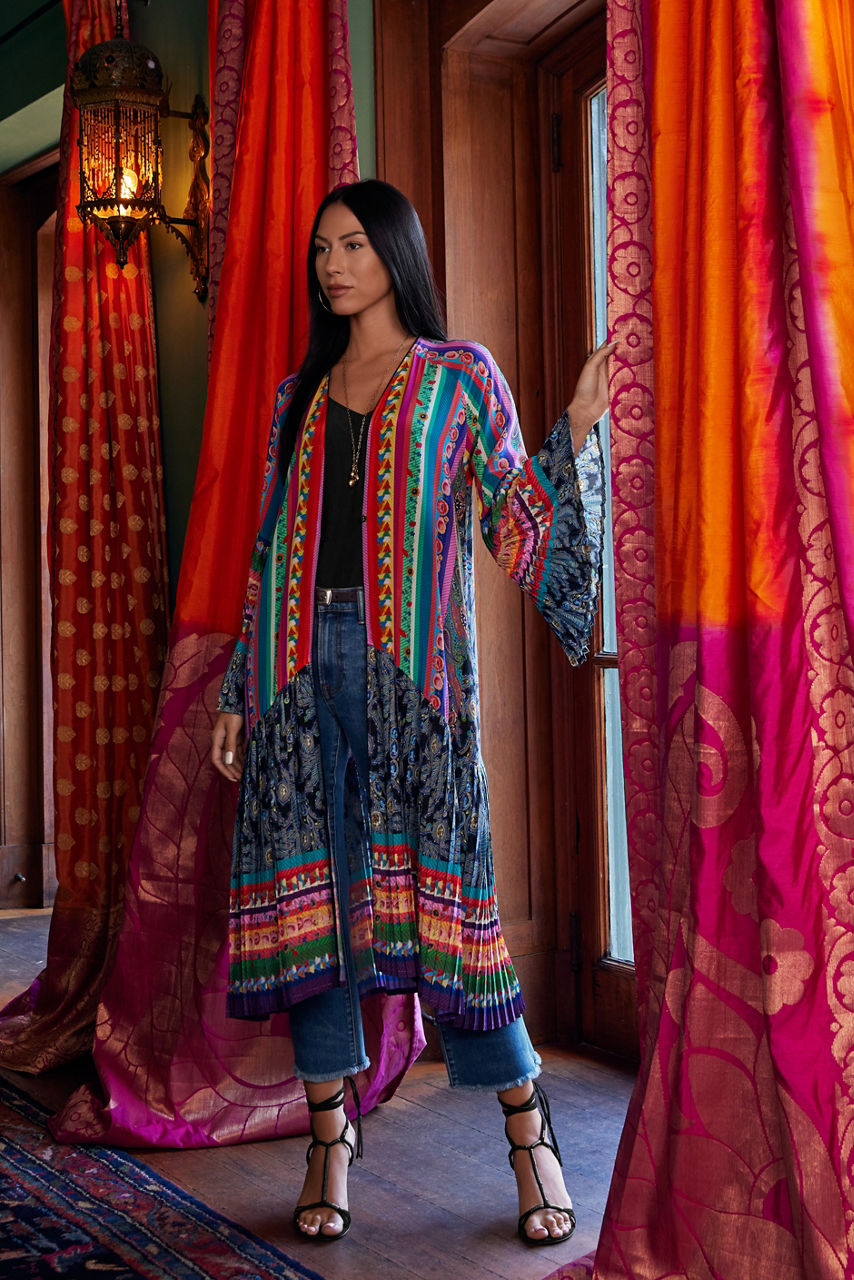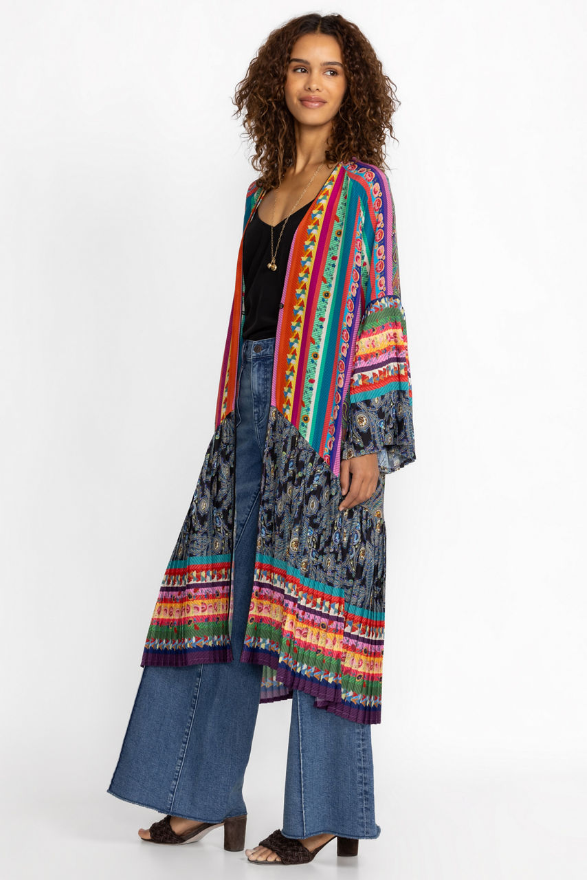 Defined with pleats, the Gemma Pleated Kimono delights with its striking color palette and intricate design details. This kimono is spun from lustrous silk and features fabric covered buttons, long sleeves, bold stripes, and open front. Keep this kimono as the main focus by pairing with minimal pieces and extras.