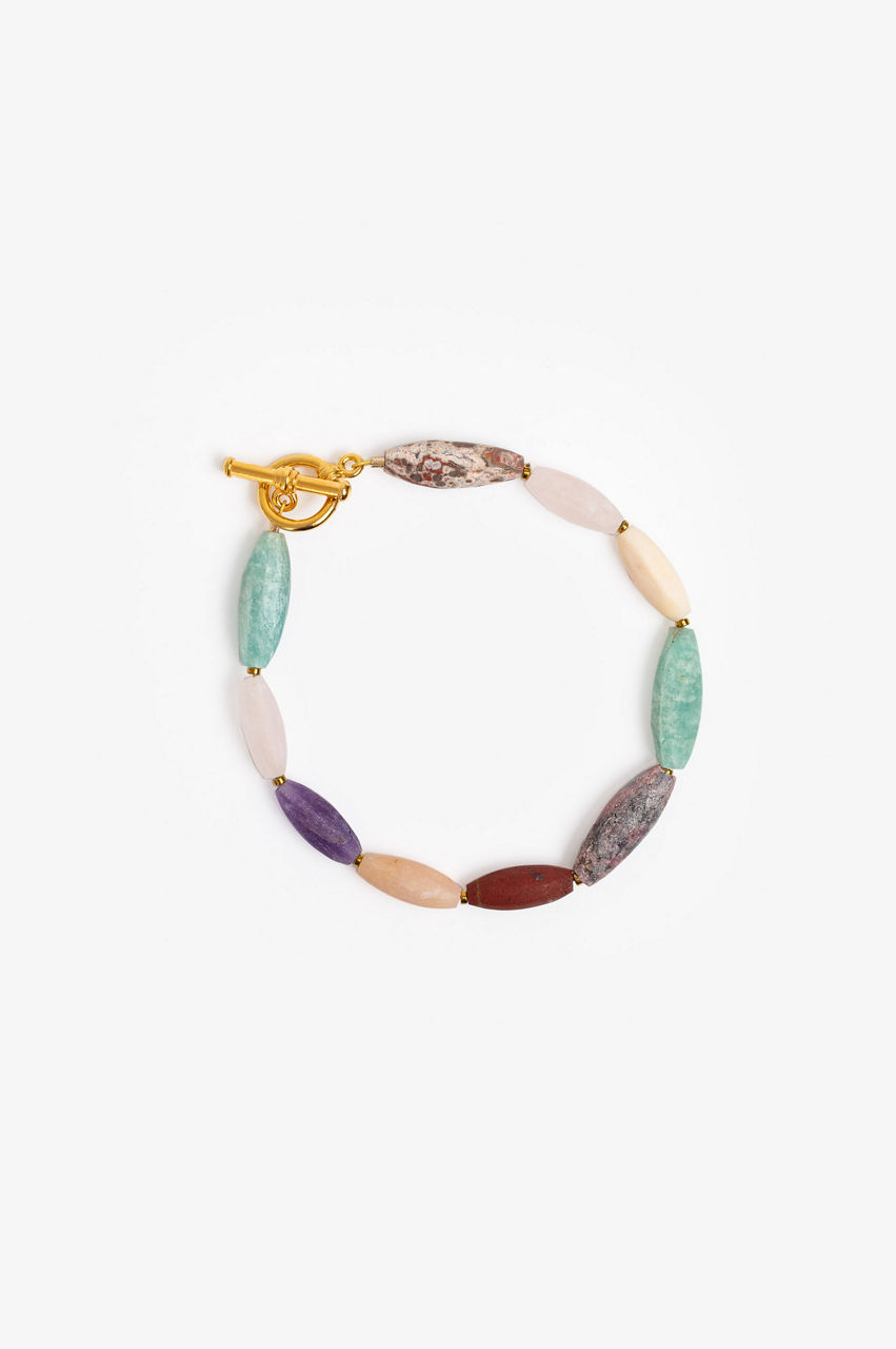 This delicate bracelet combines different gemstones for a stunning and colorful result. The elongated shape of the beads creates a slim profile for this piece, which makes it a great option if you like to stack jewelry. You can combine the Gemstone Beaded Bracelet with a chintz print to echo the different colors of the print.