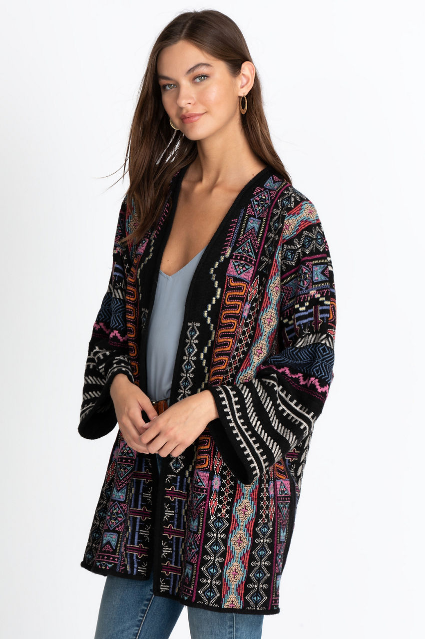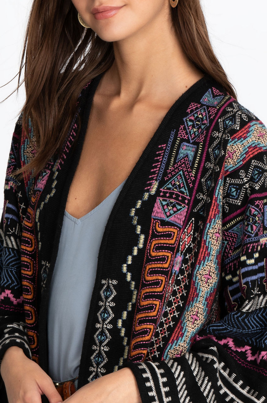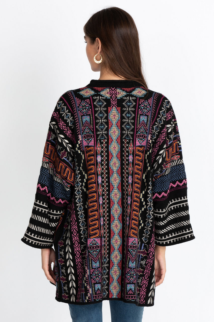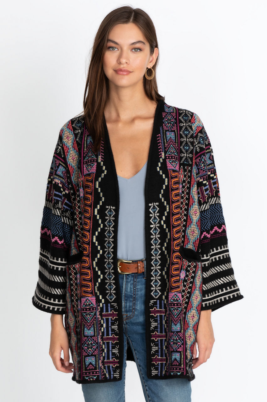 This black Gennie Kimono comes in tribal print and pockets. Featuring Johnny Was's signature design, it makes a statement that is impossible to ignore and a uniqueness that is hard to match. It s a loose and comfortable fit and great for the spring or summer seasons.
