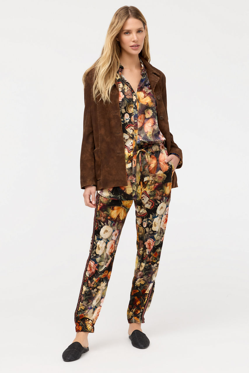 Crafted from a rich silk blend, the Teyros Genora Joggers are embellished with a timeless floral motif. Designed with an elastic waist and cuff, these unique pants are accented with embroidered contrasting and piping at the outseam and are finished with slip pockets at the front and patch pockets at the back. Pair with a black hoodie and fashion sneakers for a cozy weekend look.
