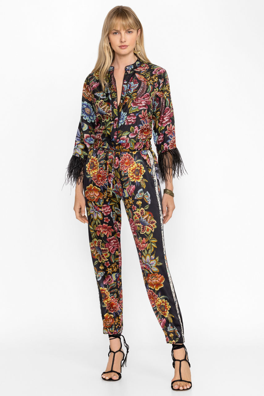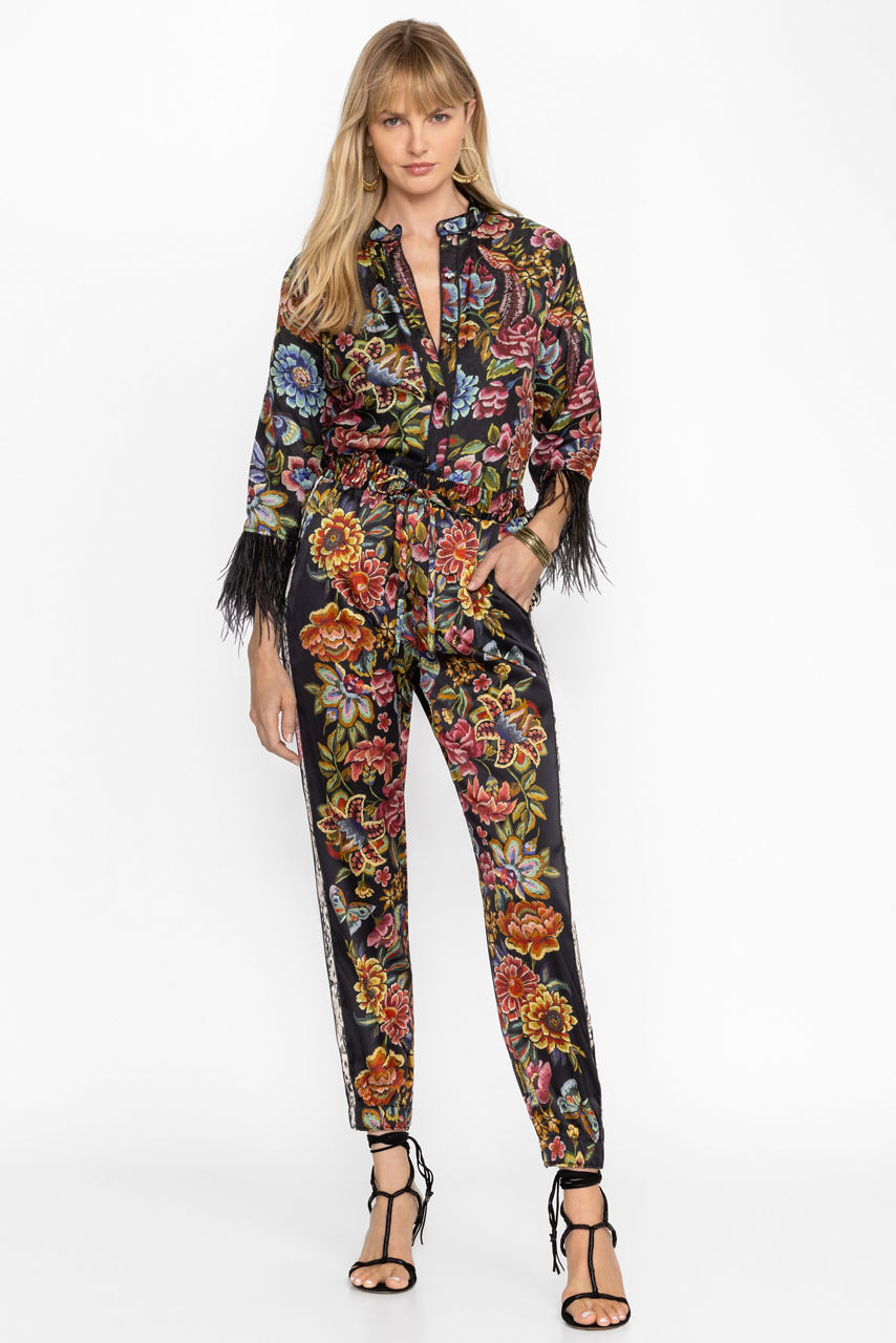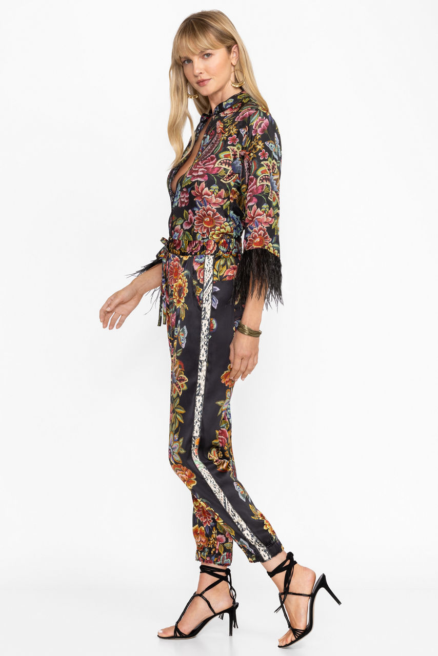 Crafted from a luxurious silk blend with a hint of stretch, the Genora Paneled Joggers perfectly combine casual comfort and elevated style. Featuring an elastic waist and cuffs at the ankles, these pants are embellished with an ornate eye-catching pattern and are finished with pockets at the front and back. Pair with a black silk cami and leather sandals for a trendy night out look.