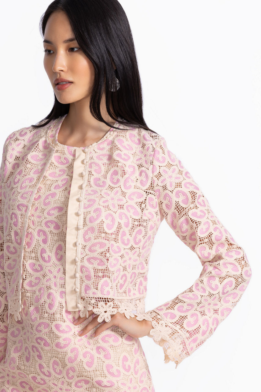 Beautifully crafted with impeccable attention to detail, the Genovia Cropped Jacket offers a traditional silhouette with a fresh modern twist. Designed with a rounded collar and button front, this classic cropped cotton blend jacket features a crocheted body and scalloped lace trim at the neck and hemline. Layer over an ivory cami and pair pale pink trousers for a polished daytime look.