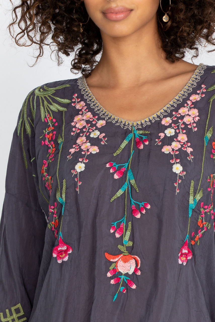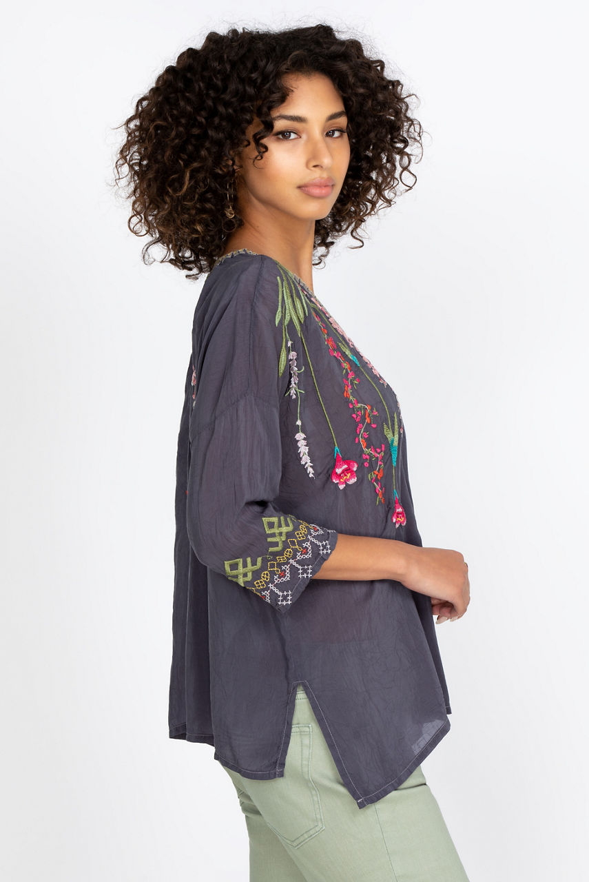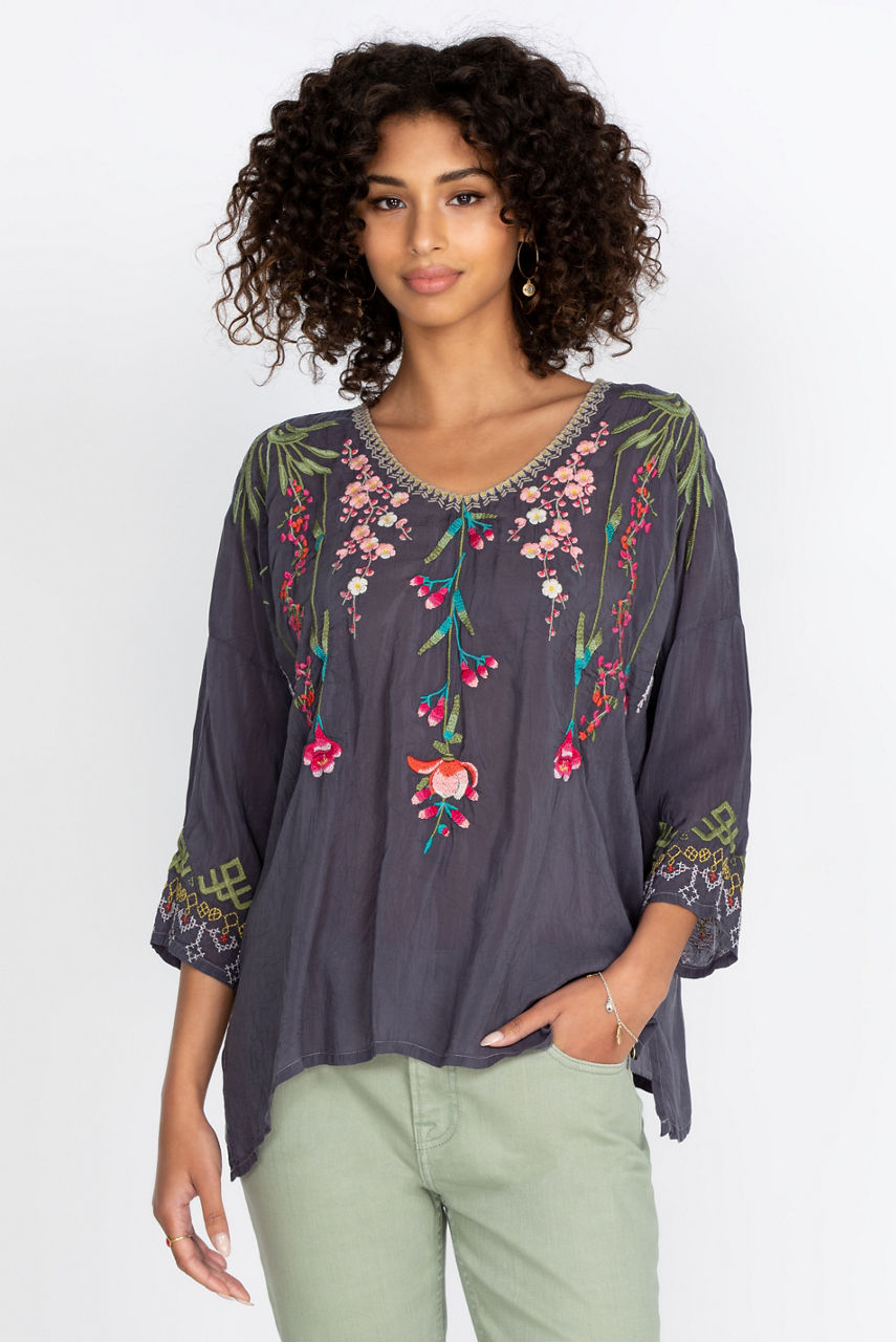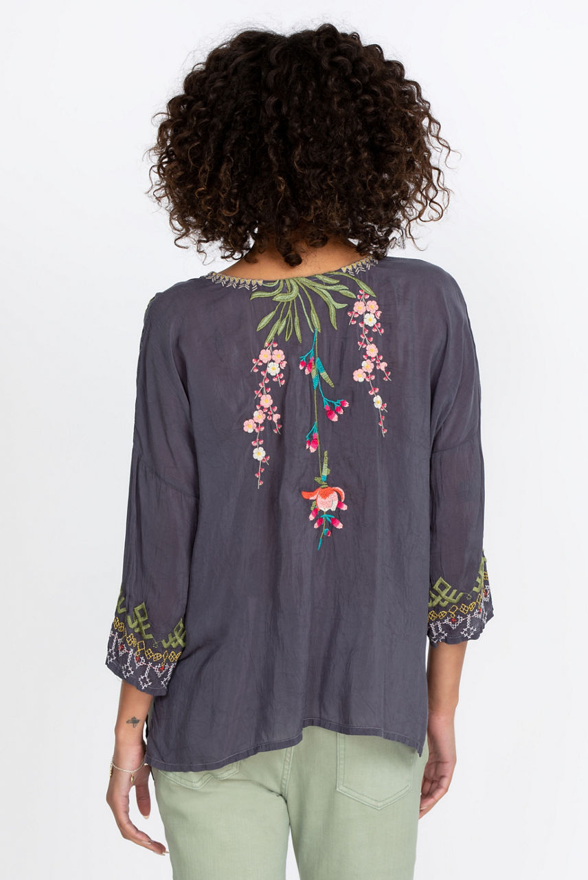 With its loose fit and flowy silhouette, the Gia Blouse will instantly create a laidback yet sophisticated look. The vertical flower motifs and geometrical details on the collar and three-quarter sleeves embellish this top for a retro-inspired feel. Emphasize the vertical floral motifs by layering with a few necklaces and try pairing this popover blouse with skinny jeans to contrast different shapes.