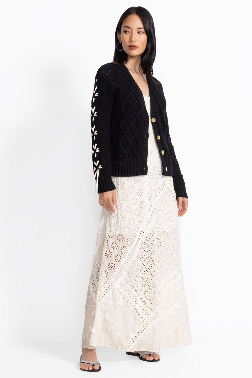 Crafted from a lightweight cotton blend, the Gigi Maxi Dress is a modern take on a classic slip dress. Designed with spaghetti straps and a V-neckline, this bias cut maxi dress is embellished with contrasting eyelet fabric arranged in geometric patterns for an eye-catching look. Pair with simple flats and dainty gold jewelry for a fresh evening look.