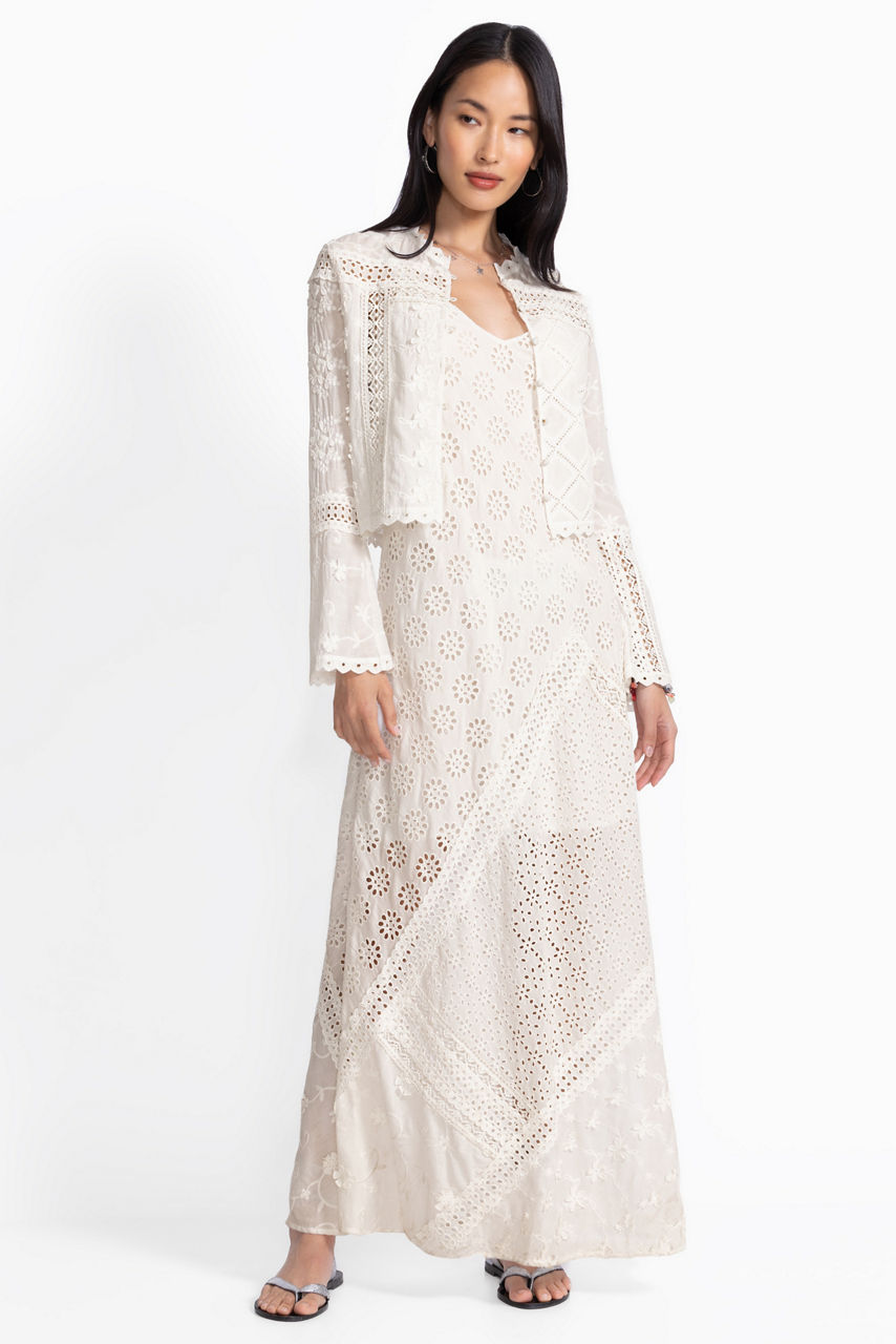 Crafted from a lightweight cotton blend, the Gigi Maxi Dress is a modern take on a classic slip dress. Designed with spaghetti straps and a V-neckline, this bias cut maxi dress is embellished with contrasting eyelet fabric arranged in geometric patterns for an eye-catching look. Pair with simple flats and dainty gold jewelry for a fresh evening look.