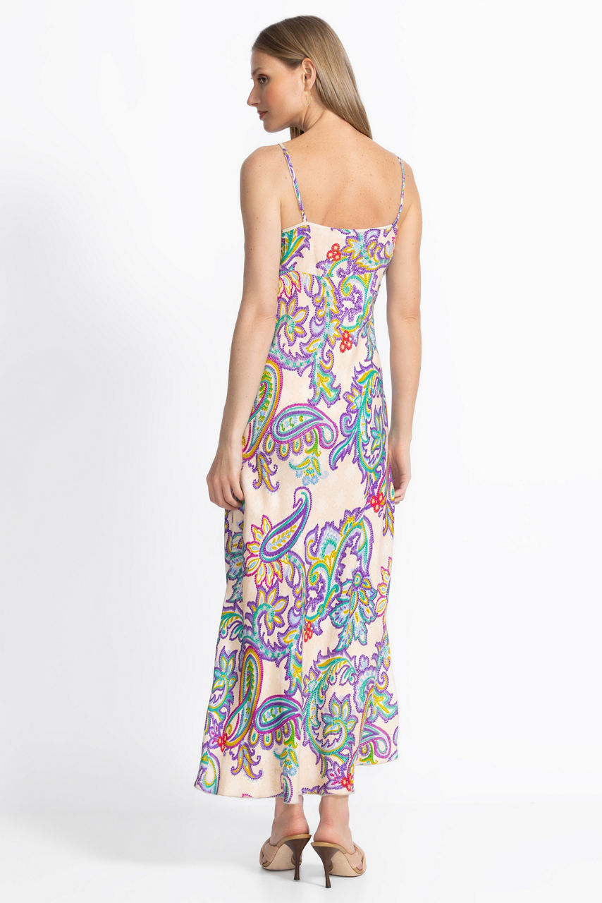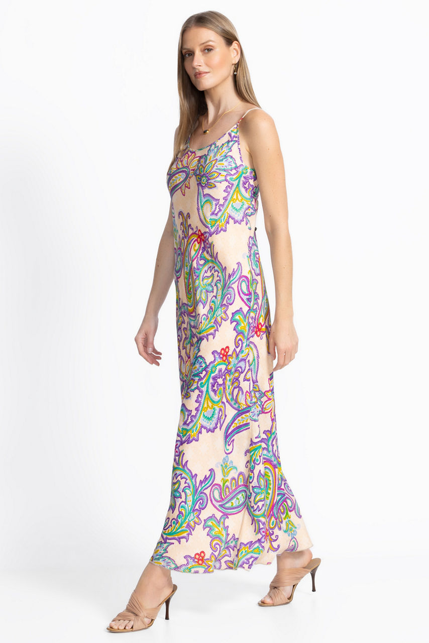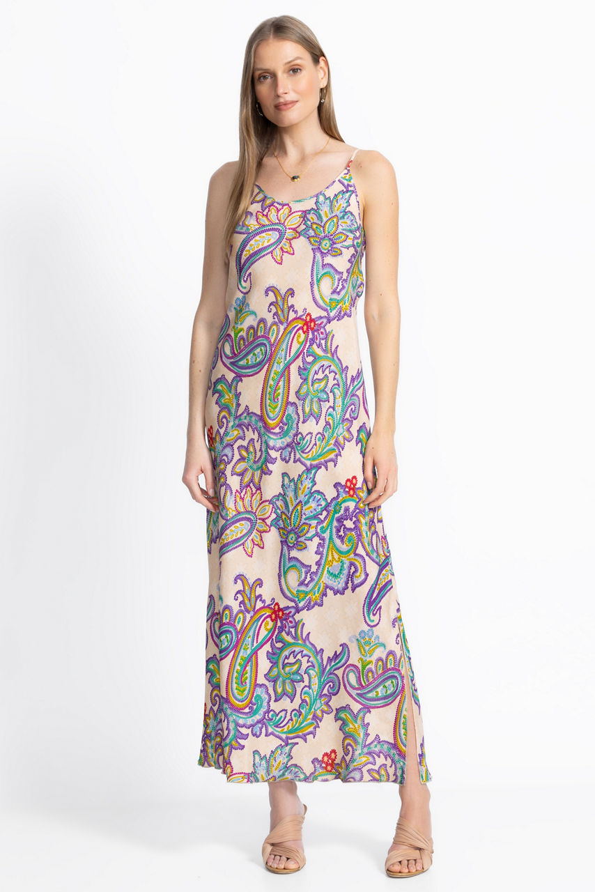 Beautifully embellished with a bold paisley pattern in hues of green and purple, the Gigianna Slip Dress creates an air of sophistication. Featuring a scoop neckline and adjustable spaghetti straps, this vibrant dress is finished with a bias cut for an elegant drape. Pair with neutral sandals and bold eclectic jewelry for a vacation-inspired look.