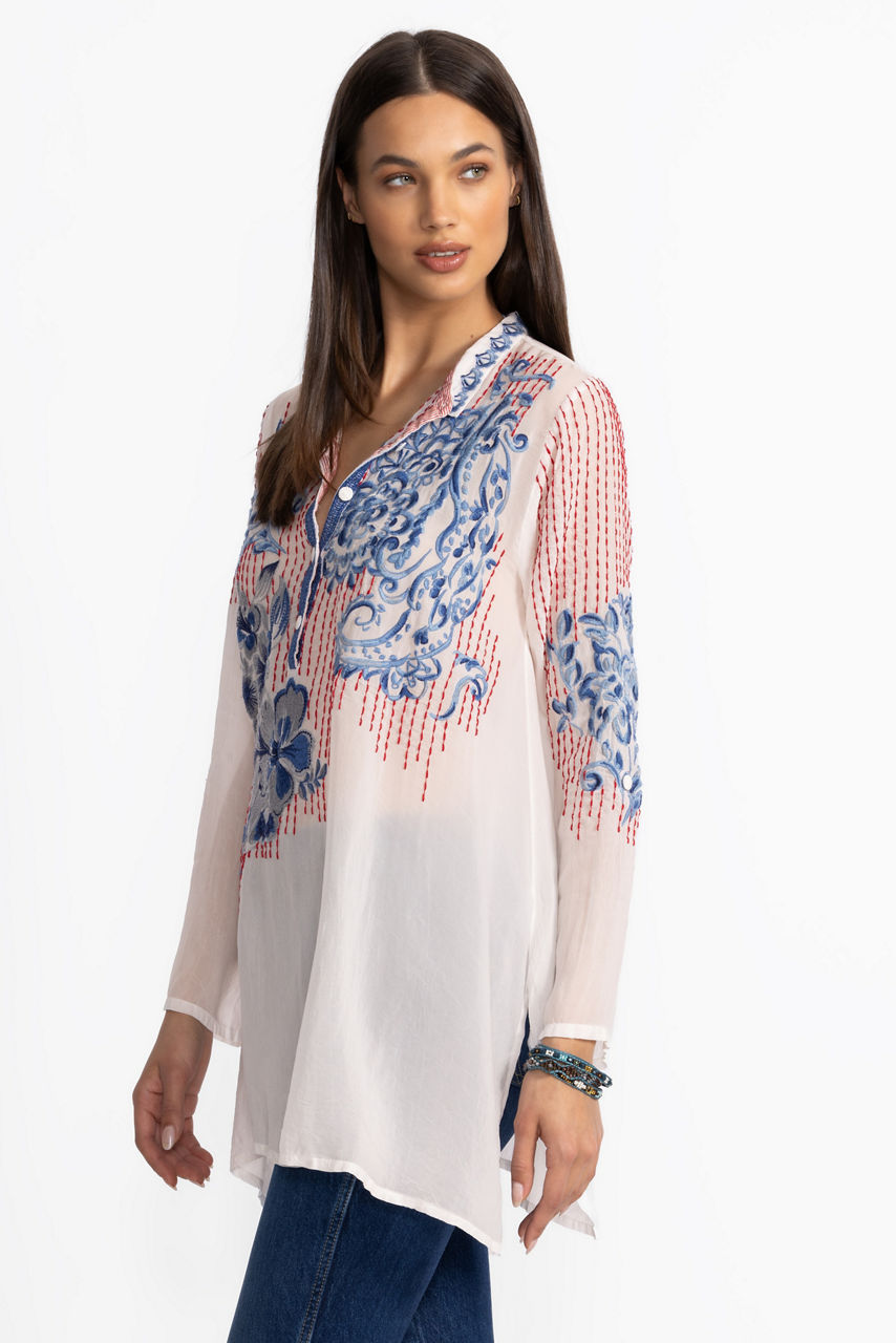 Beautifully adorned with intricate floral embroidery, the Gilani Tunic offers a fresh take on casual elegance. Crafted from a lightweight breathable fabric, this tunic features a Henley neckline and roll-tab sleeves and is finished with side slits for ease of movement. Pair with coordinating leggings and timeless flats for a polished casual ensemble.