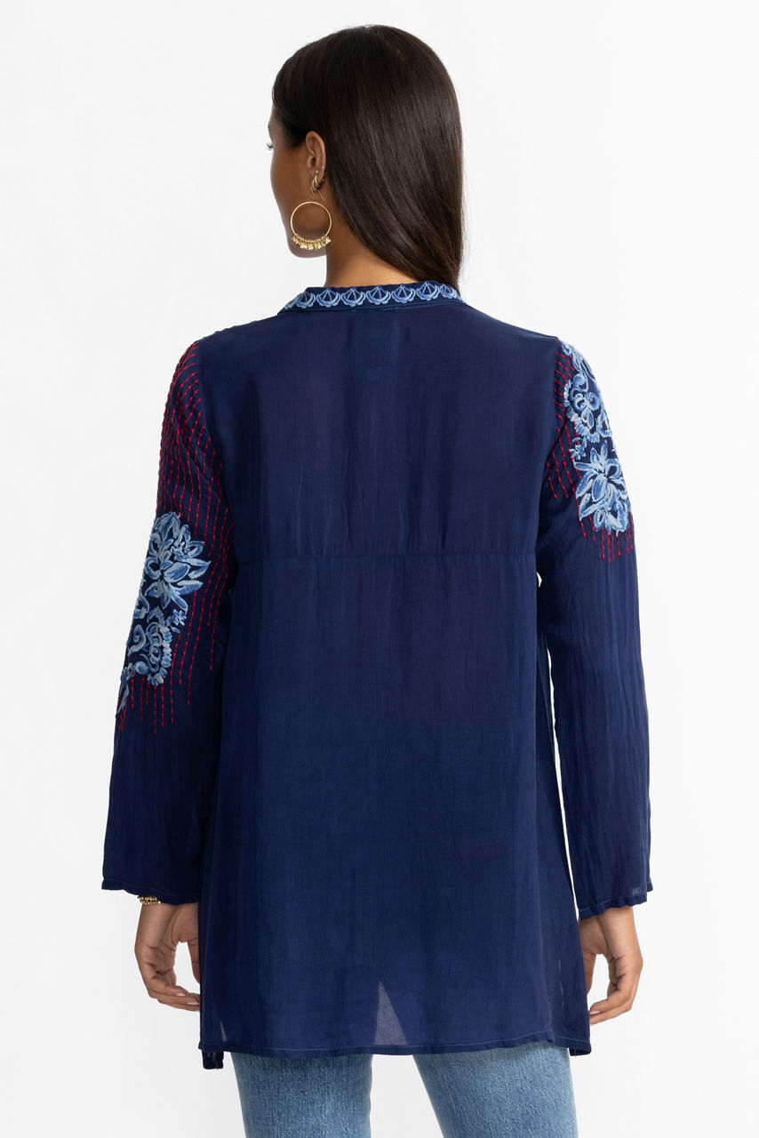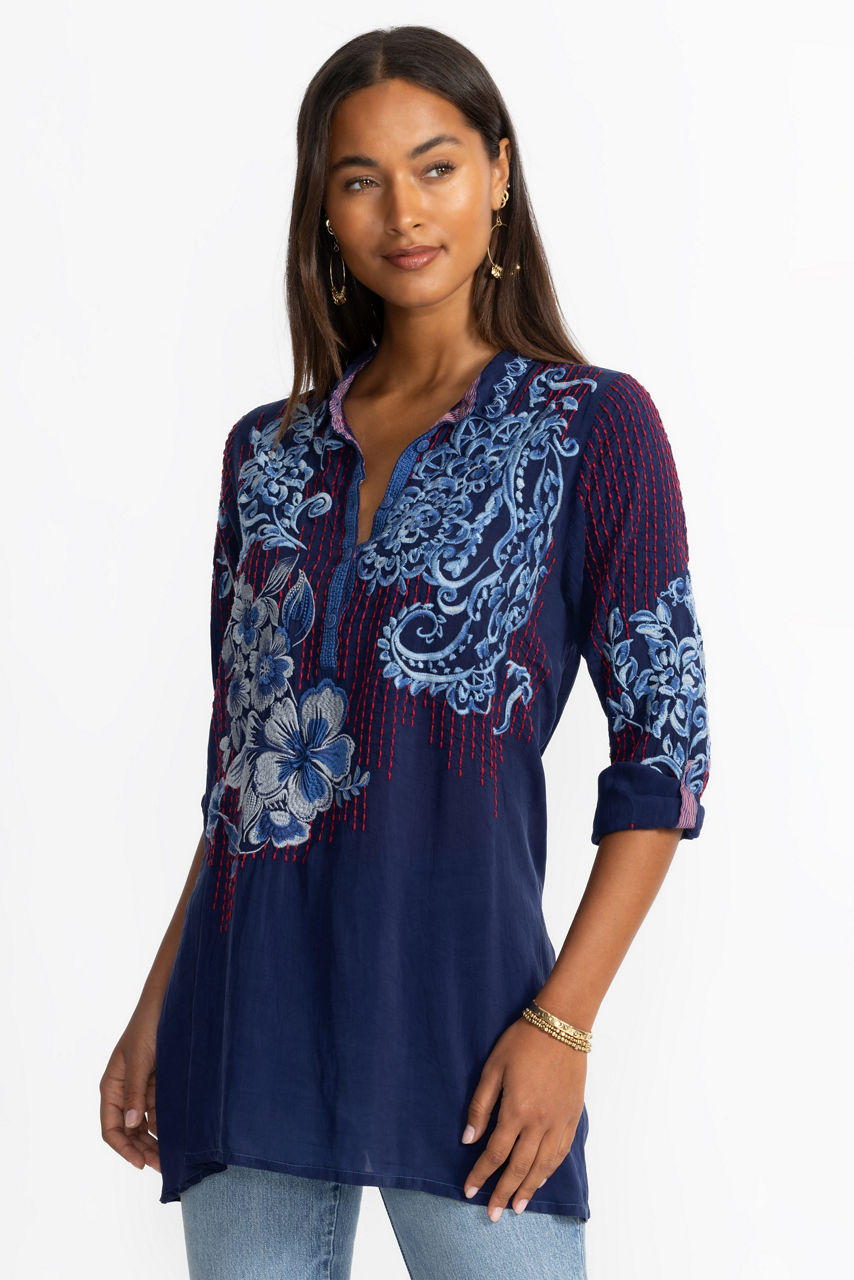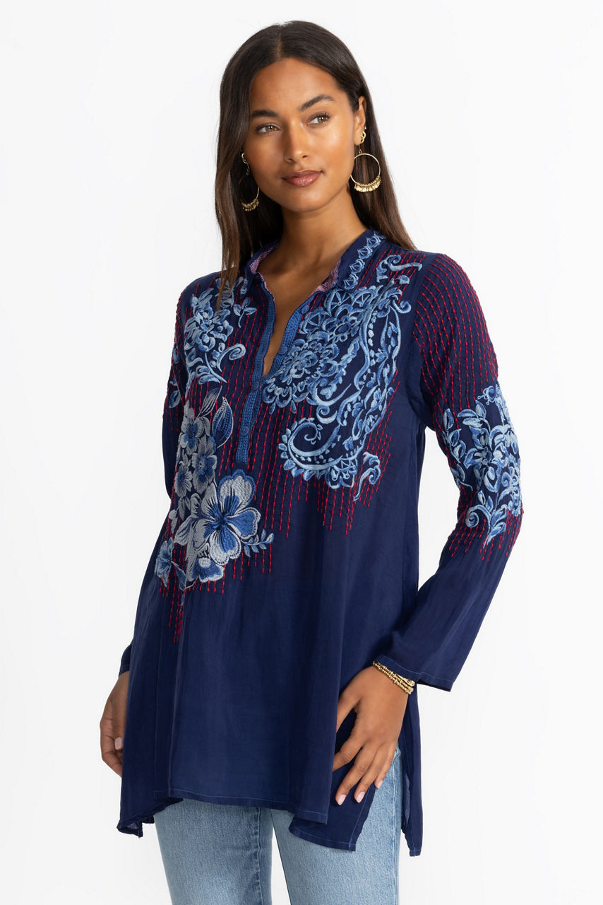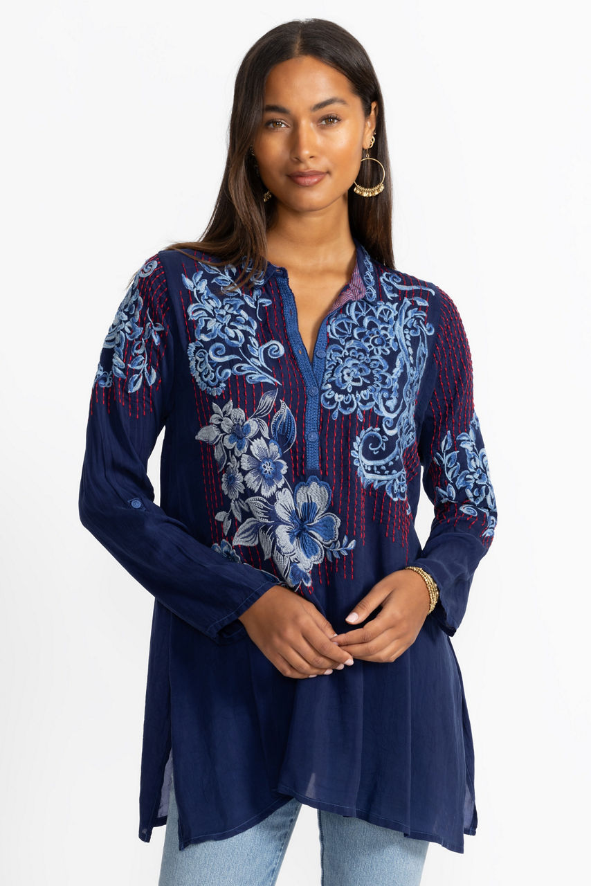 Beautifully adorned with intricate floral embroidery, the Gilani Tunic offers a fresh take on casual elegance. Crafted from a lightweight breathable fabric, this tunic features a Henley neckline and roll-tab sleeves and is finished with side slits for ease of movement. Pair with coordinating leggings and timeless flats for a polished casual ensemble.