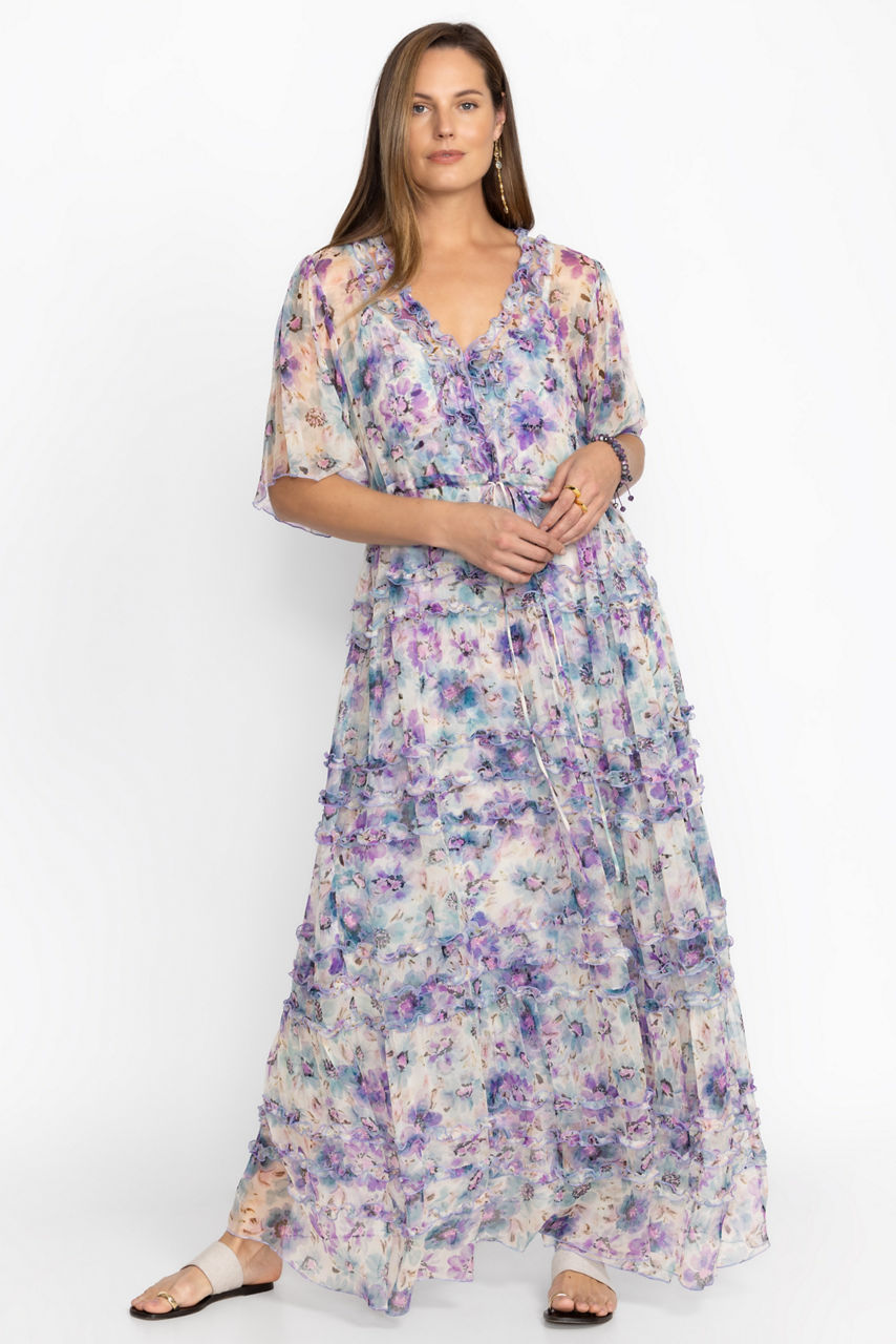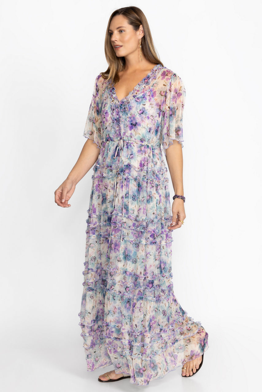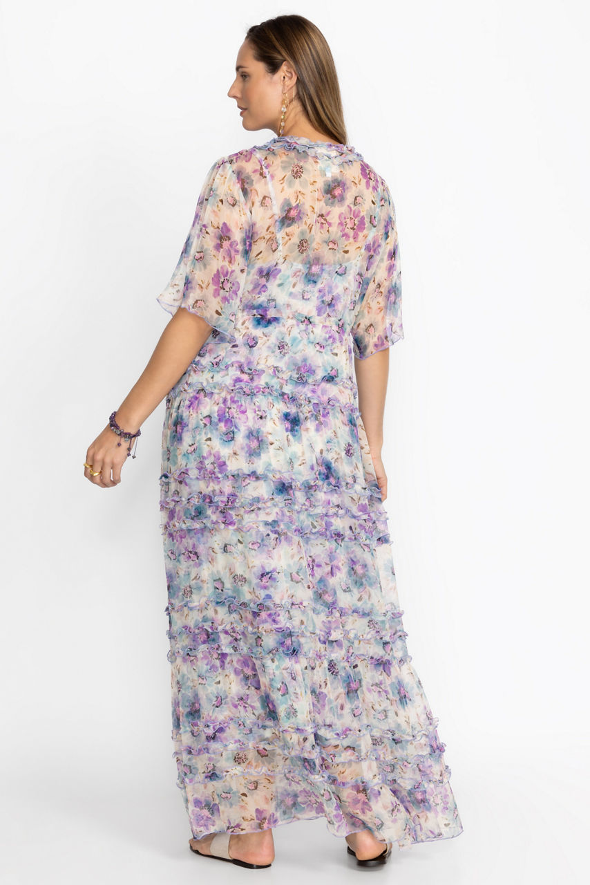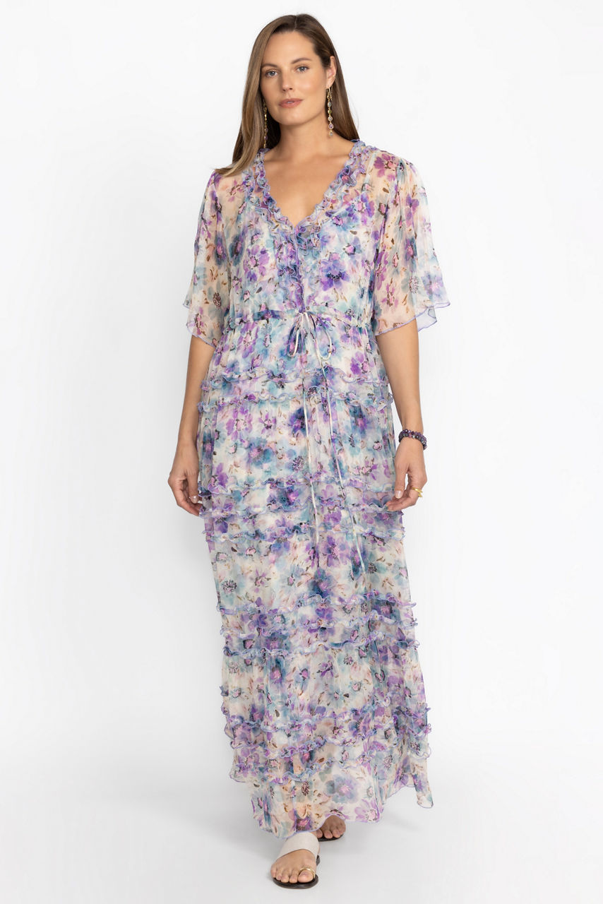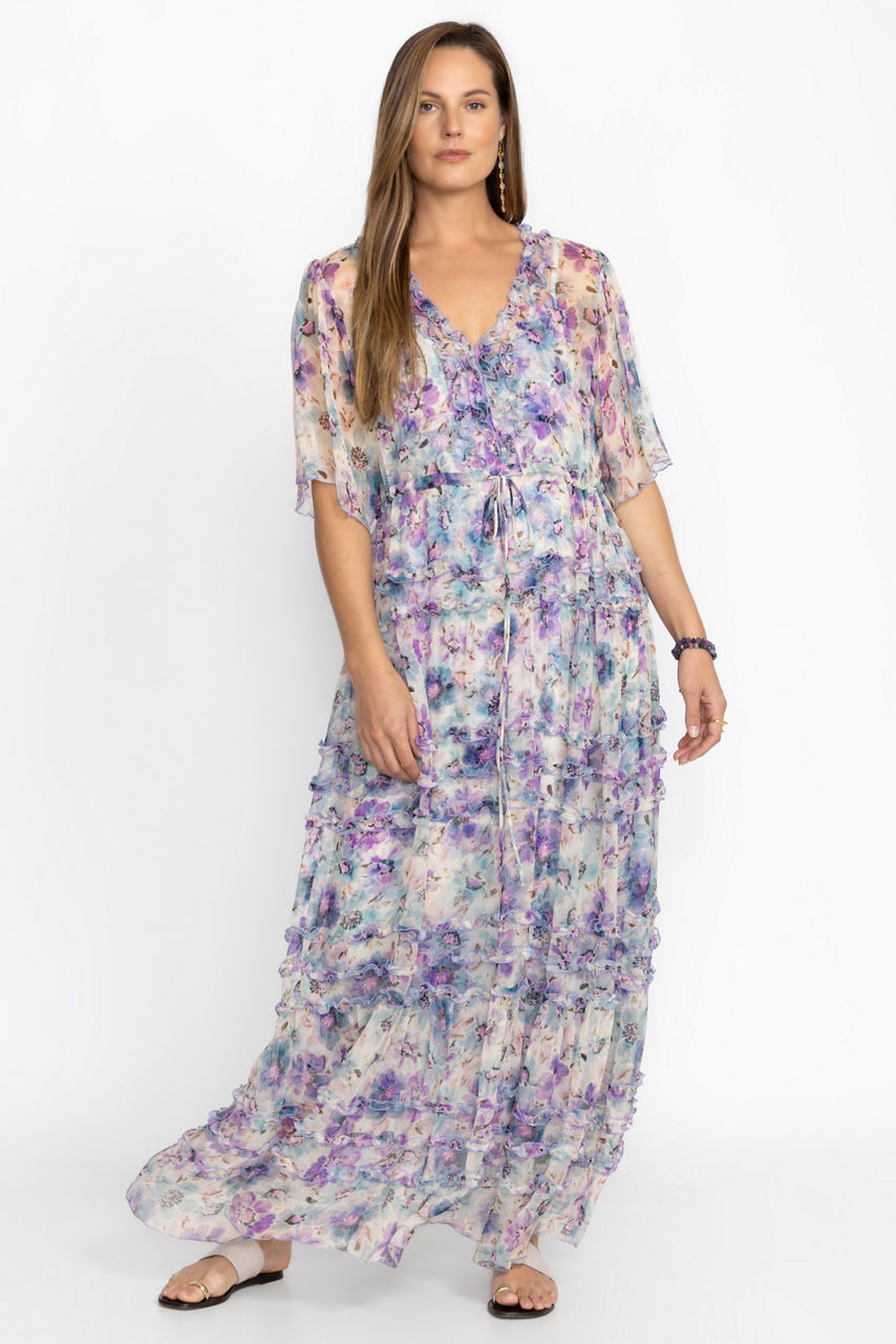 Crafted from 100% flowing silk, the Glinda Maxi Silk Dress offers a lightweight layered look that moves as you move. Featuring a deep V-neckline and removable knit slip, this tiered dress is finished with a delicate ruffled hem. Pair with delicate gold jewelry and pastel flats for a breezy feminine look.