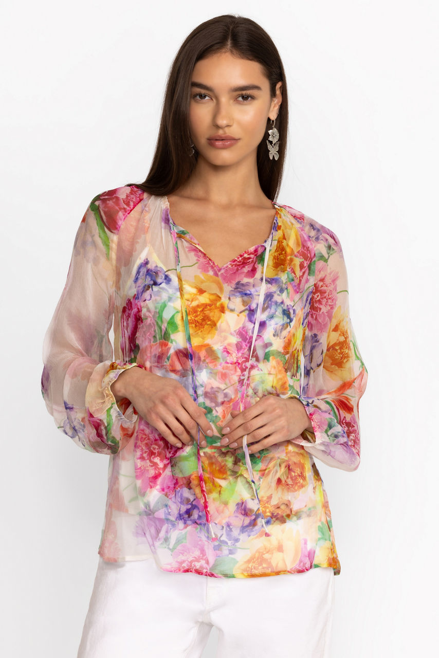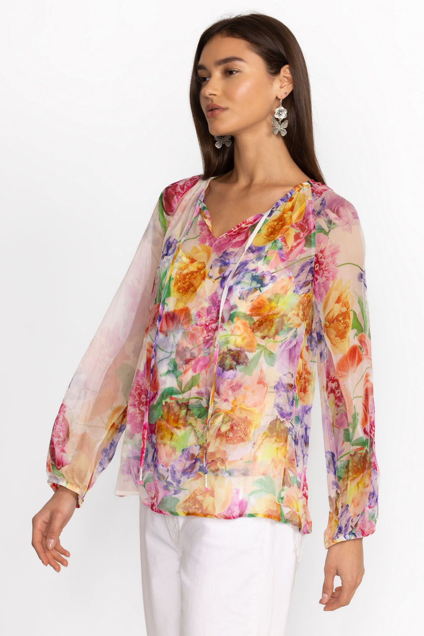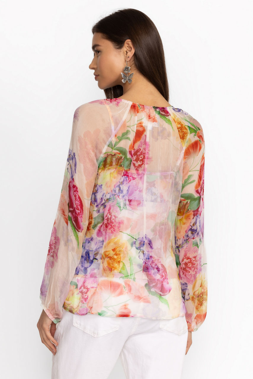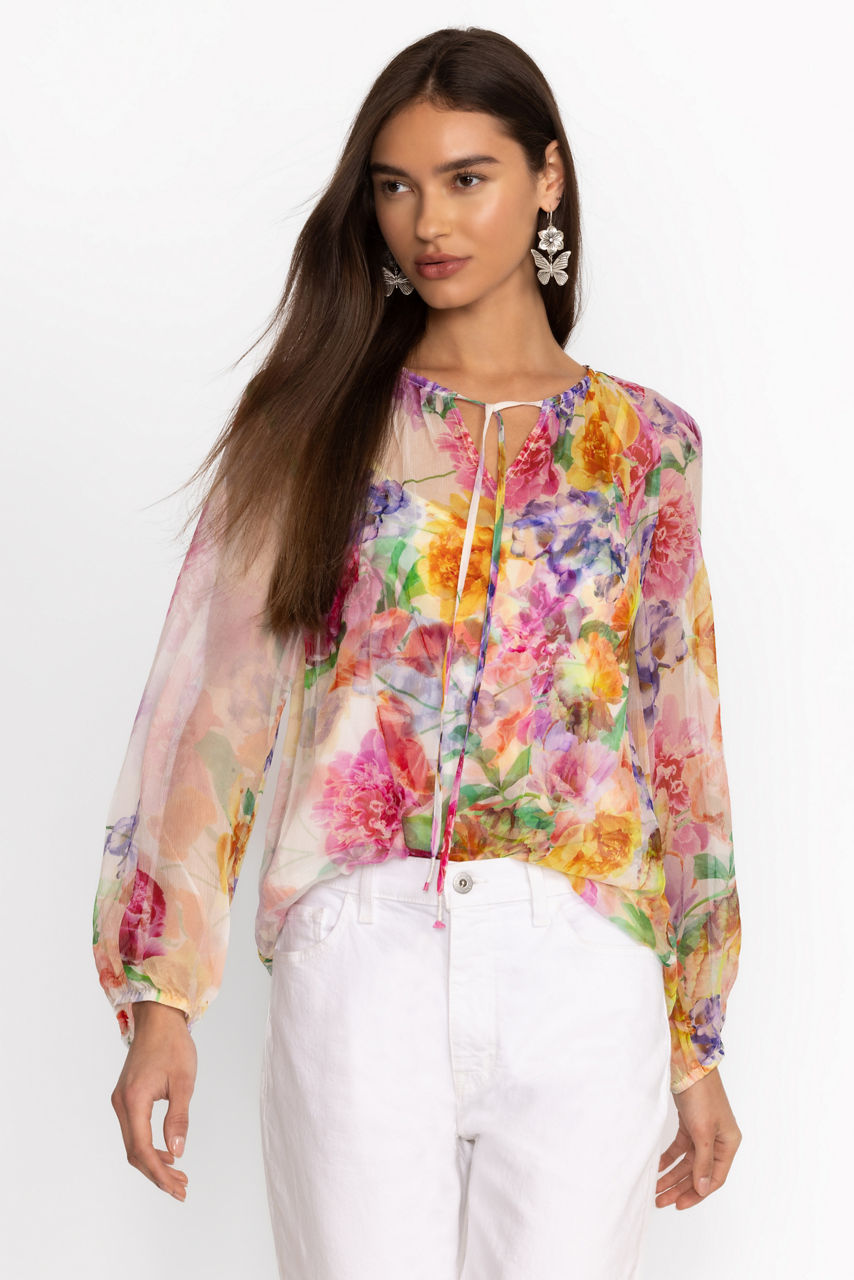 Crafted from 100% sumptuous silk, the Glinda Silk Peasant Blouse boldly displays a fresh floral watercolor pattern. Featuring a gathered neckline and gently puffed raglan sleeves with elastic at the cuffs, this flowing blouse offers a relaxed fit. Pair with fitted denim and leather flats for a polished weekend ensemble.