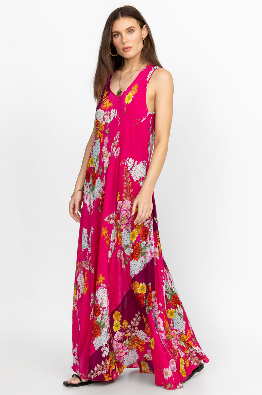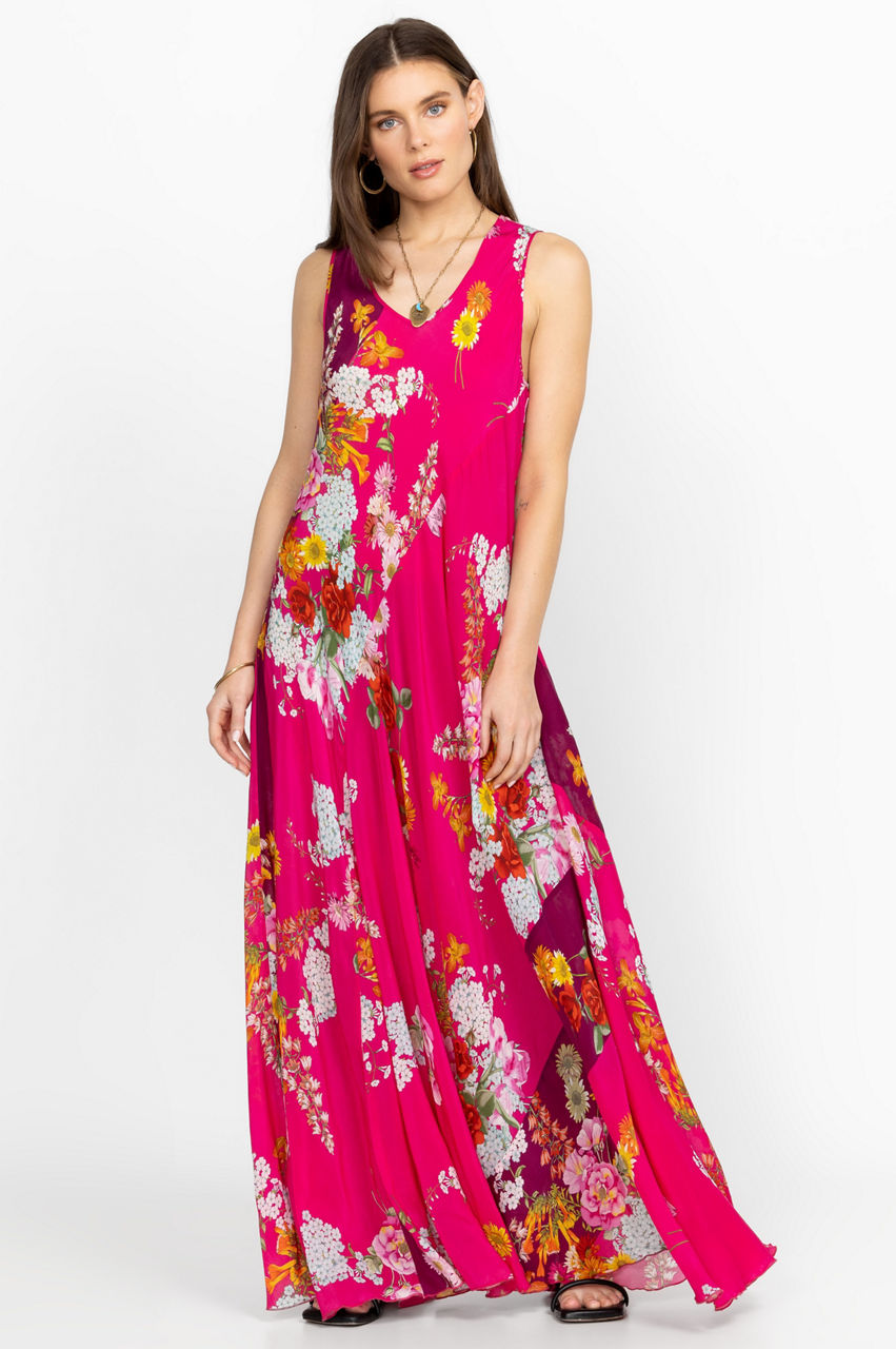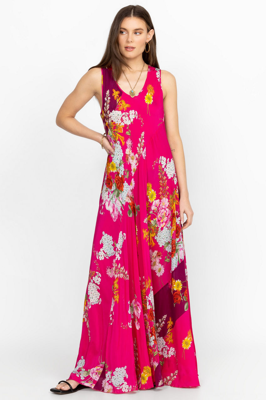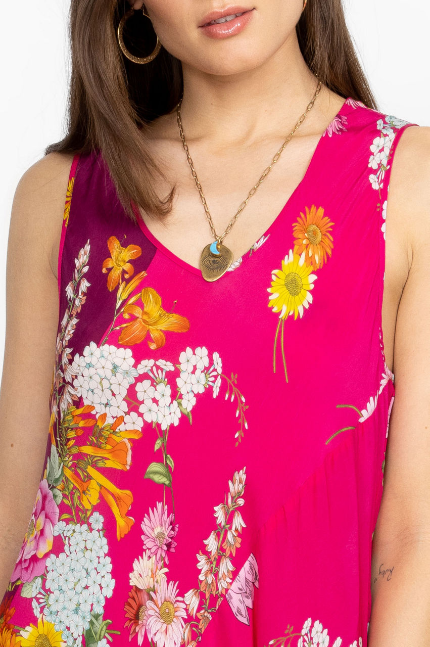 Sophisticated femininity is filtered through a vibrant lens on the Golden Bouquet Bias Dress. This elegant midi dress is spun from lightweight rayon with a comfortable cotton blend slip and boasts a V-neck, a vivid amalgamation of stripes and florals, and a bias cut for a flattering and fluid fit. For a glamorous evening ensemble, pair with leather accessories and simple jewelry.
