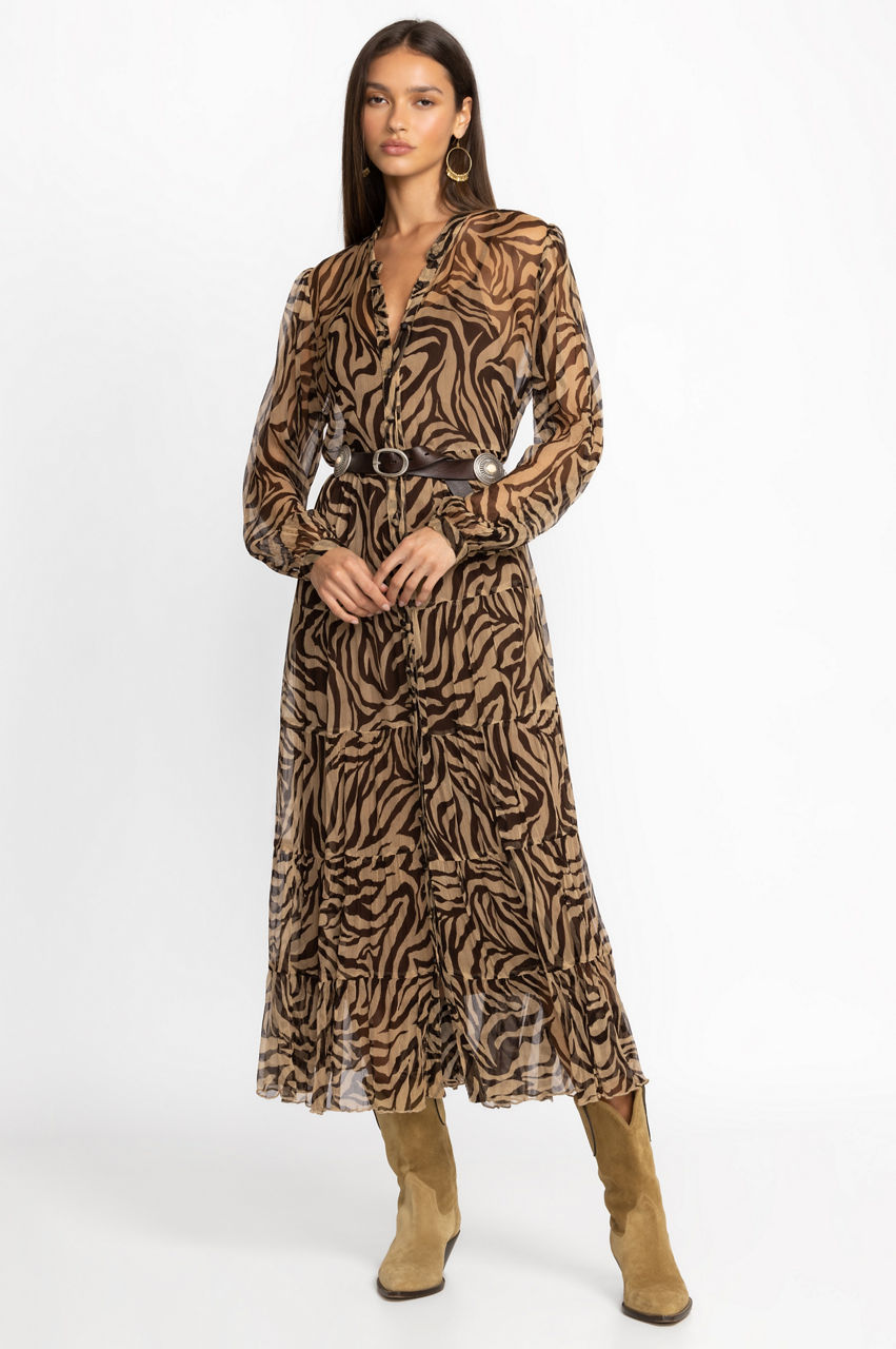 Take your new season wardrobe in an exotic direction with the Golden Days Silk Midi Dress. Spun from lustrous silk, this dress falls to a midi length and boasts a collar, long sleeves, a separate slip, and a brown animal print for a striking finish. Pair this midi dress with flats during the day and switch to a low heel after sunset.