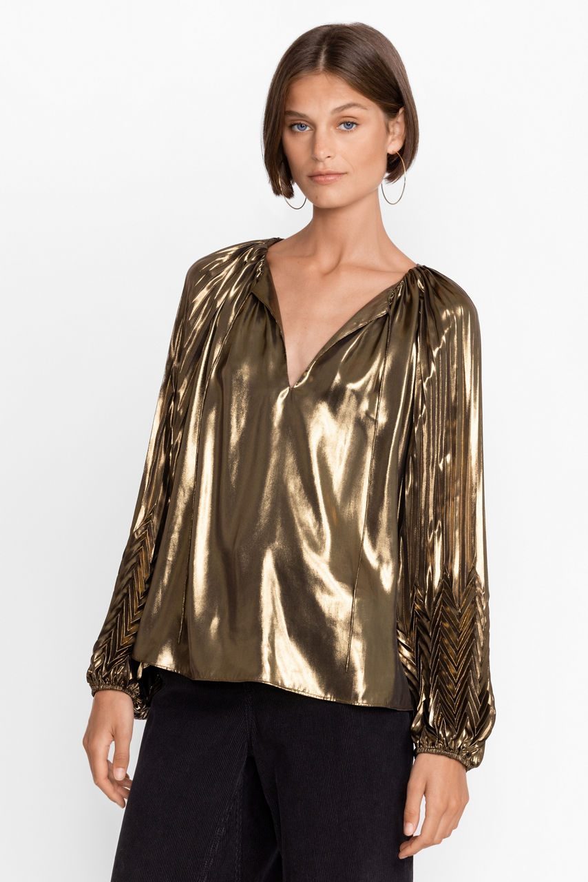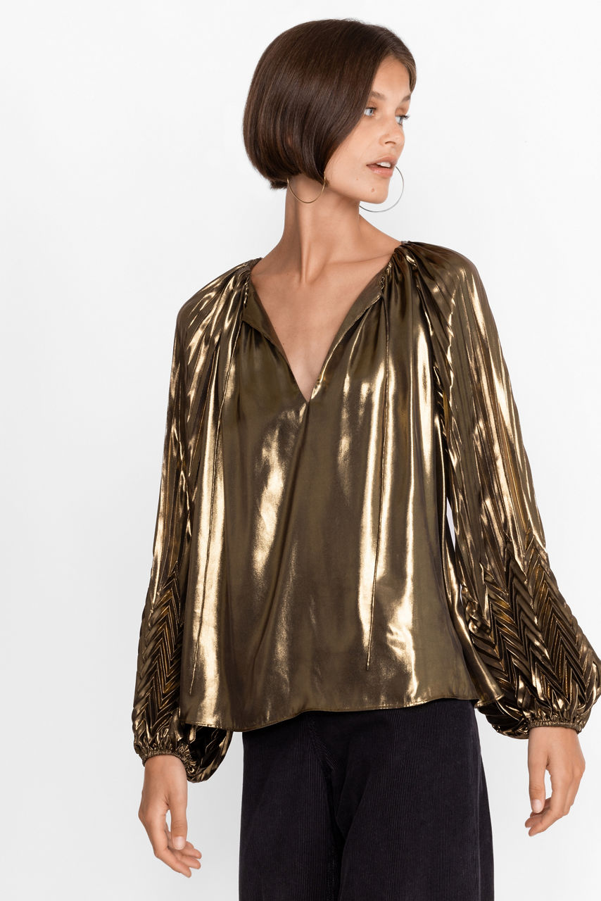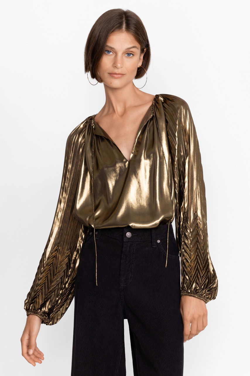 Underscored with timeless elegance, the Golden Gem Pleated Blouse breathes subtle tactility into a classic wardrobe staple. Spun from a smooth fabric, this blouse is enhanced by a pleated design and features a spaghetti tie front and long sleeves with elastic sleeve cuffs. Style this blouse with jeans during the day and switch to silk pants at night.