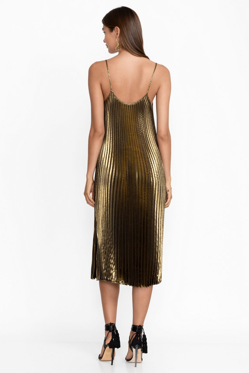 Infused with 70s charm, the Golden Gem Pleated Midi Dress makes a case for chic eveningwear. Falling to a midi length, this metallic dress is enhanced with a pleated design and features a scoop neck, adjustable straps, and side splits at the hem for easy movement. Wear this dress with simple accessories and a block heel for a head-turning party ensemble.