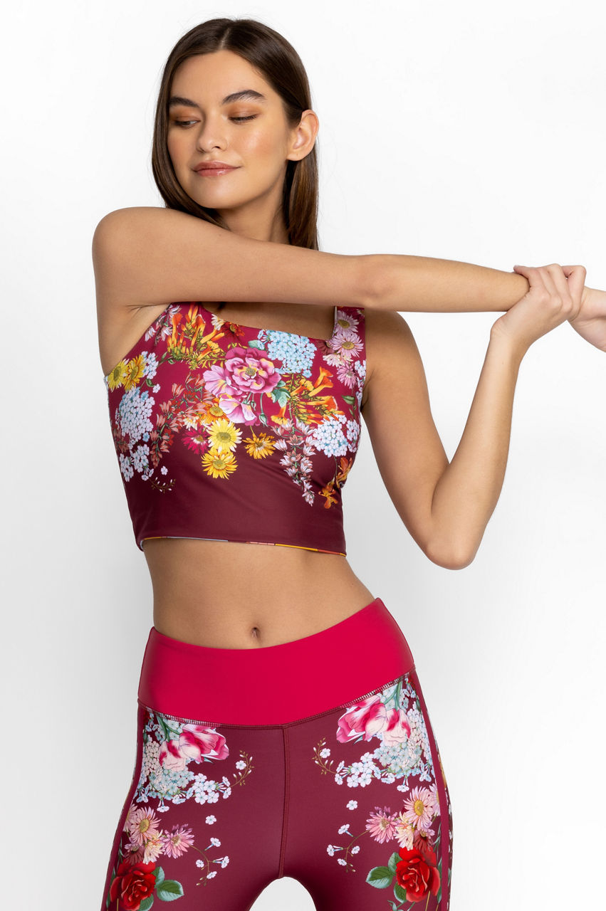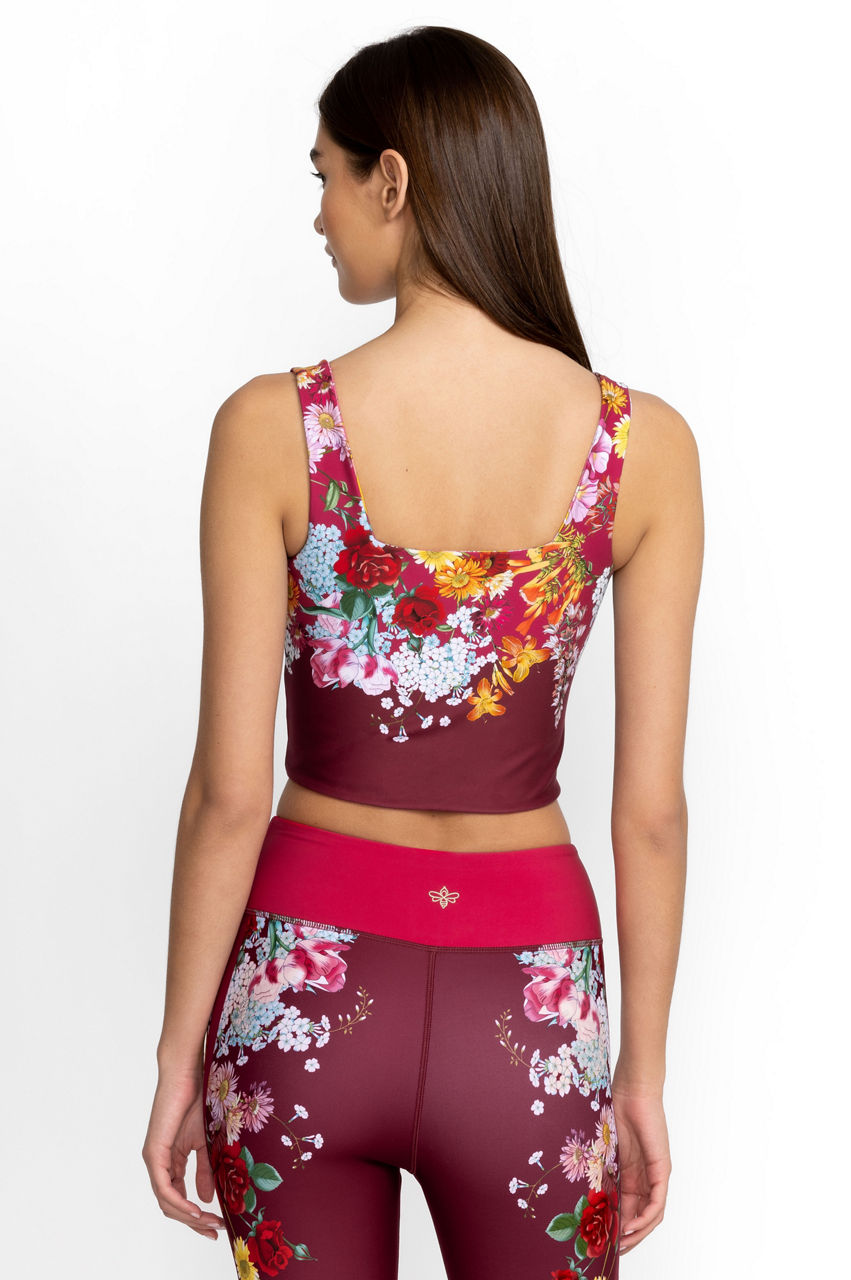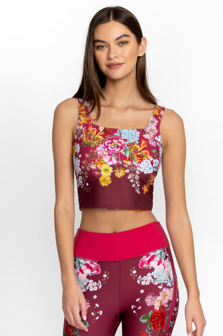 Femininity and a rich color palette dominate the Golden Rose Reversible Square Neck Compression Tank. This compression tank is made from a breathable fabric with added stretch for comfort and features a square neck, a bouquet of tropical blooms, and a reversible side. Wear with leggings or opt for a tennis skirt on sun-filled days.