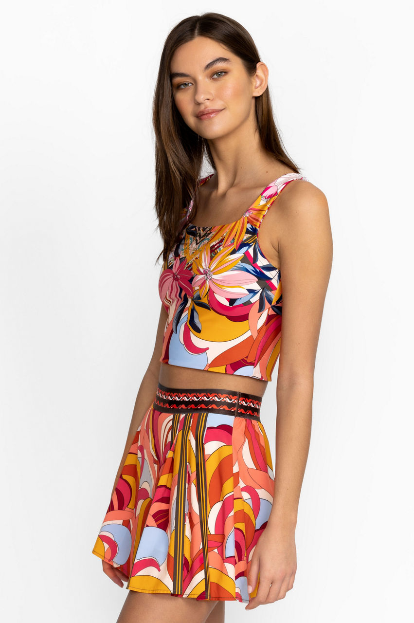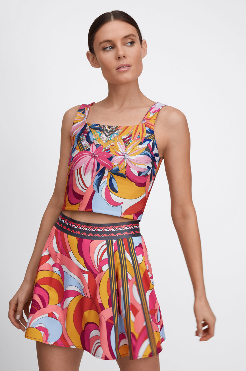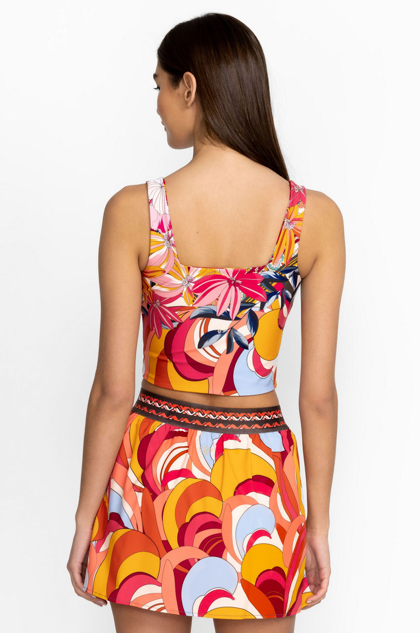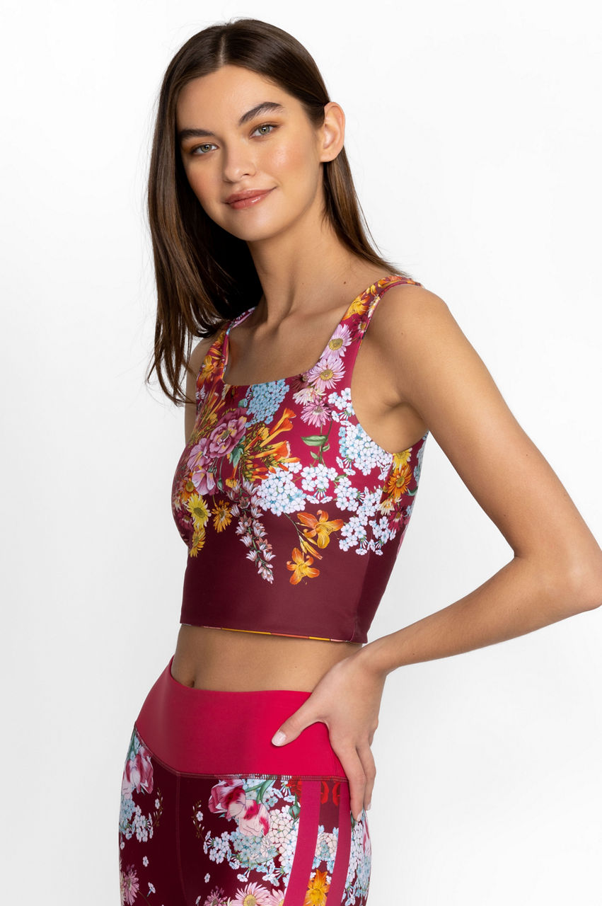 Femininity and a rich color palette dominate the Golden Rose Reversible Square Neck Compression Tank. This compression tank is made from a breathable fabric with added stretch for comfort and features a square neck, a bouquet of tropical blooms, and a reversible side. Wear with leggings or opt for a tennis skirt on sun-filled days.