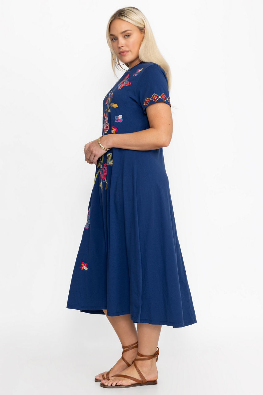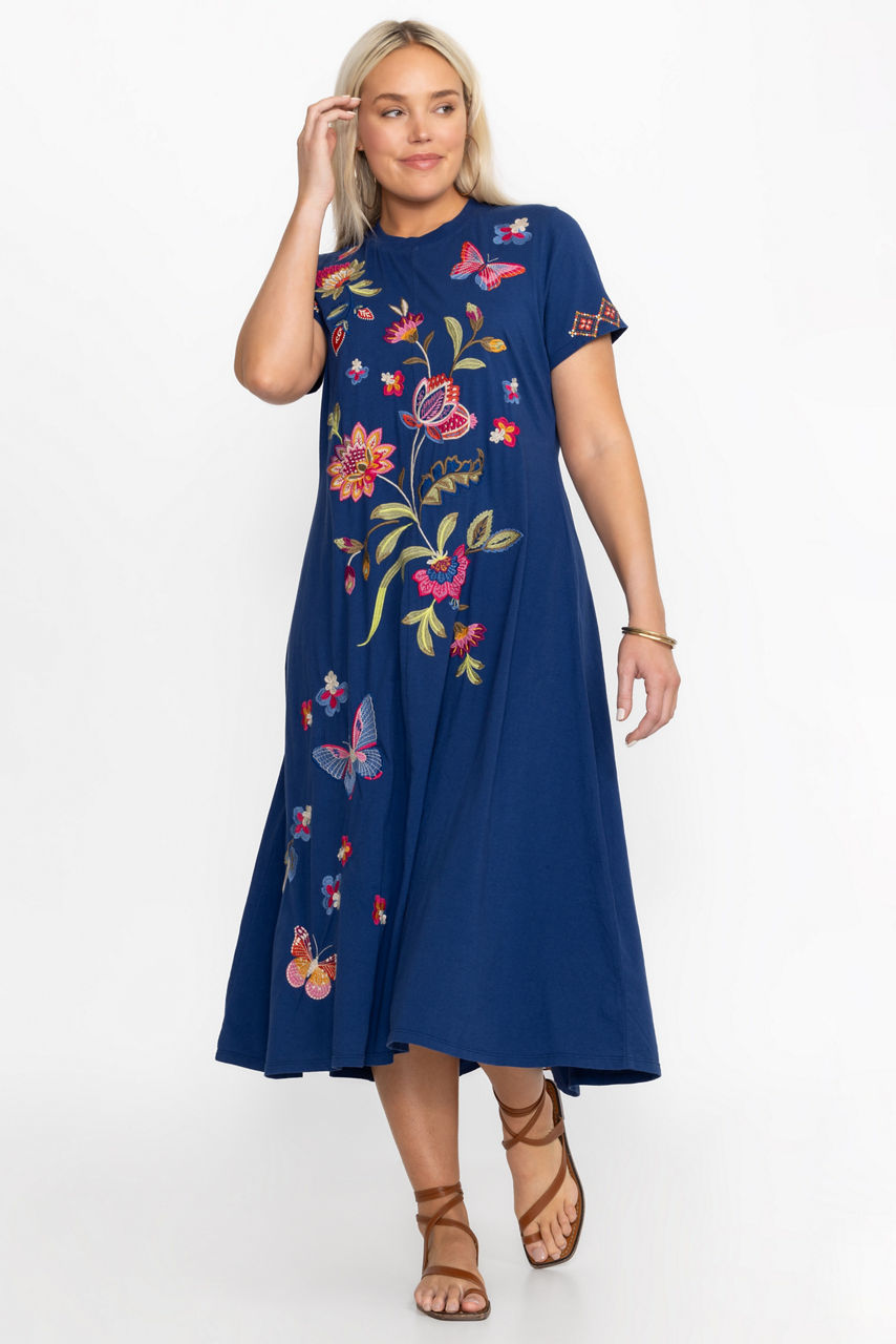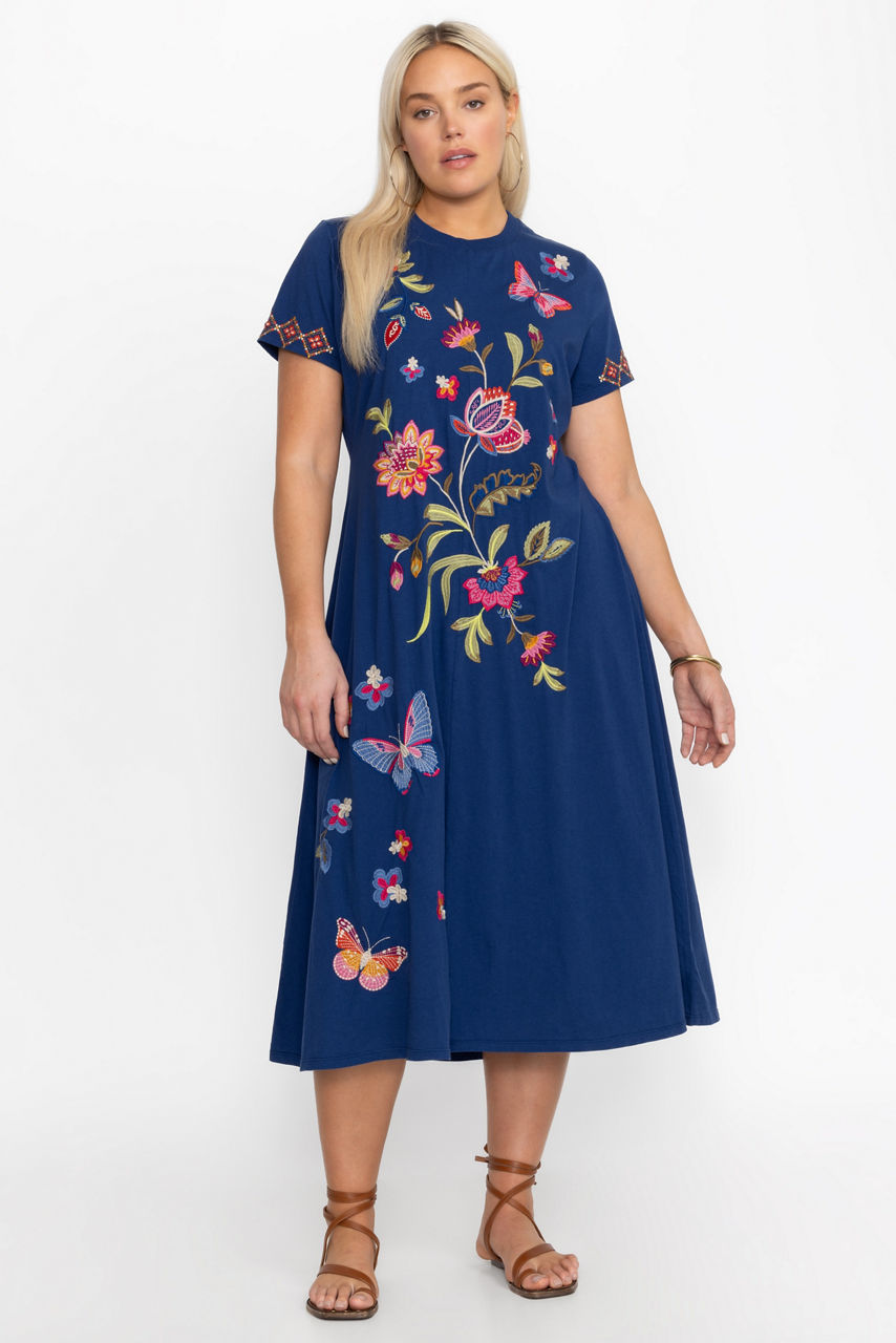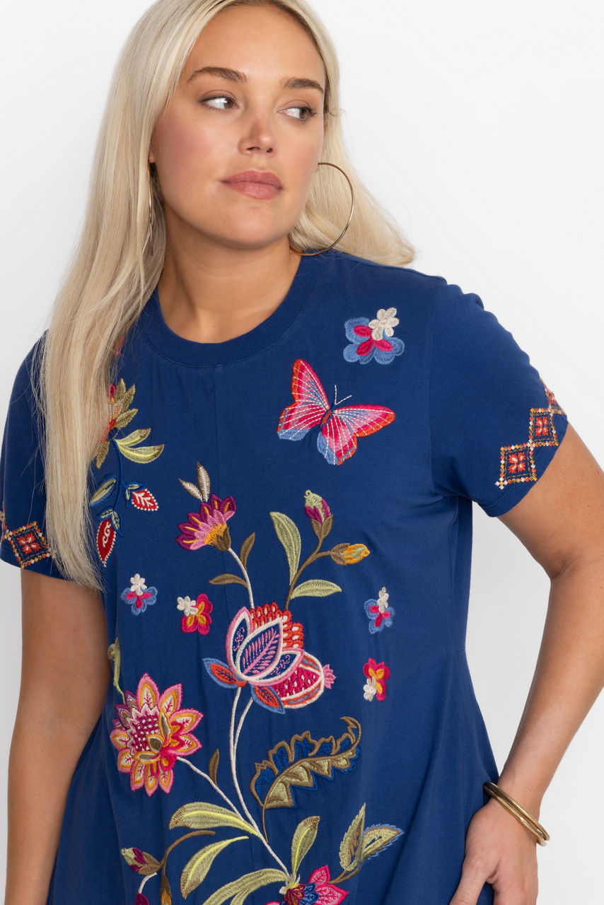Adorned with brilliant blooms and butterflies in flight, the Gracey Crew Neck Swing Dress is the perfect combination of comfort and style. Crafted from 100% cotton with a rounded crew neckline, this A-line dress features short sleeves and colorful placement embroidery. Pair with espadrille wedges and a silk scarf for a polished look with all day comfort.