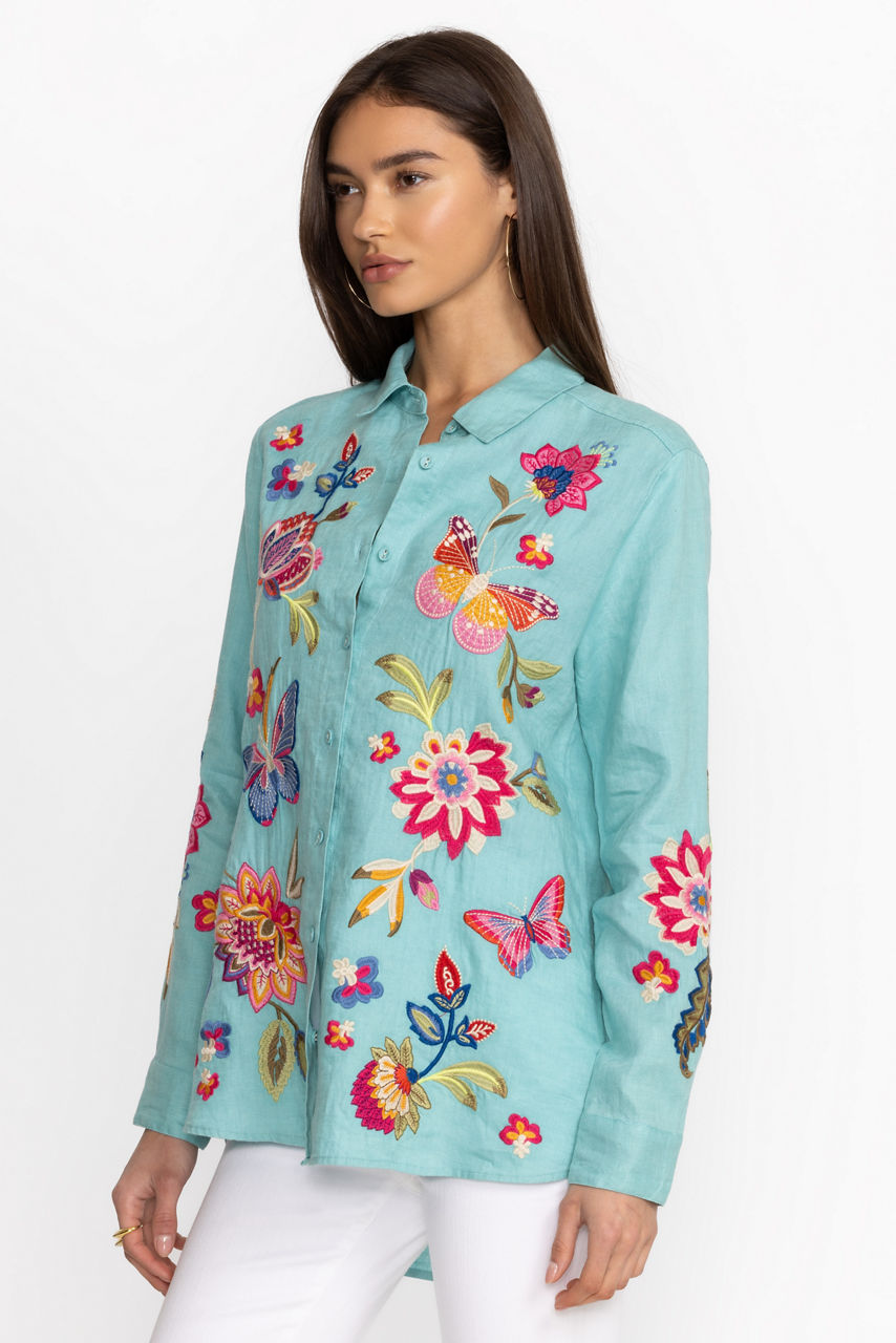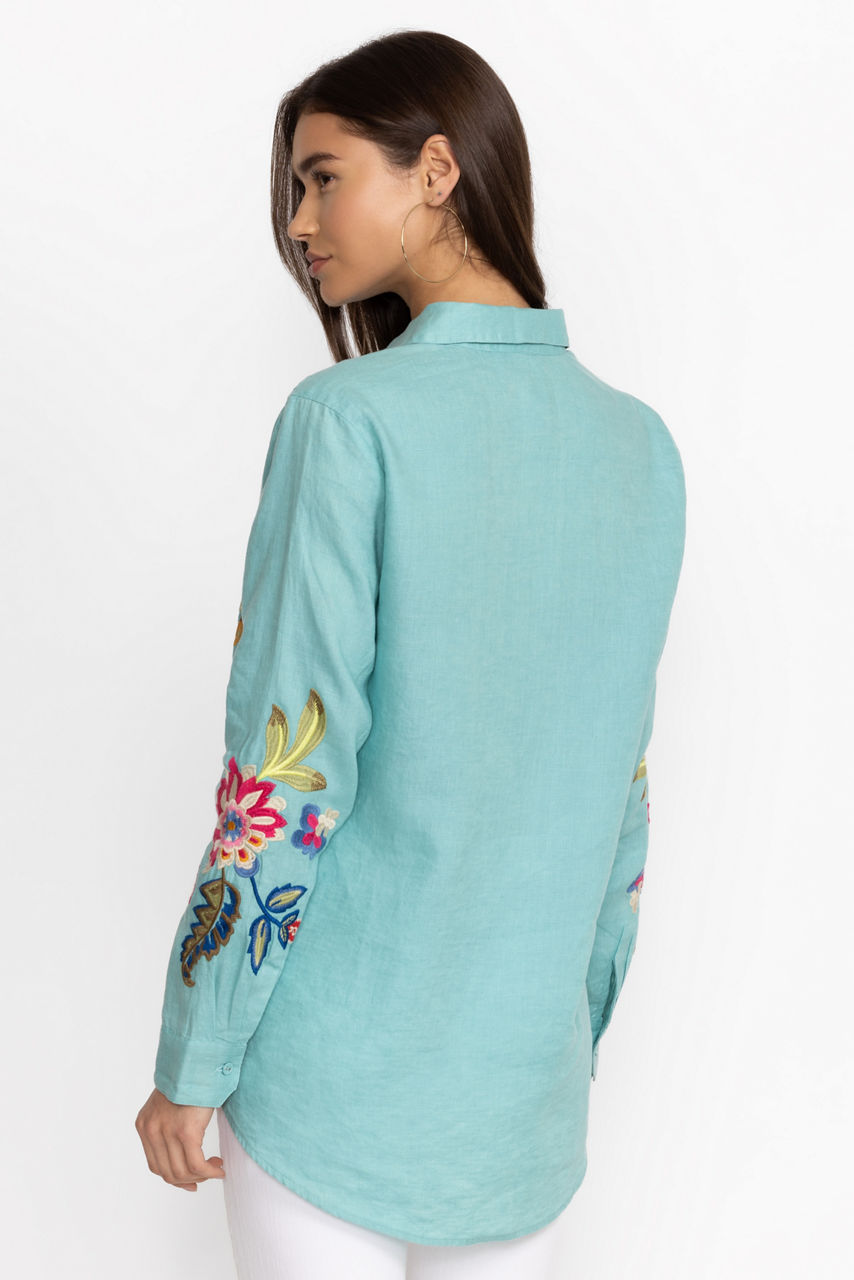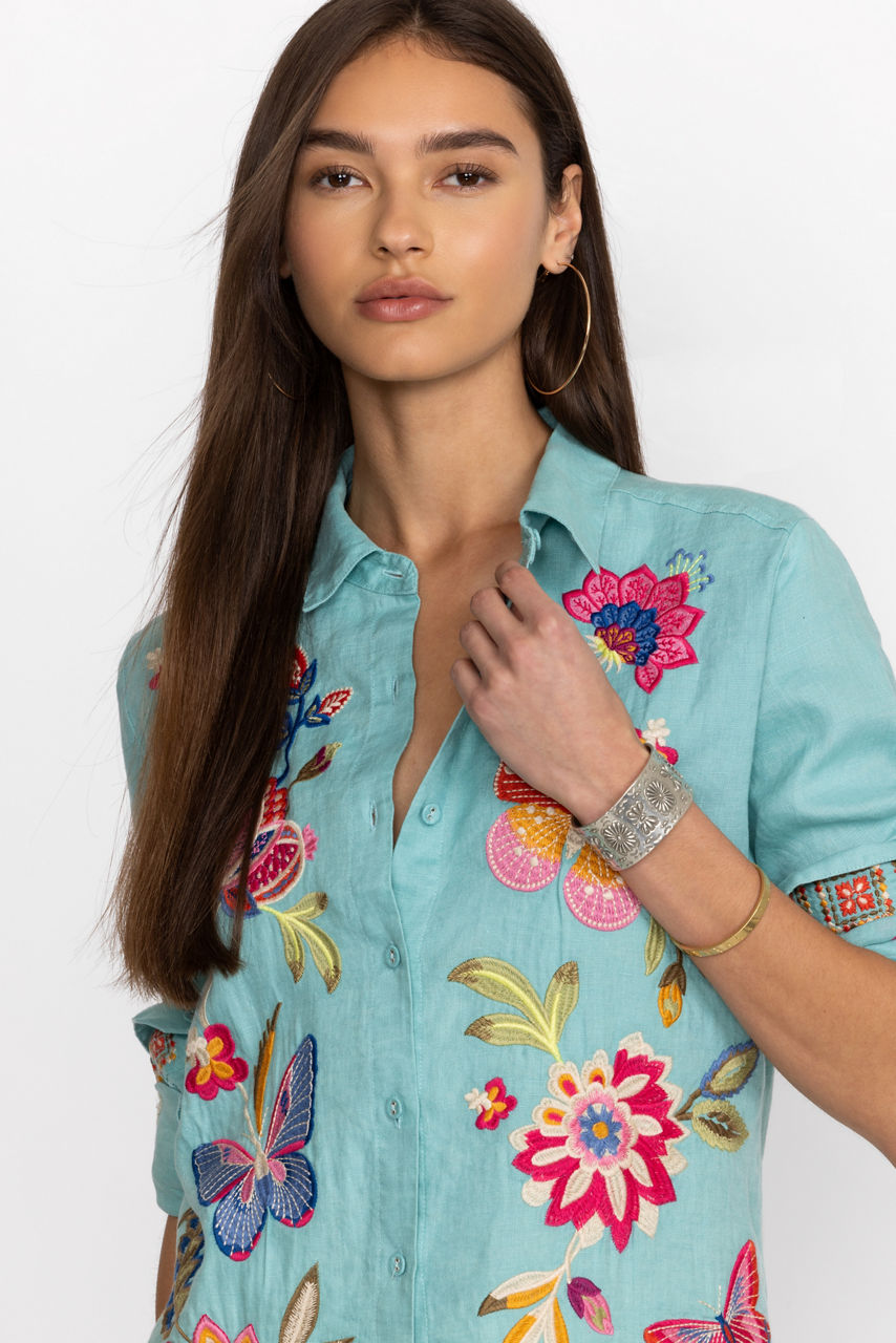 Crafted from 100% breathable linen, the Gracey Linen Oversized Shirt offers classic shirting with a relaxed fit. Featuring a button front and colorful placement embroidery, this shirt offers a generous bodice making it perfect for layering. Pair with a fitted tank and relaxed fit jeans for a weekend adventure.