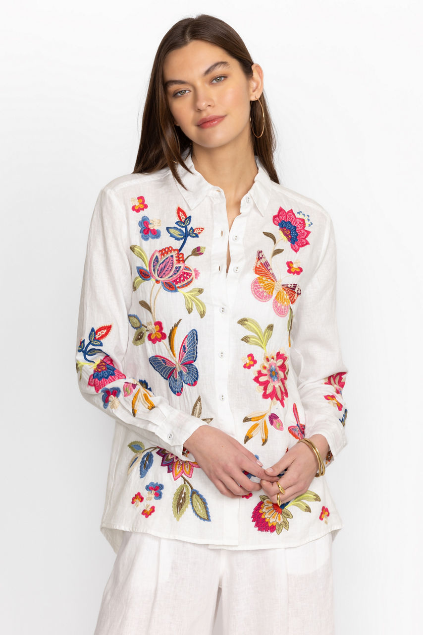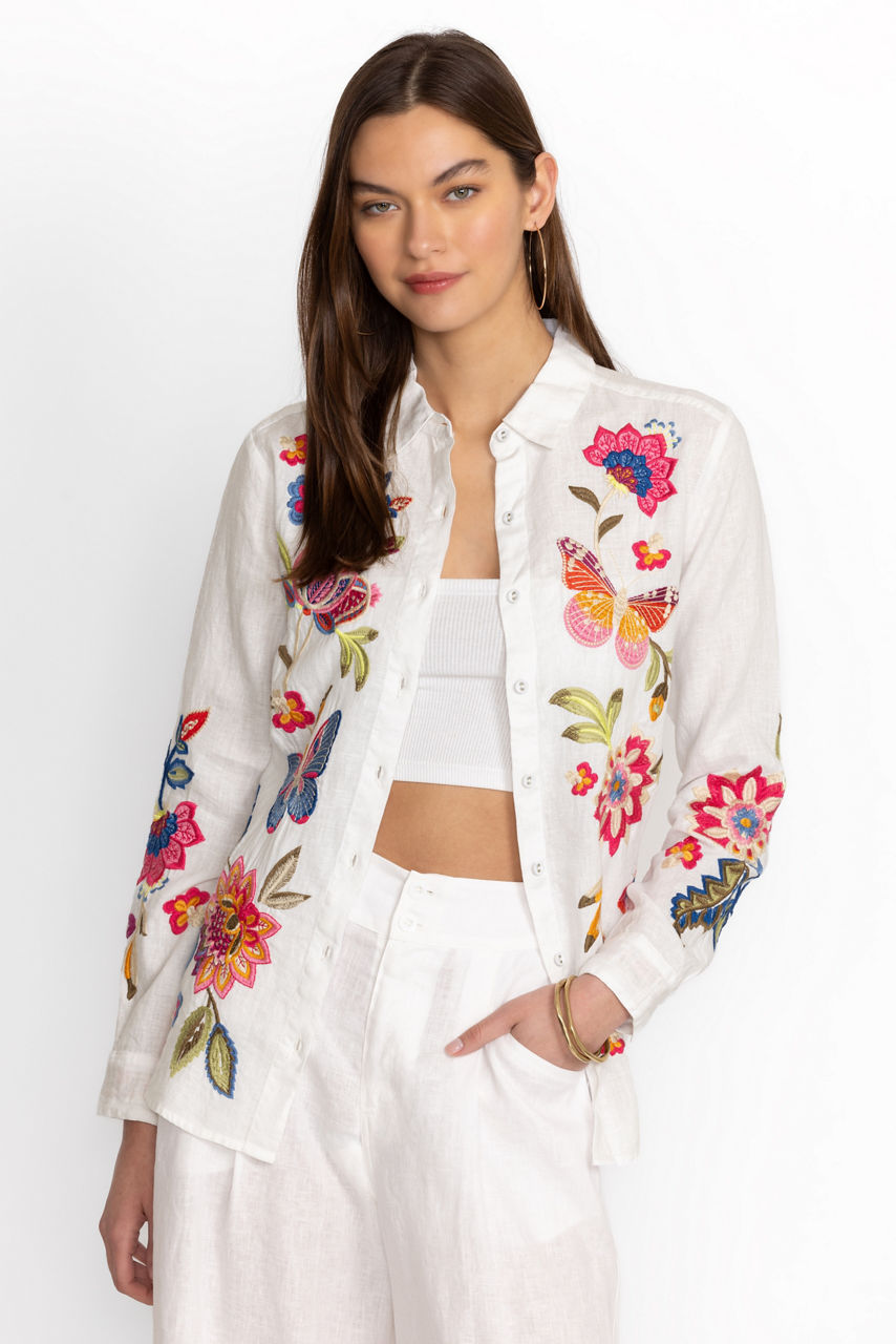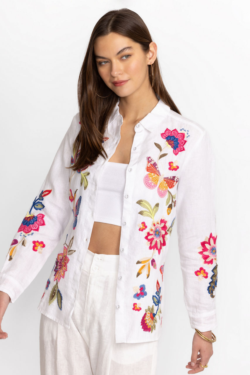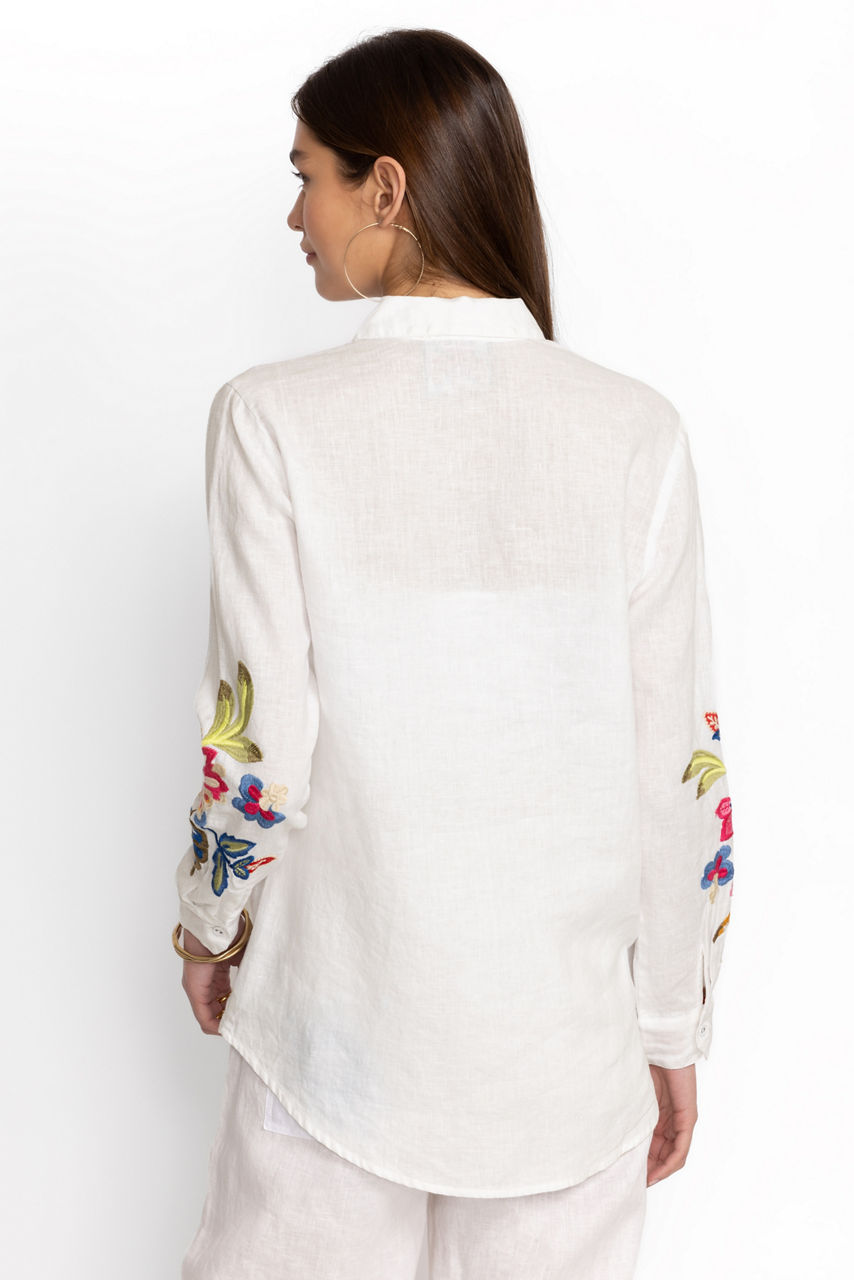 Crafted from 100% breathable linen, the Gracey Linen Oversized Shirt offers classic shirting with a relaxed fit. Featuring a button front and colorful placement embroidery, this shirt offers a generous bodice making it perfect for layering. Pair with a fitted tank and relaxed fit jeans for a weekend adventure.