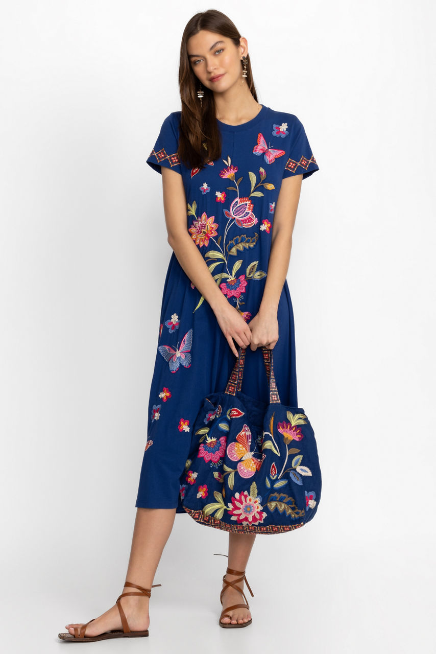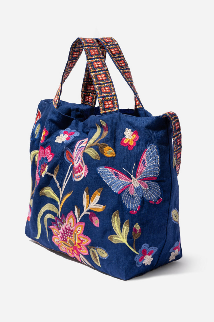 Crafted from 100% linen, the Gracey Linen Tote Bag offers brilliant blooms on a deep blue backdrop. Featuring a magnetic snap top for easy closure, this back is adorned with delicate placement embroidery. Pair with a classic tee and your favorite jeans for a casual look with a splash of color.
