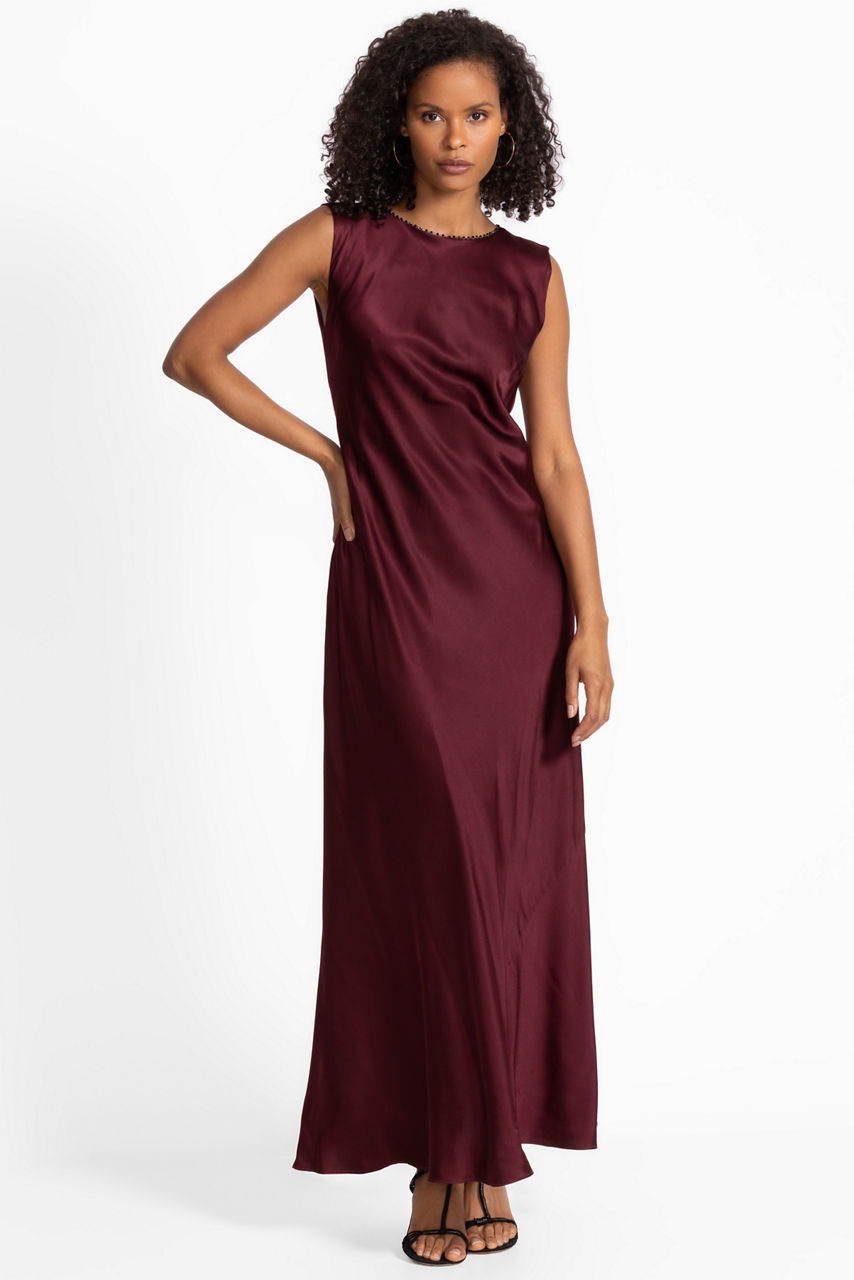Crafted from sumptuous 100% silk, the Gradina Silk Dress is equal parts elegant and timeless. Designed with an embellished boat neckline and a keyhole at the back, this cap sleeve dress is finished with a flowing bias cut for a draped effect. Pair with classic pumps and delicate gold jewelry for a polished evening ensemble.