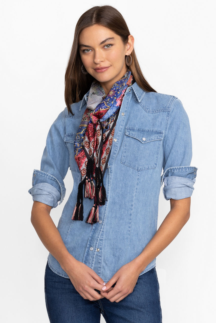 Crafted from 100% silk, the Grand Canel Silk Scarf is intricately detailed with bold color and an ornate pattern. Offered in an array of colorways, this rich scarf adds an elegant pop to your looks. Wear tied at the neck or add to the handle of your favorite bag for a chic finish.