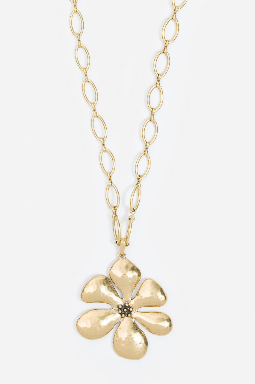 Inspired by nature, the Grande Floral Necklace seamlessly blends a '70s aesthetic with a contemporary vision. This necklace is crafted from a mix of stone and metal in a gold-tone colorway and features a large floral shape pendant, a link chain, and an adjustable lobster-clip fastening at the back. Style with a simple tee to keep the necklace in focus or opt for a whimsical finish by pairing with a printed blouse or dress.