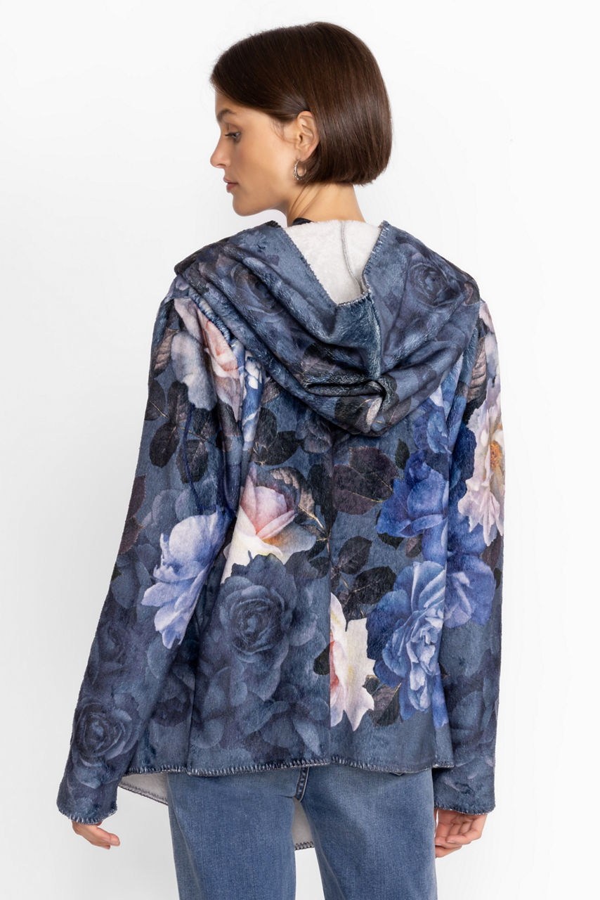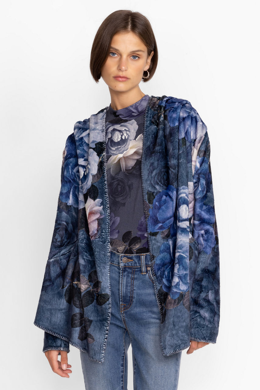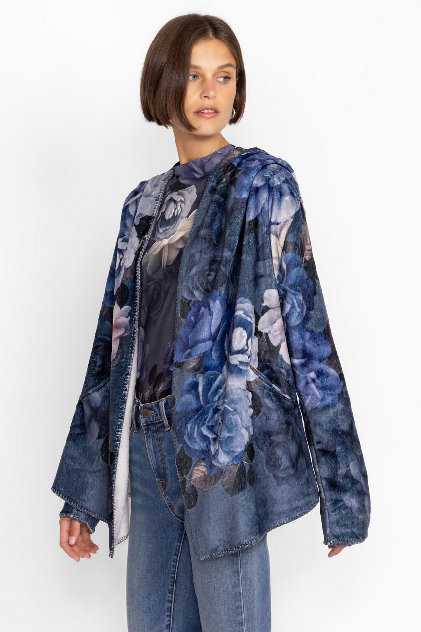 A vibrant layer for cooler days, the Grey Peony Sherpa Jacket is brought to life through arty details and unmatched tactility. Made from a soft sherpa fabric, this jacket boasts a hood, long sleeves, an open front, welt pockets, and blanket stitching at the hem and sleeves. Style this jacket with relaxed loungewear for an effortlessly chic off-duty outfit.