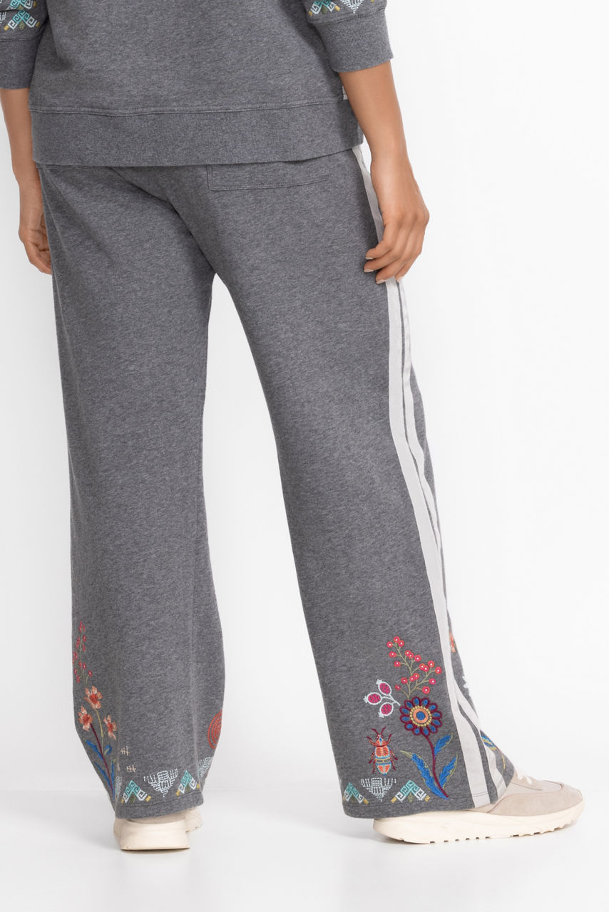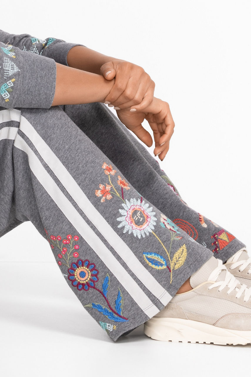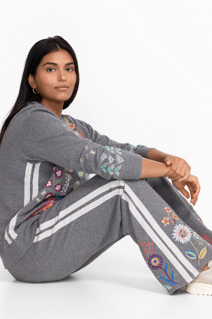 Upgrade your casual wear with the Griffin Wide Leg Ribbon Pants. These luxuriously soft sweatpants feature a relaxed fit, a tuxedo stripe ribbon at the sides, and intricate embroidery detail that adds a unique flare to a classic loungewear piece. Pair with a bold tee and sneakers for a day relaxing with family or friends.