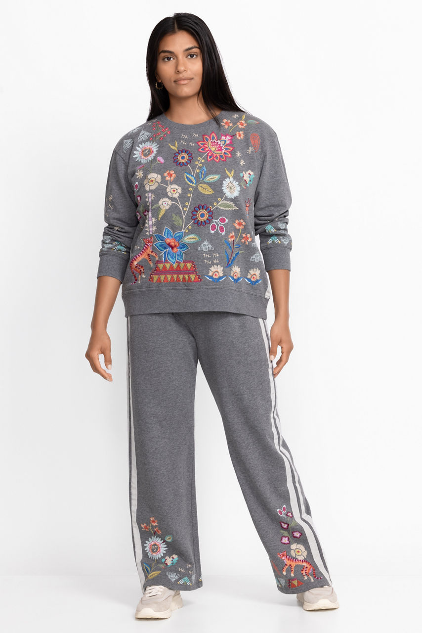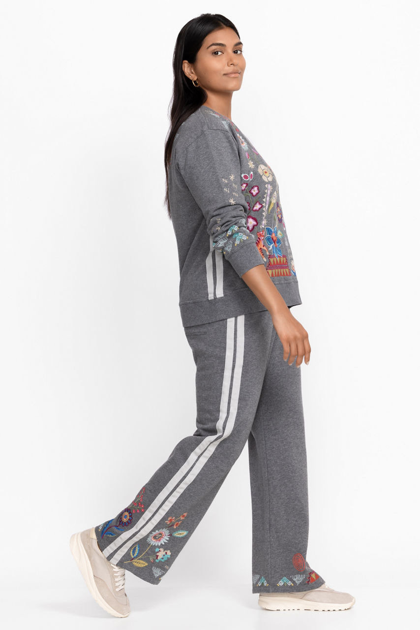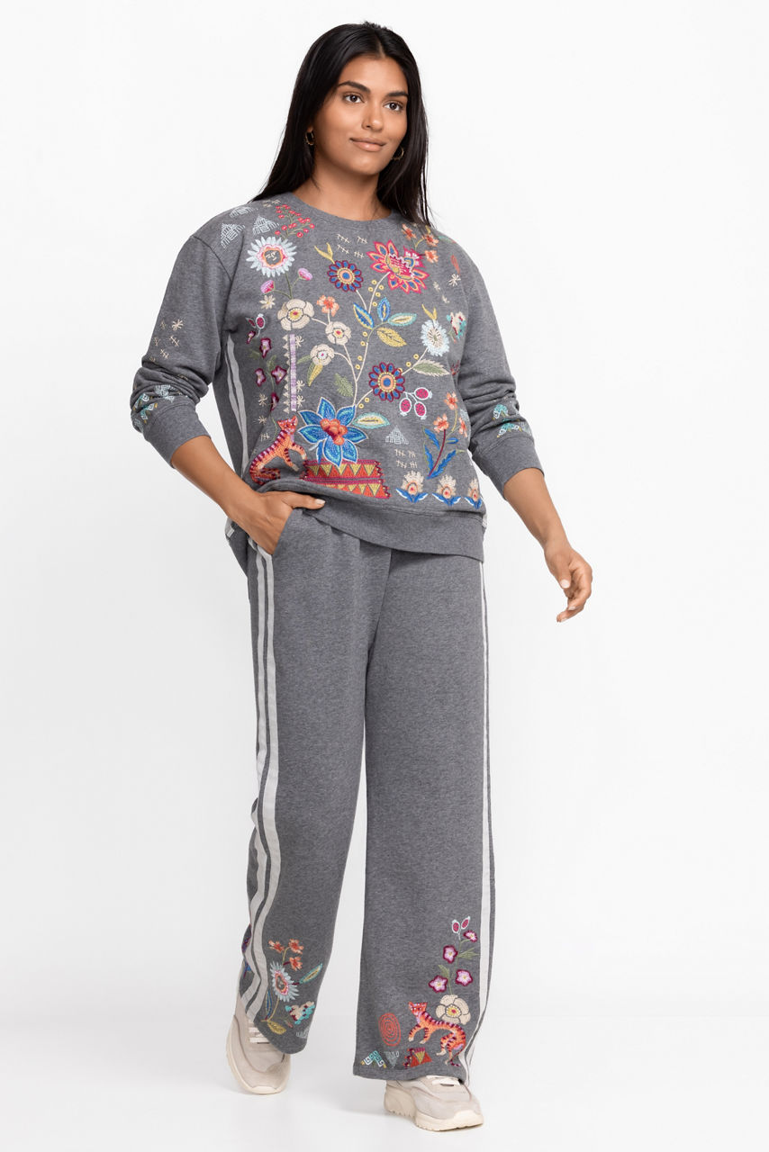 Upgrade your casual wear with the Griffin Wide Leg Ribbon Pants. These luxuriously soft sweatpants feature a relaxed fit, a tuxedo stripe ribbon at the sides, and intricate embroidery detail that adds a unique flare to a classic loungewear piece. Pair with a bold tee and sneakers for a day relaxing with family or friends.