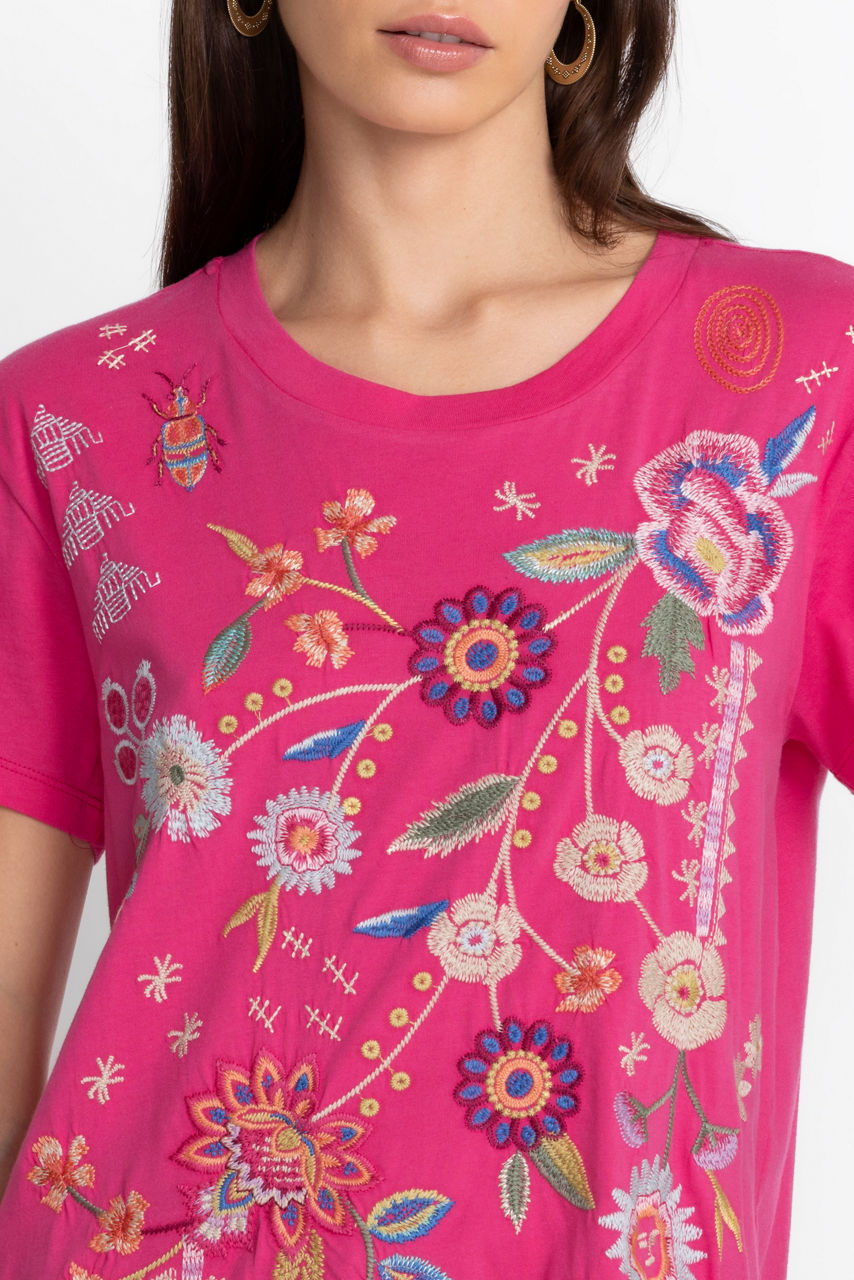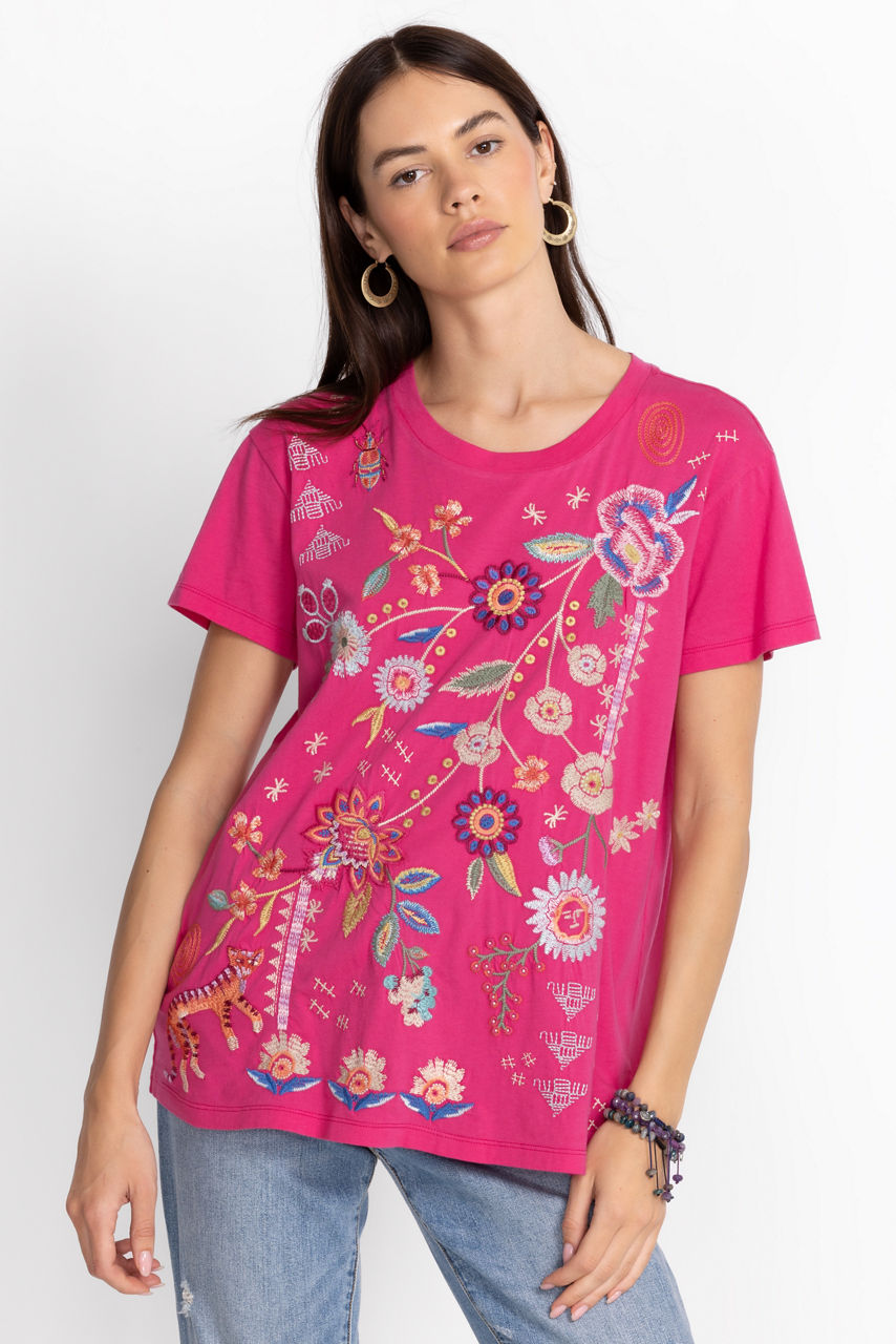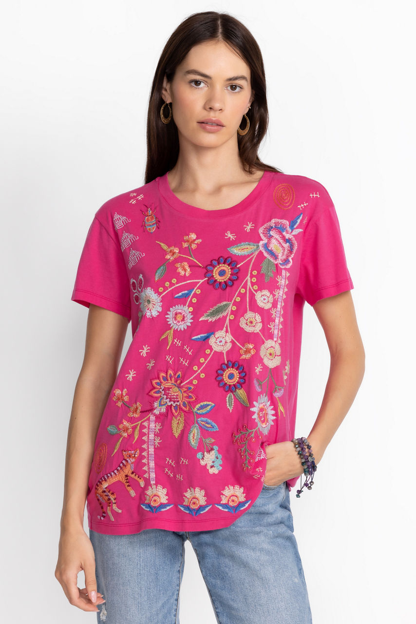 Crafted from breathable cotton, the Griffin Easy Fit Tee revamps a forever basic with joyful flowers. Adopting a hot pink colorway, this tee is cut in an easy fit and boasts a round neck, short sleeves, and a bright placement embroidery comprising freshly picked blooms. Style this tee with jeans and hoop earrings for an upbeat wear-anywhere ensemble.
