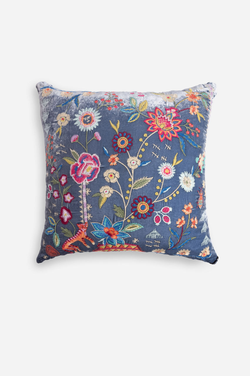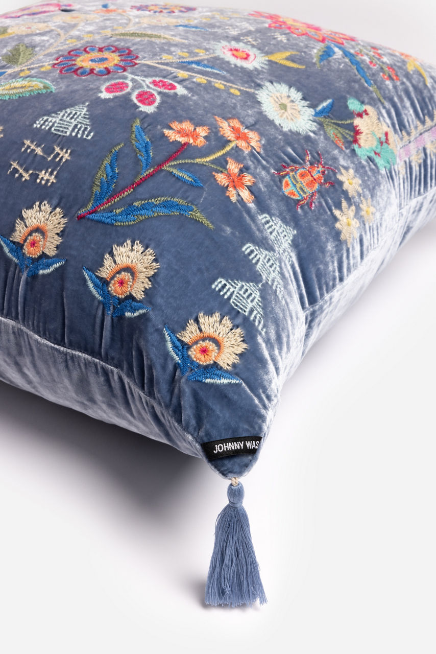 Dotted with garden fresh florals, the Griffin Embroidered Velvet Pillow introduces a statement touch to your living space. This pillow is designed from plush silk blend velvet and is characterized by a floral placement embroidery and tassels. Complete with an invisible zipper, this pillow can be used as a decorative pillow in either the bedroom or living room.