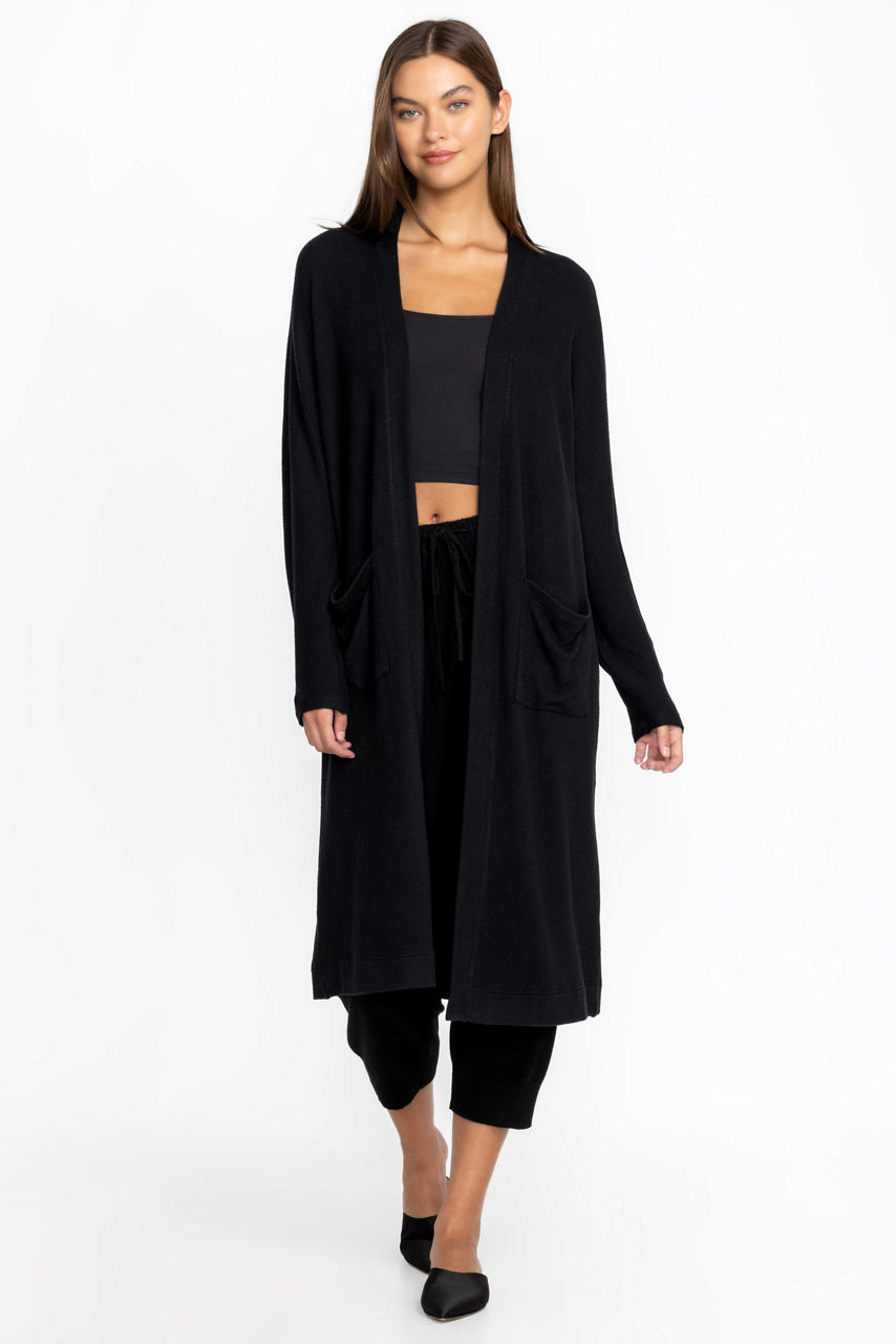 Crafted in a versatile black colorway, the Hachi Kimono with Pockets is the image of stylish minimalism. Crafted from a breathable fabric with a hint of stretch for comfort, this kimono features an open front, long sleeves, pockets, and contrast white stitching. Style this kimono over a blouse and jeans for a smart wear-anywhere look.