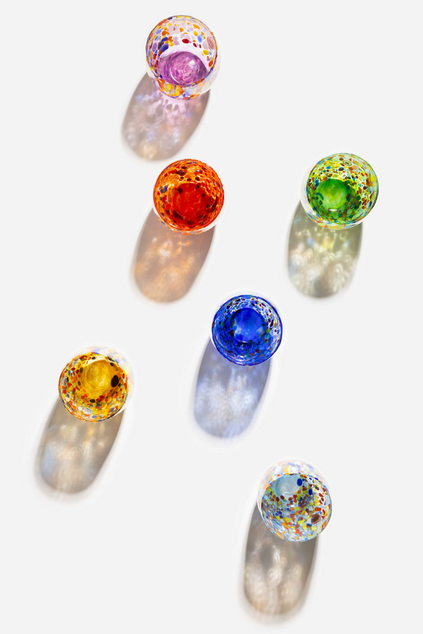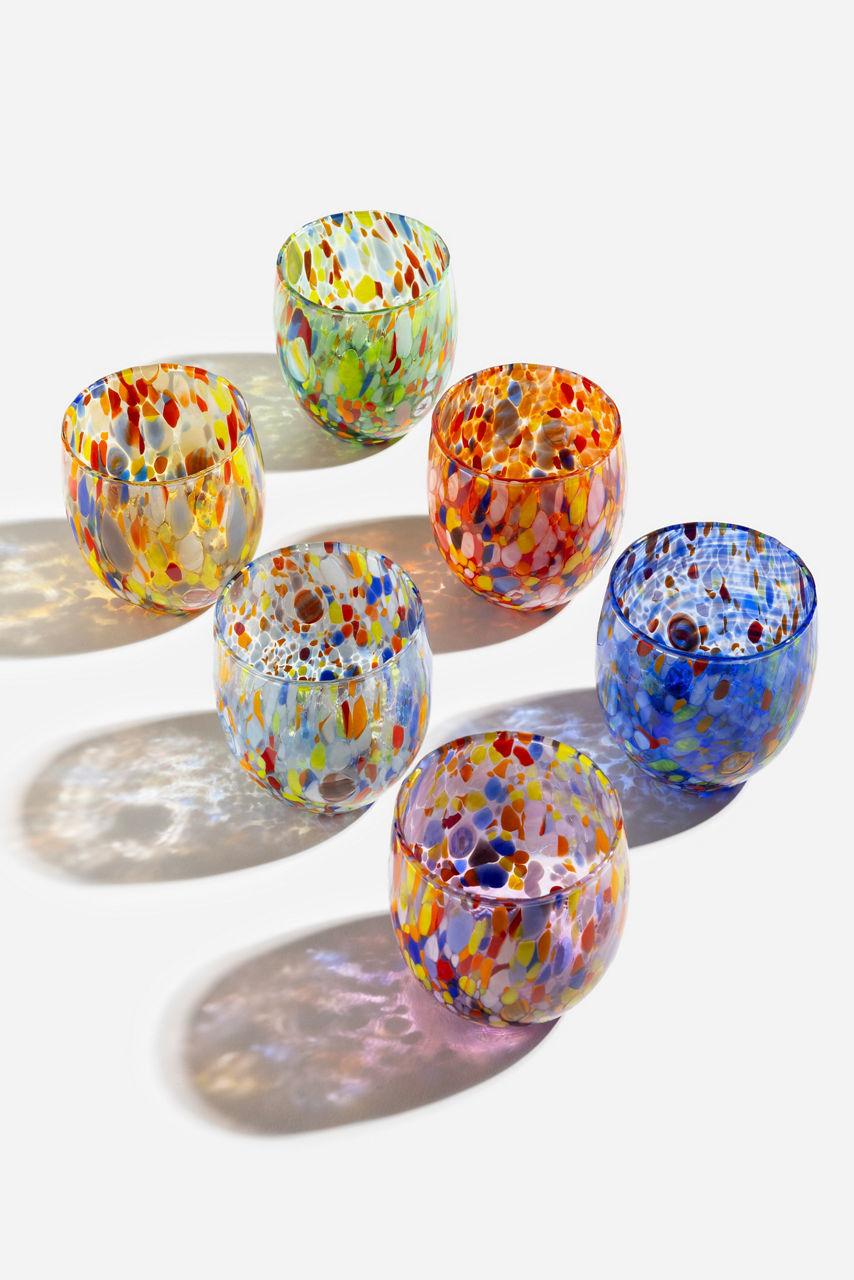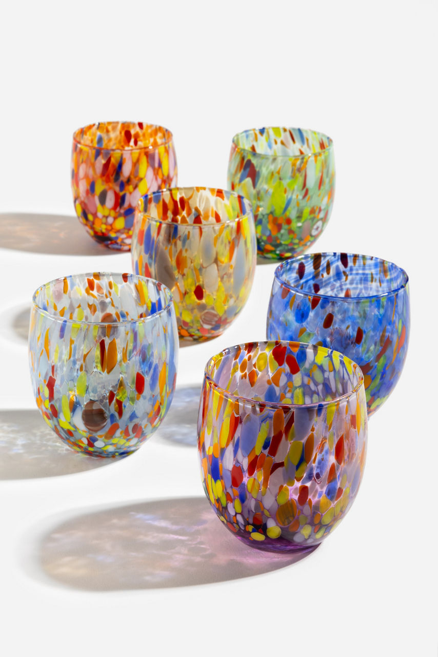 The Set of Six Hand Blown Murano Glasses have been thoughtfully crafted in vibrant colors. These 11-ounce glasses offer a stunning shape finished with a unique base that is sure to be a topic of dinner conversation. Add to your dining table and pair with neutral linens to allow these glasses to shine.
