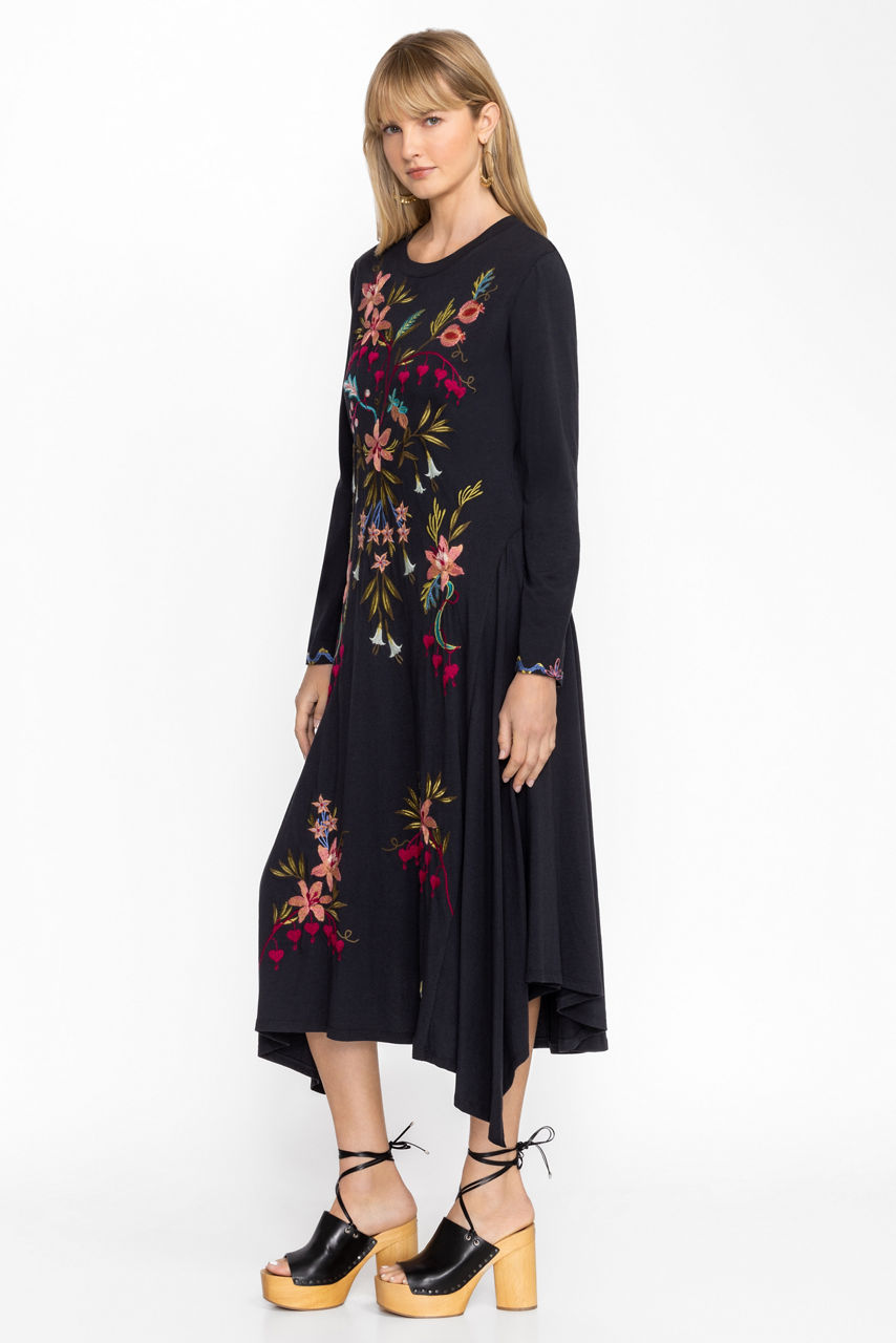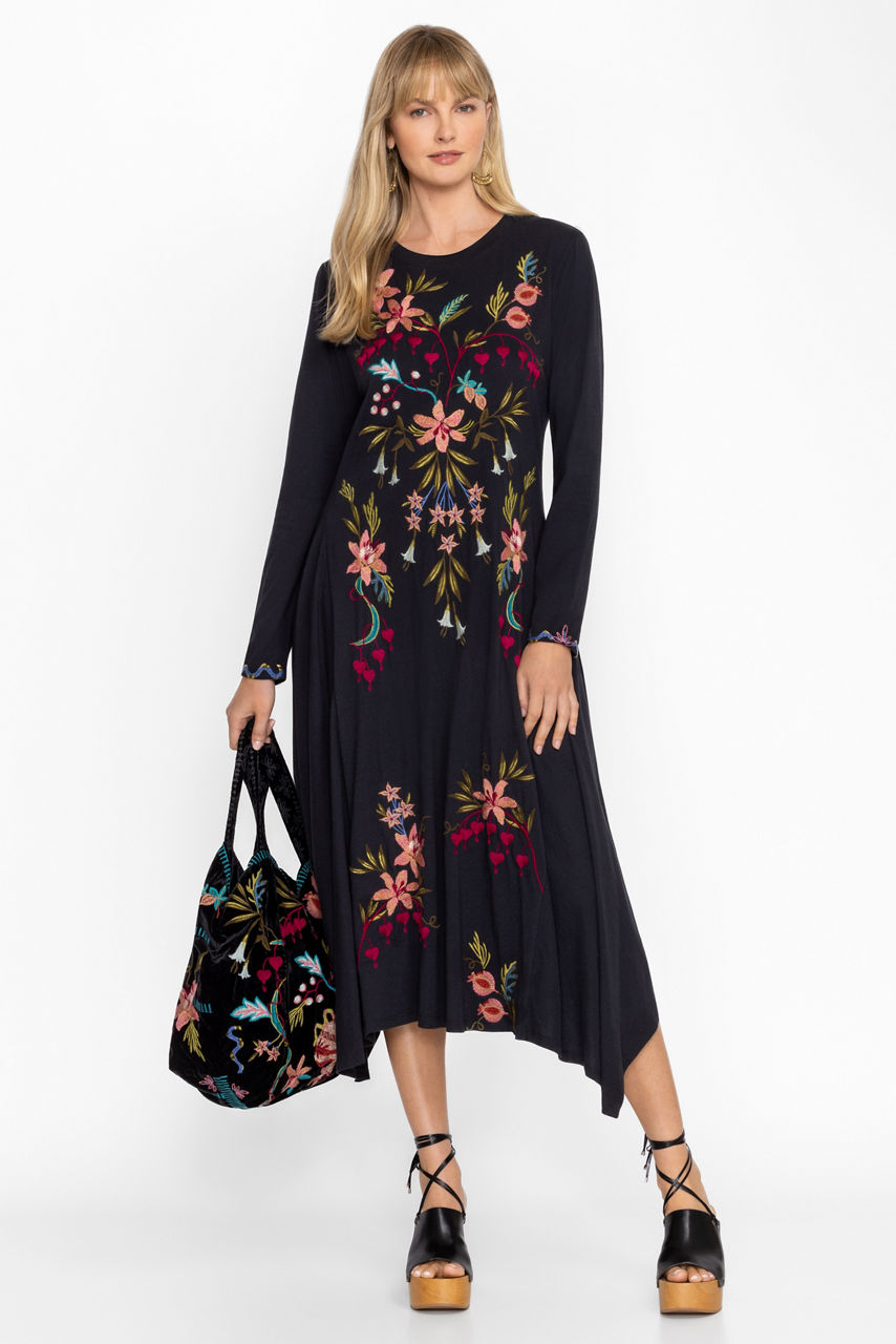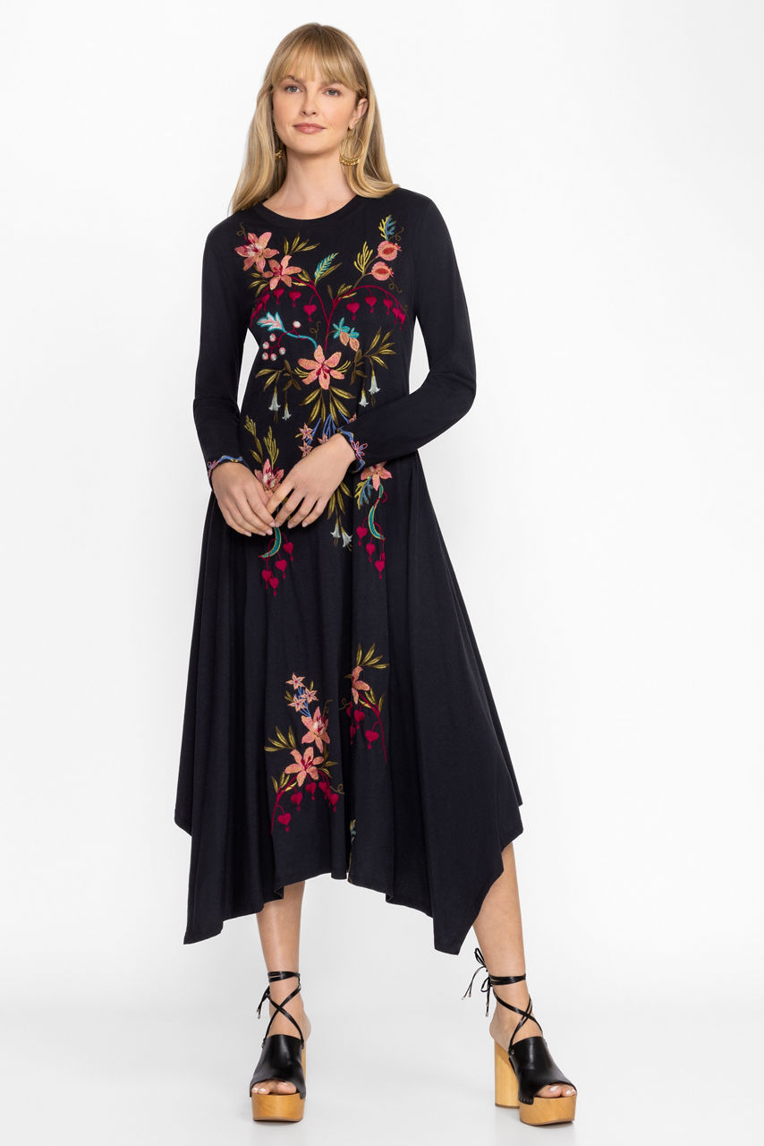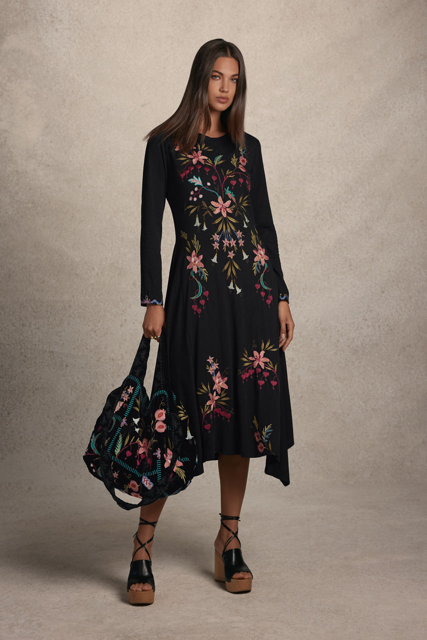 Crafted from 100% breathable cotton, the Amarylla Handkerchief Knit Dress is embellished with vibrant floral placement embroidery on a contrasting front panel. Featuring a high, rounded neckline and long sleeves, this maxi length dress is finished with an asymmetrical handkerchief hemline. Pair with leather flats and a coordinating clutch for an evening out.