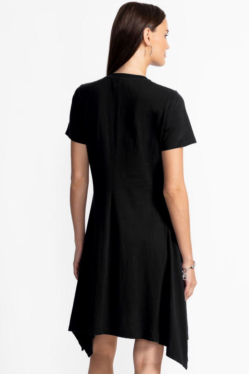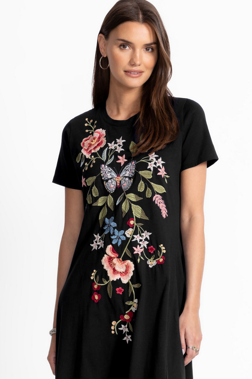 The Handkerchief Knit Dress brings effortless charm with its breezy trapeze silhouette and soft cotton knit. Intricate floral and butterfly embroidery add vibrant texture and artistry to the classic black backdrop. Finished with a handkerchief hem for playful movement, this dress is perfect for warm days and easy styling. Pair it with sandals for a relaxed yet polished look.