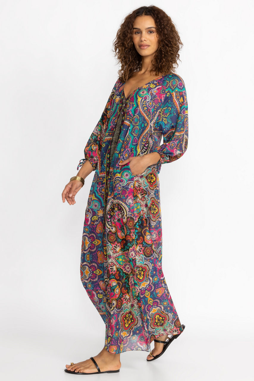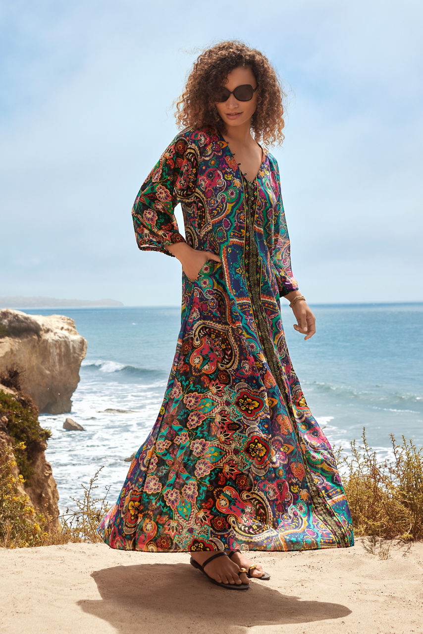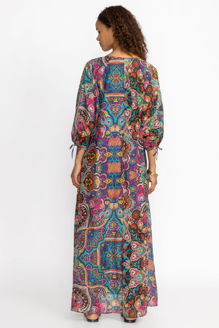 Featuring a beautiful array of color and pattern, the Hannah Long Dress delivers on style and functionality. Crafted from a luxe silk blend, this gently flowing maxi dress offers fabric covered buttons at the neckline and delicate ties at the sleeves. Pair with strappy sandals and layered jewelry for a polished casual ensemble.