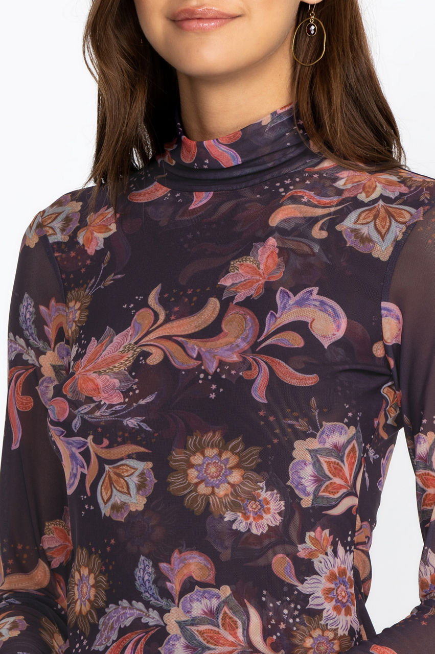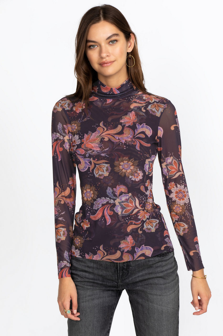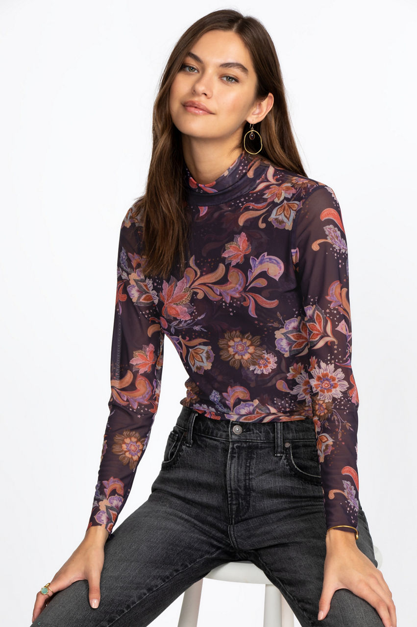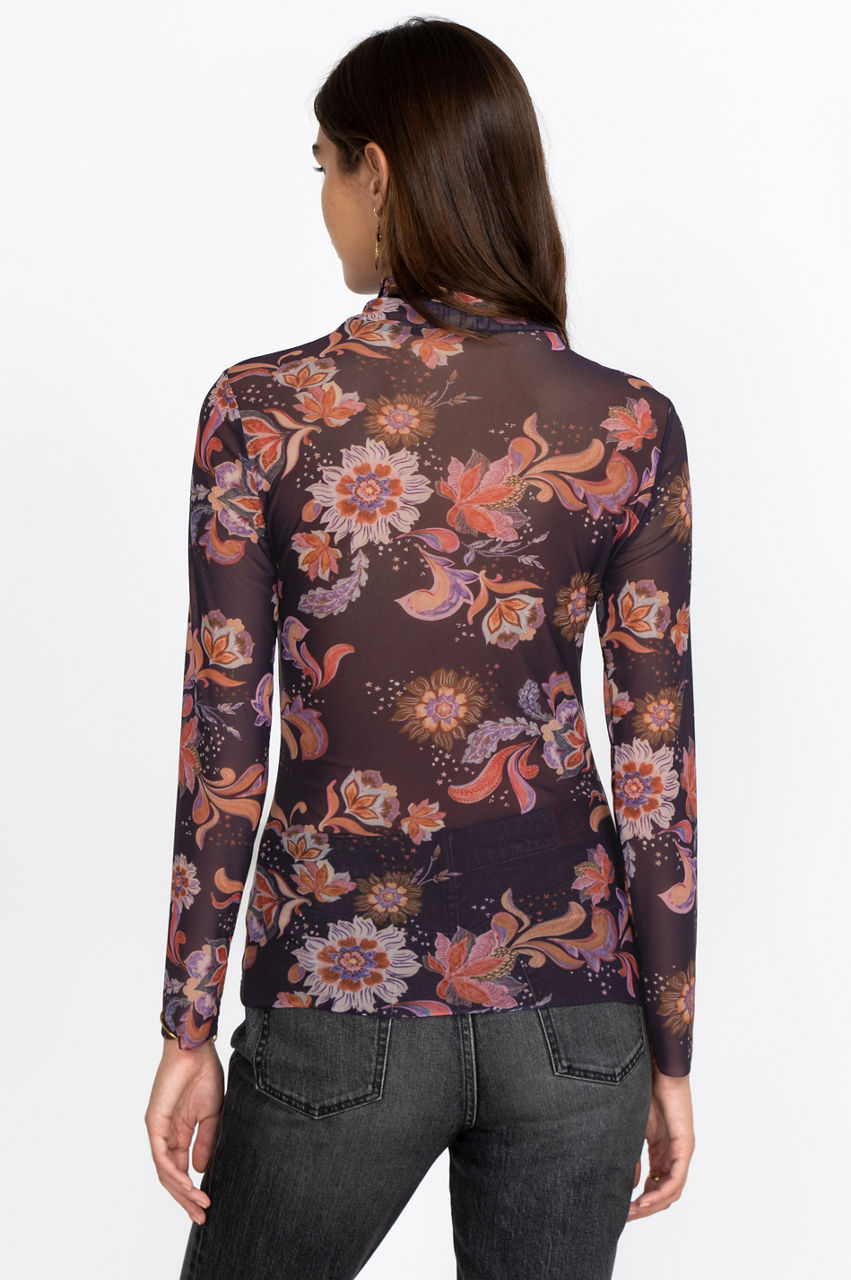 This stunning mock neck top introduces an original cut and some colorful floral motifs to your wardrobe. It' s a versatile and elegant piece that will elevate your style with its retro-inspired feel and delicate print. Have fun pairing this top with some bootcut jeans and oversized sunglasses for a unique vintage look.