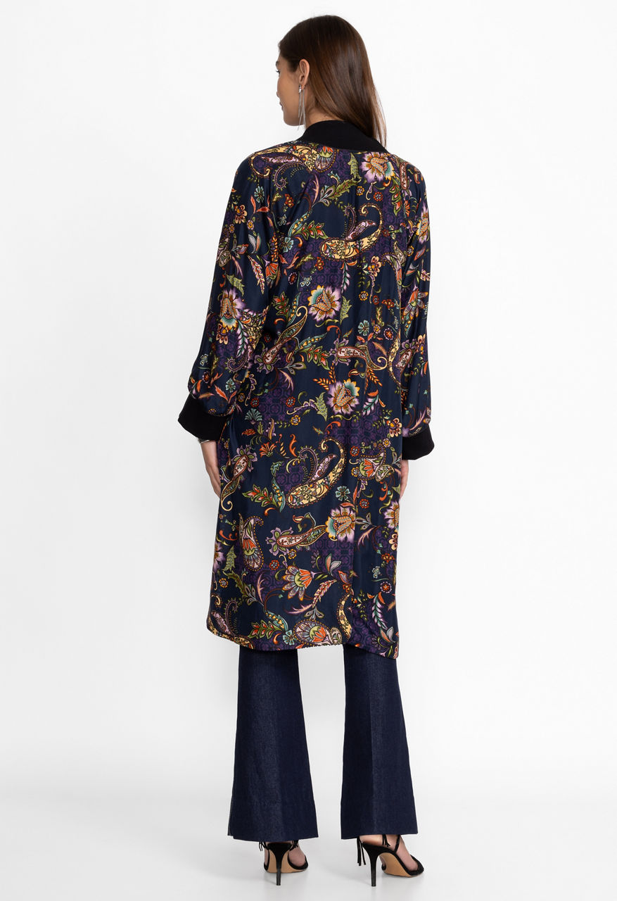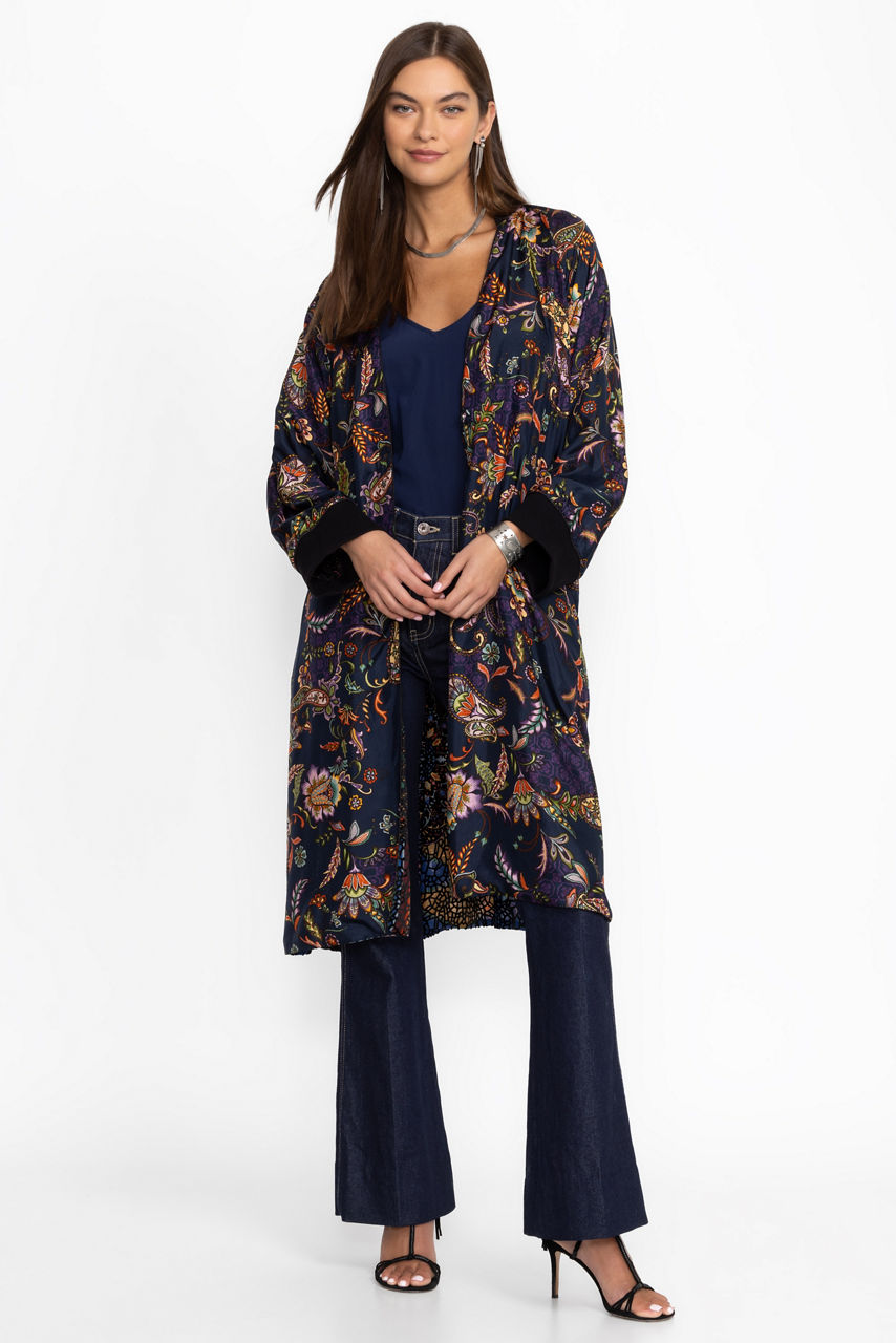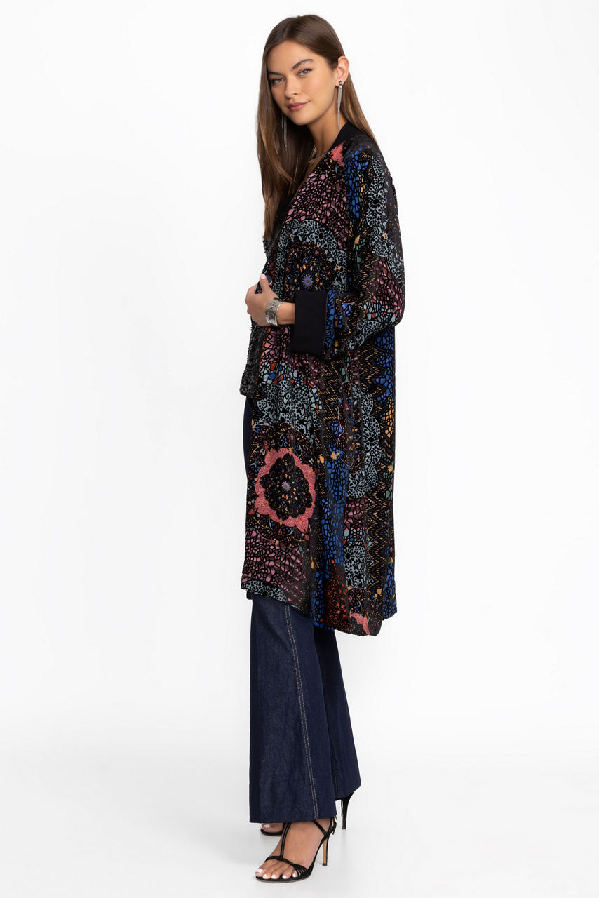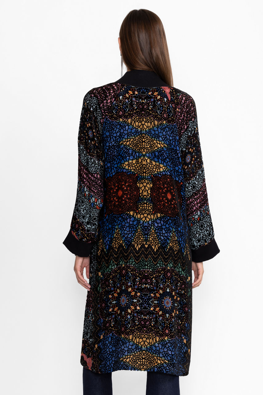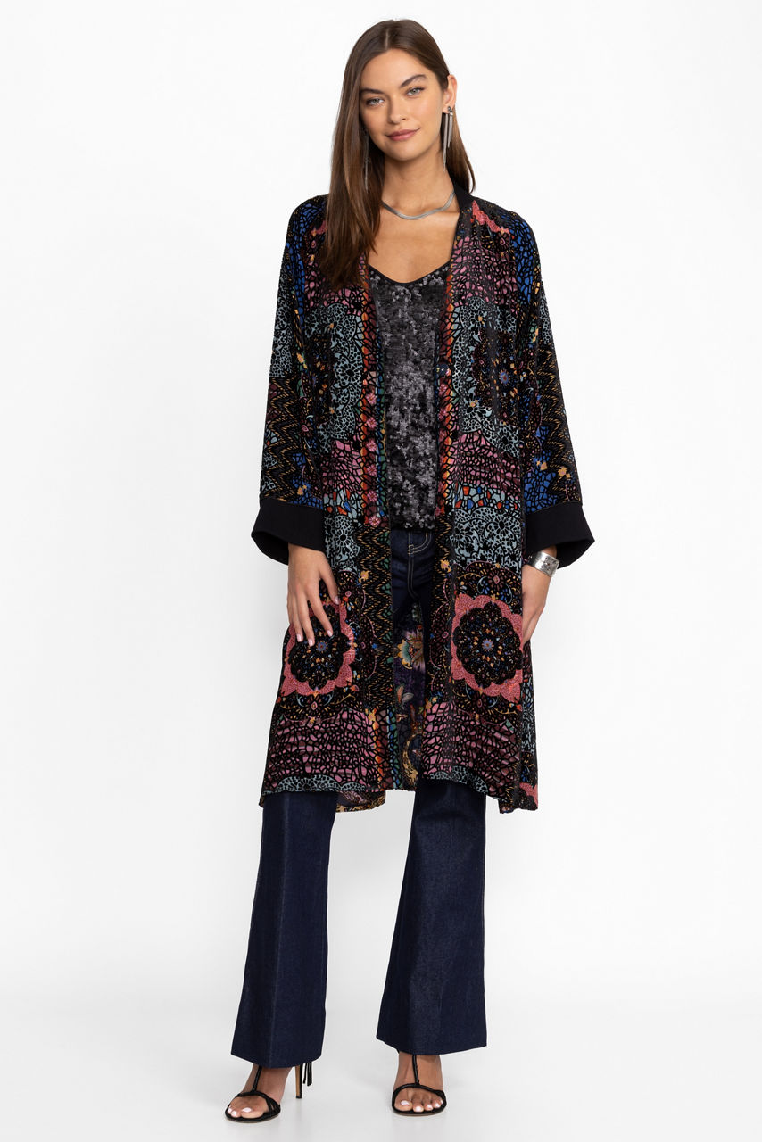 Crafted from a unique silk blend, the Harmony Burnout Kimono is adorned with a vibrant patchwork pattern. Featuring a V-neckline and gently puffed sleeves, this full-length kimono is finished with a snap closure front and pockets along the side seams. Layer over leggings and a lightweight cami top for an elevated casual look.